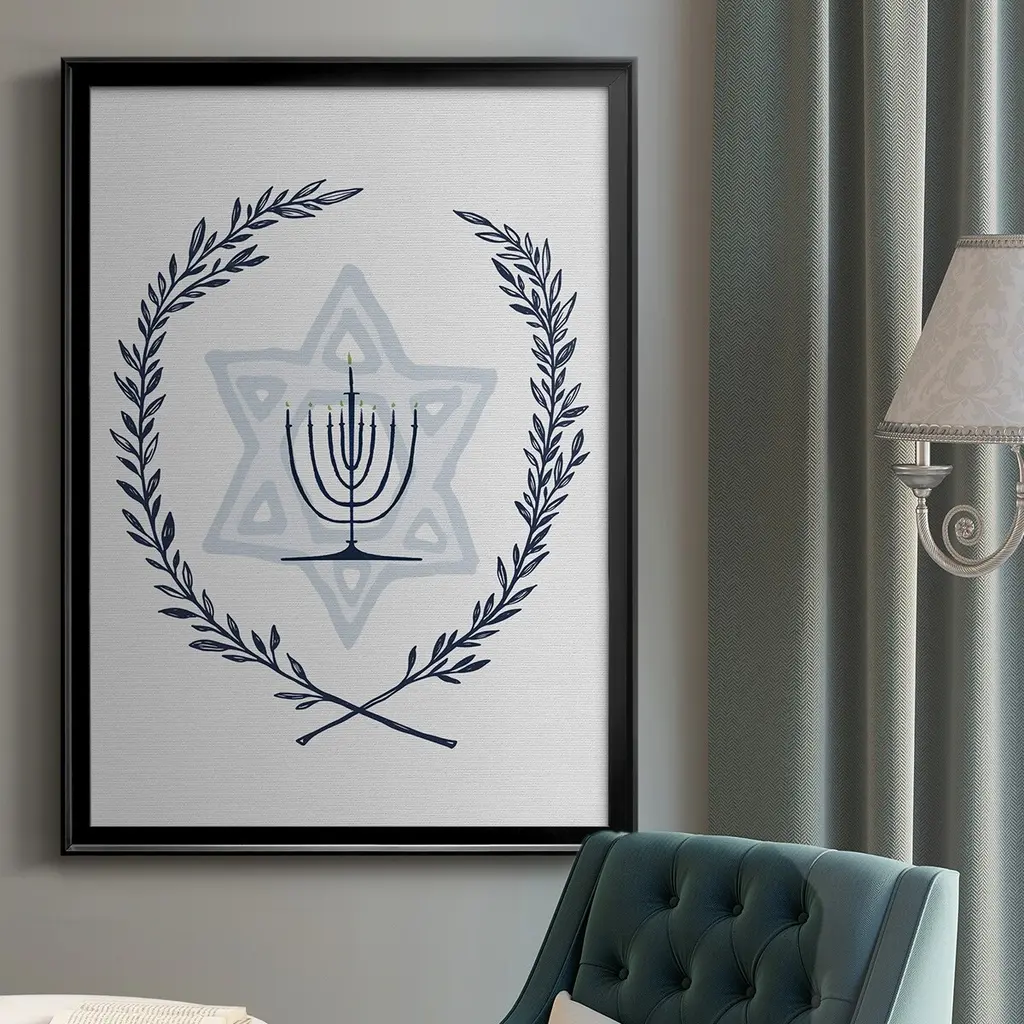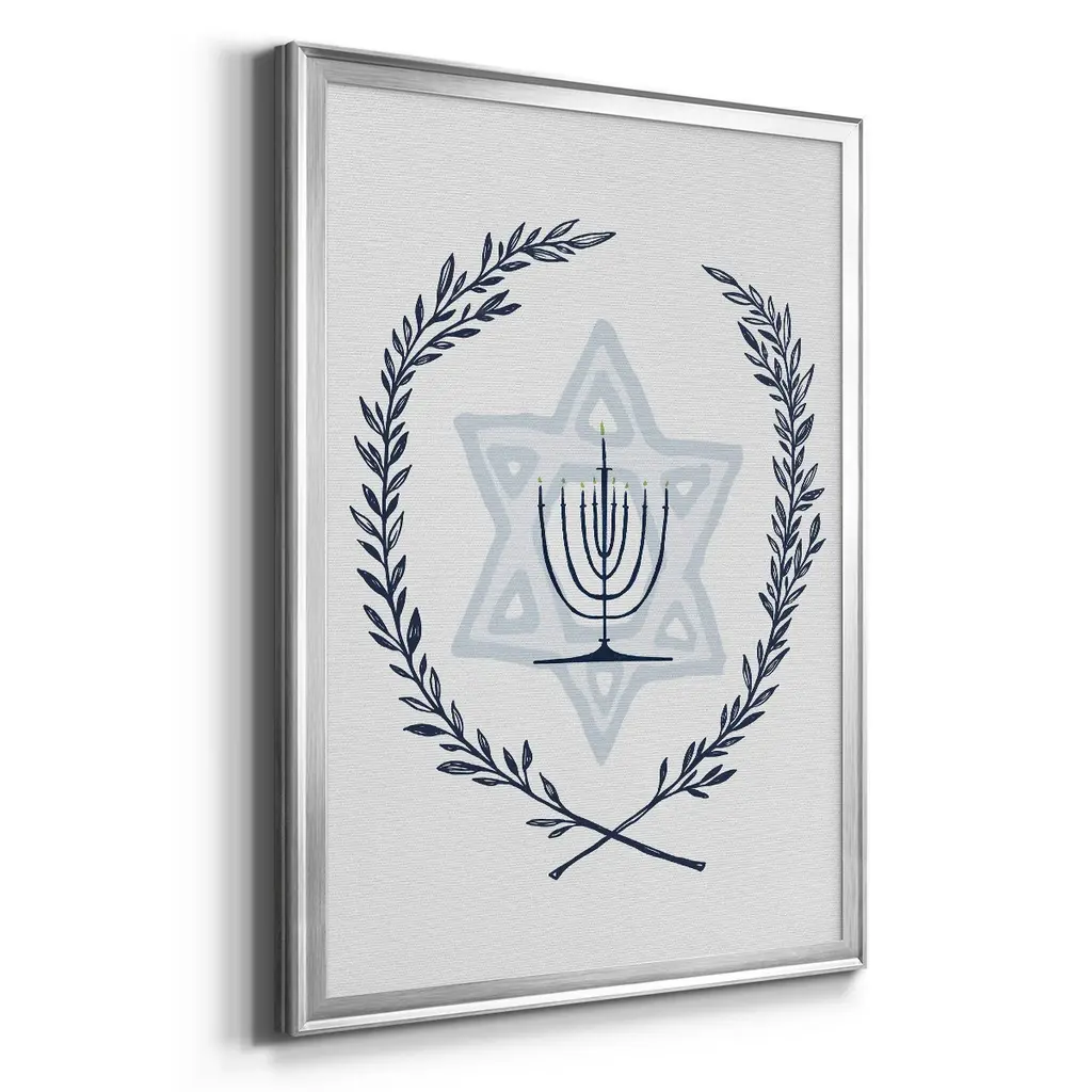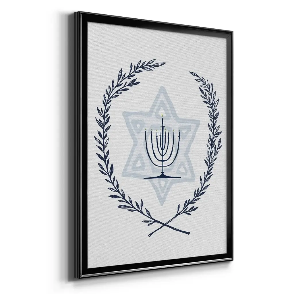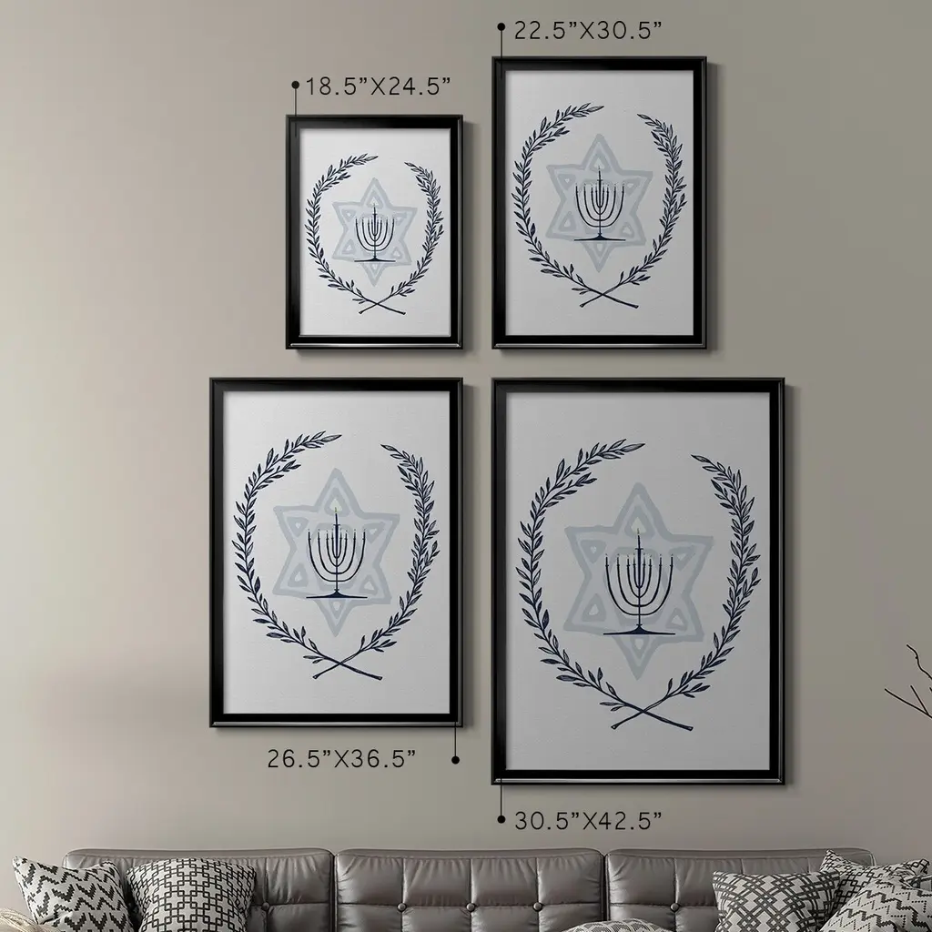 Happy Hanukkah I Premium Framed Print - Ready to Hang A Premium Framed Print created to last. Framed in distressed wood and available in an array of sizes and colors Featuring a beveled a solid wood stretcher bar, each piece comes ready to hand 4 SIZES AVAILABLE 30.5''X42.5'' - Overall Size 26.5'X36.5'' - Overall Size 22.5''x30.5'' - Overall Size 18.5''x24.5'' - Overall Size Each piece is made to order. Each piece comes with hanging hardware. Made in the USA Ready to Hang