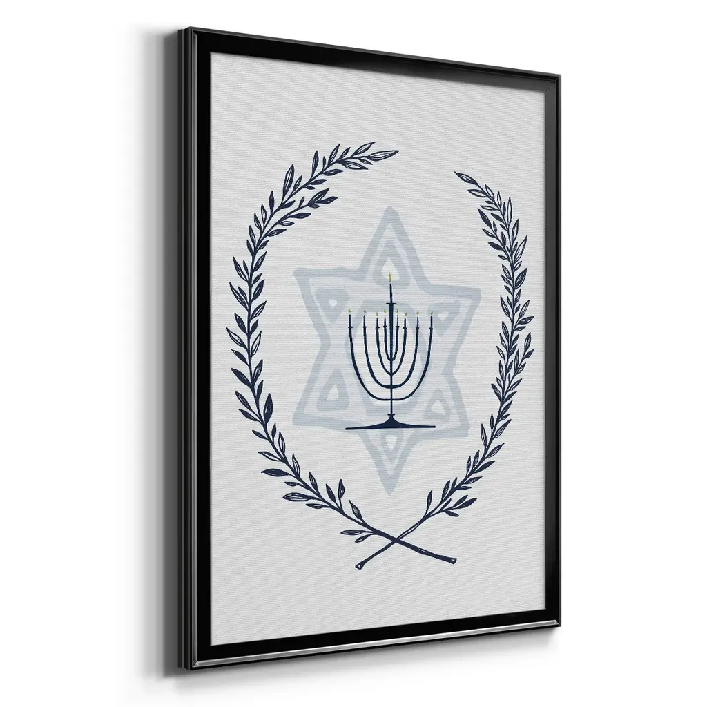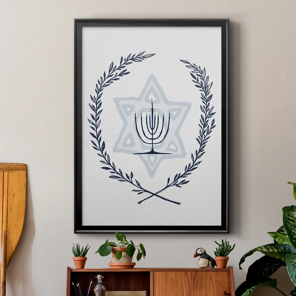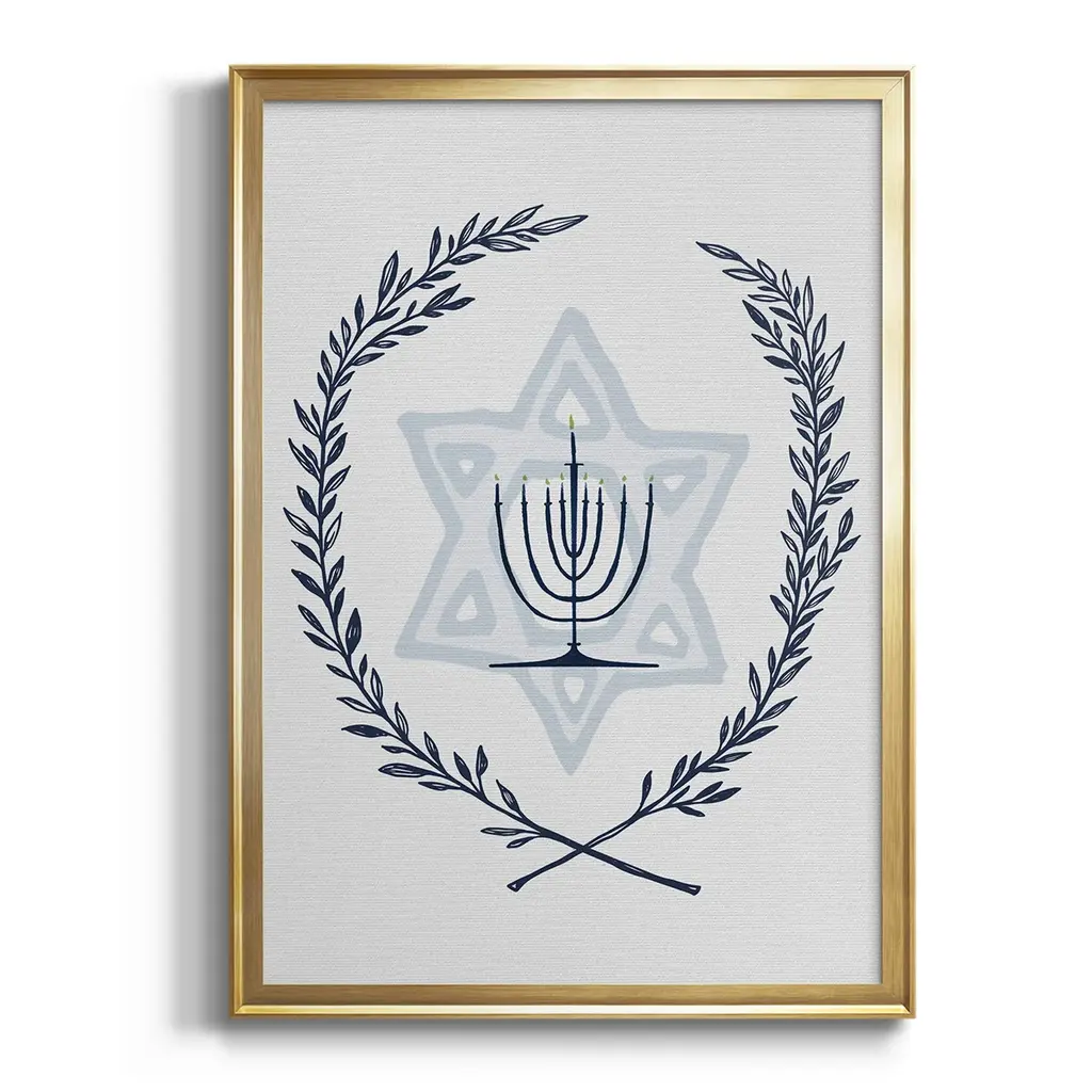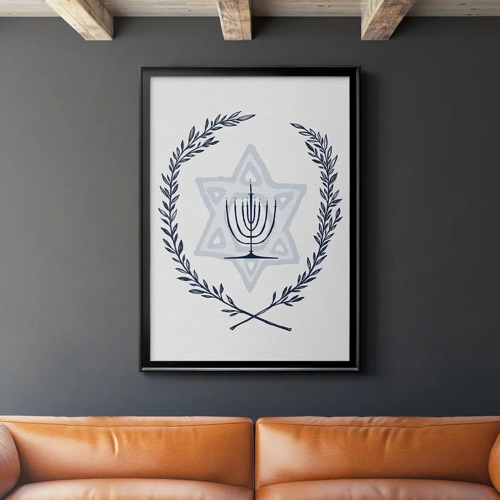 Happy Hanukkah I Premium Framed Print - Ready to Hang A Premium Framed Print created to last. Framed in distressed wood and available in an array of sizes and colors Featuring a beveled a solid wood stretcher bar, each piece comes ready to hand 4 SIZES AVAILABLE 30.5''X42.5'' - Overall Size 26.5'X36.5'' - Overall Size 22.5''x30.5'' - Overall Size 18.5''x24.5'' - Overall Size Each piece is made to order. Each piece comes with hanging hardware. Made in the USA Ready to Hang