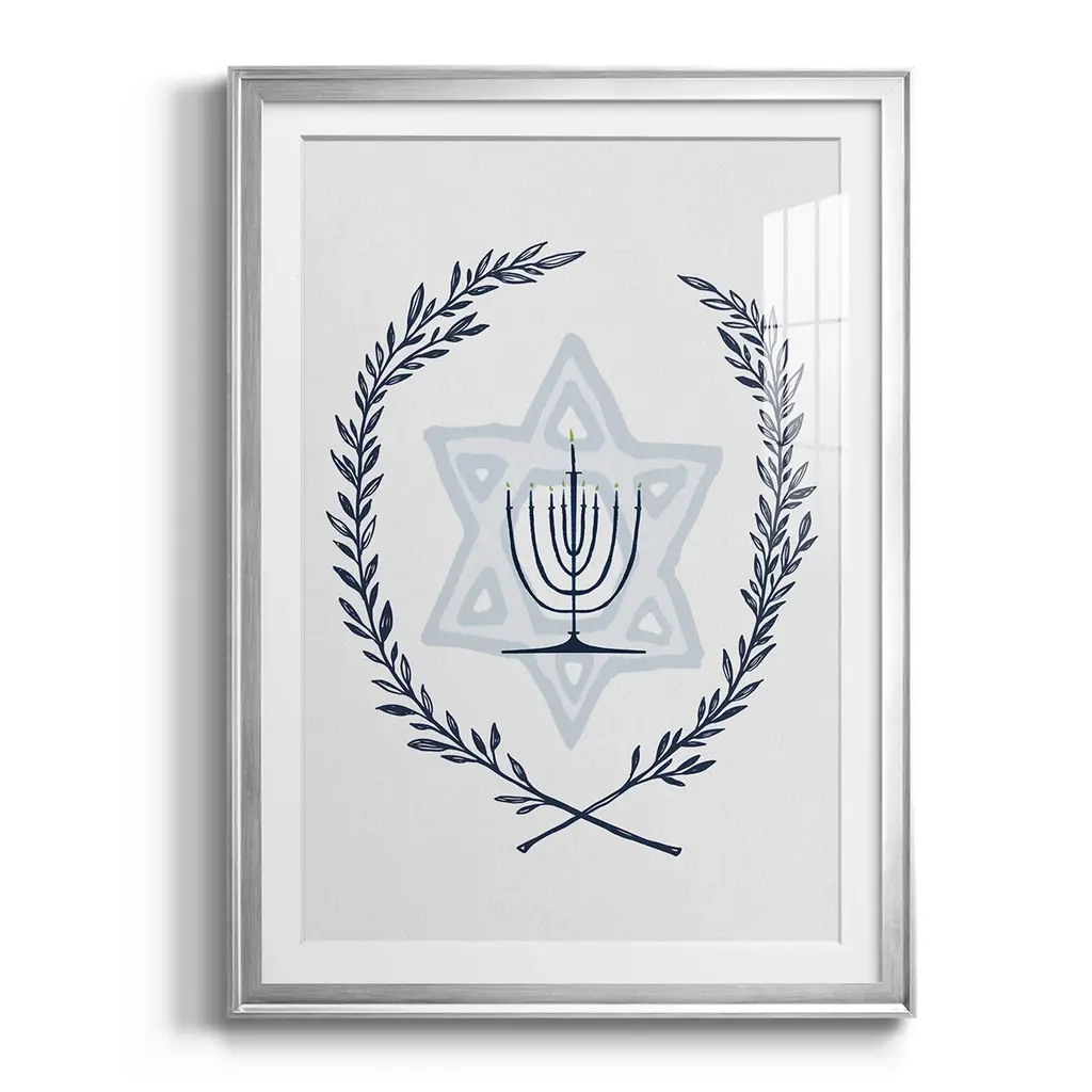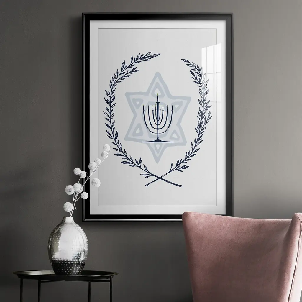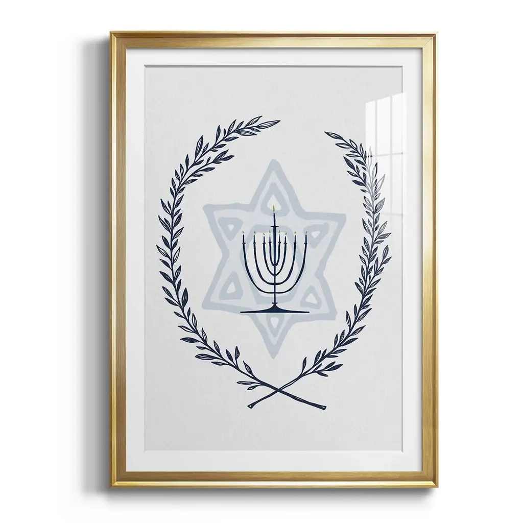 Happy Hanukkah I Premium Framed Print - Ready to Hang A Premium Framed Print created to last. Framed in distressed wood and available in an array of sizes and colors Featuring a beveled a solid wood stretcher bar, each piece comes ready to hand 4 SIZES AVAILABLE 30.5''X42.5'' - Overall Size 26.5'X36.5'' - Overall Size 22.5''x30.5'' - Overall Size 18.5''x24.5'' - Overall Size Each piece is made to order. Each piece comes with hanging hardware. Made in the USA Ready to Hang Giclee Paper Print Acrylic Glass Beveled Matt Board