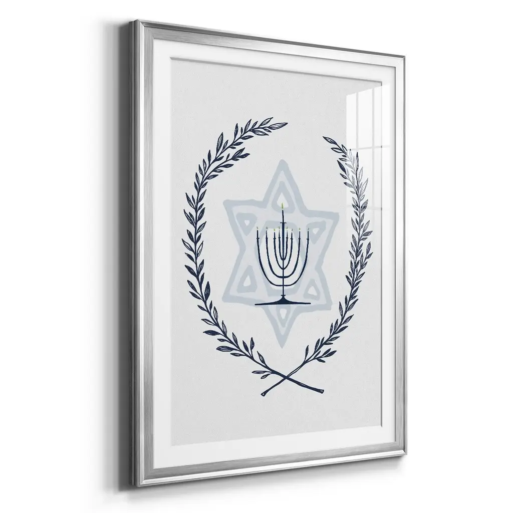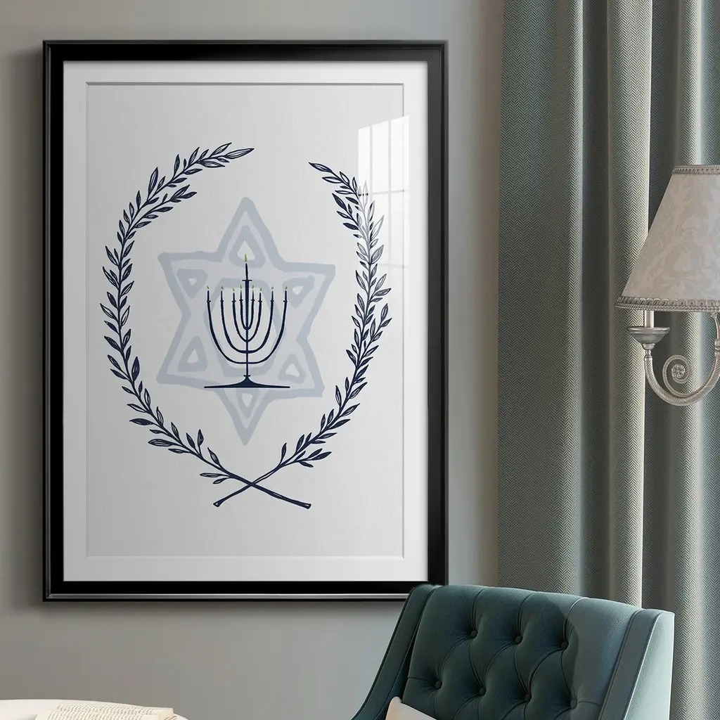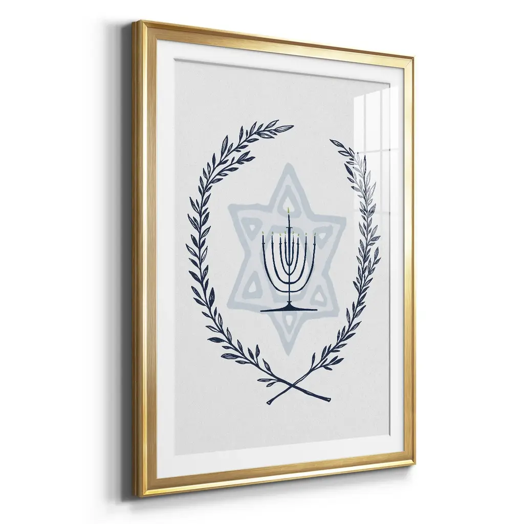 Happy Hanukkah I Premium Framed Print - Ready to Hang A Premium Framed Print created to last. Framed in distressed wood and available in an array of sizes and colors Featuring a beveled a solid wood stretcher bar, each piece comes ready to hand 4 SIZES AVAILABLE 30.5''X42.5'' - Overall Size 26.5'X36.5'' - Overall Size 22.5''x30.5'' - Overall Size 18.5''x24.5'' - Overall Size Each piece is made to order. Each piece comes with hanging hardware. Made in the USA Ready to Hang Giclee Paper Print Acrylic Glass Beveled Matt Board