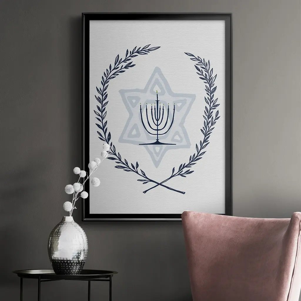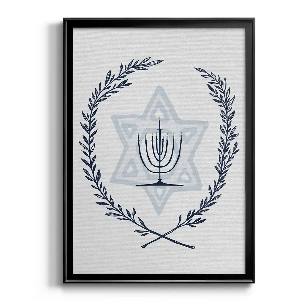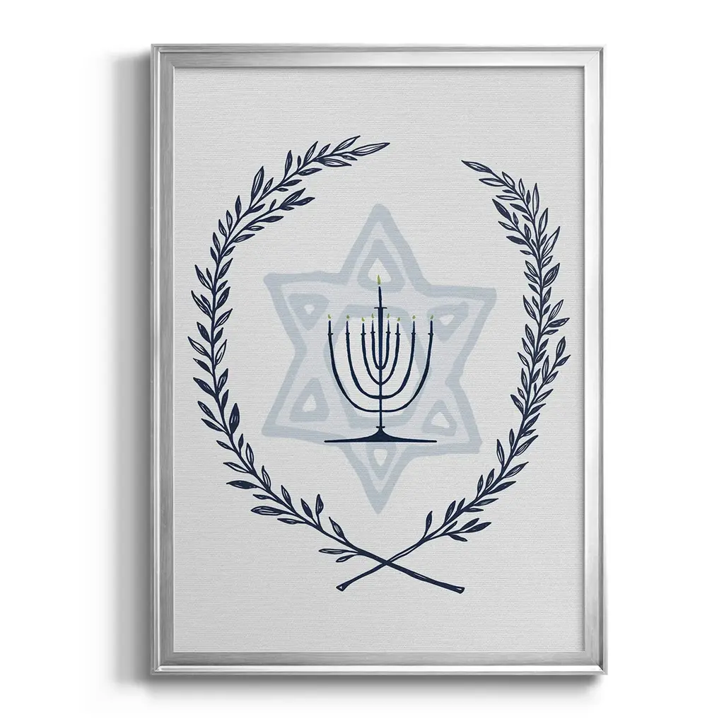 Happy Hanukkah I Premium Framed Print - Ready to Hang A Premium Framed Print created to last. Framed in distressed wood and available in an array of sizes and colors Featuring a beveled a solid wood stretcher bar, each piece comes ready to hand 4 SIZES AVAILABLE 30.5''X42.5'' - Overall Size 26.5'X36.5'' - Overall Size 22.5''x30.5'' - Overall Size 18.5''x24.5'' - Overall Size Each piece is made to order. Each piece comes with hanging hardware. Made in the USA Ready to Hang
