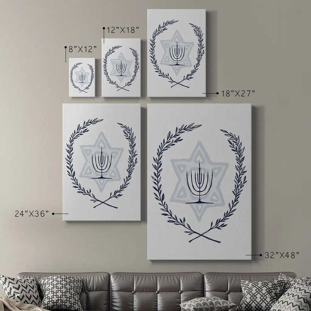 Happy Hanukkah I Premium Gallery Wrapped Canvas - Ready to Hang A premium hand stretched gallery wrapped canvas print created to last. Featuring a beveled a solid wood stretcher bar, each piece comes ready to hand 6 SIZES AVAILABLE 8''X12'' - Overall Size 12''X18'' - Overall Size 18''X27'' - Overall Size 24''x36'' - Overall Size 32''x48'' - Overall Size 40''x60'' - Overall Size Each piece is made to order. Built to Last Each piece comes ready to hang Solid wood stretcher Fade and Water resistant Made domestically