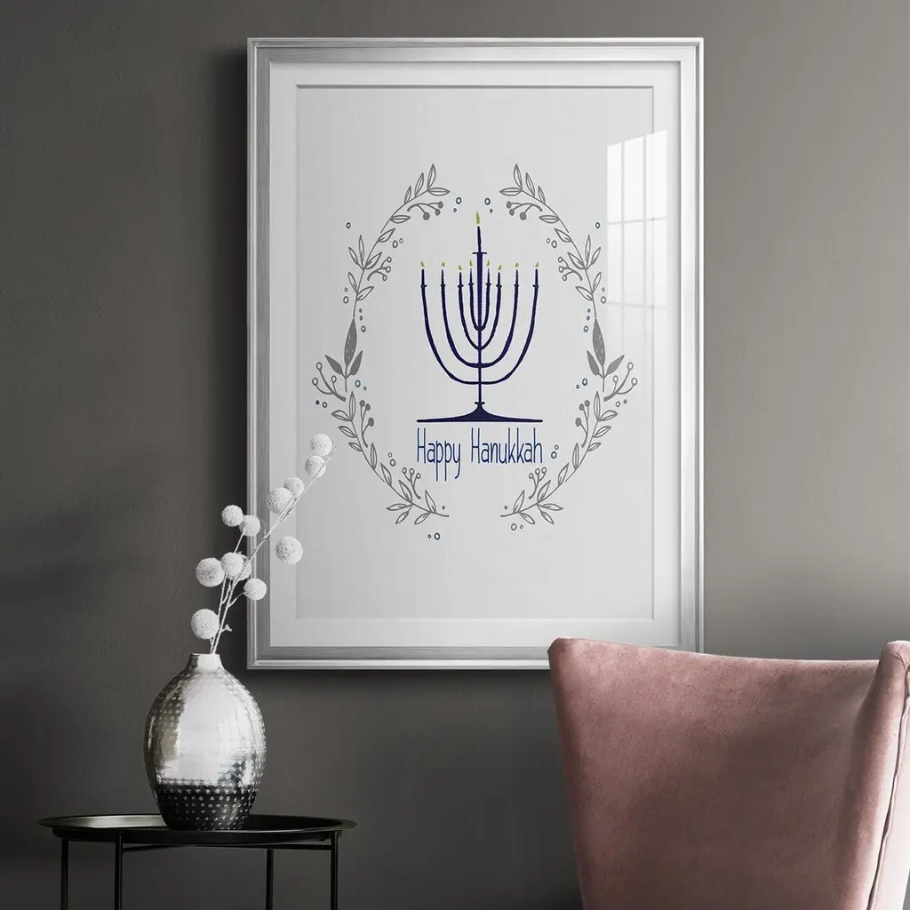 Happy Hanukkah II Premium Framed Print - Ready to Hang A Premium Framed Print created to last. Framed in distressed wood and available in an array of sizes and colors Featuring a beveled a solid wood stretcher bar, each piece comes ready to hand 4 SIZES AVAILABLE 30.5''X42.5'' - Overall Size 26.5'X36.5'' - Overall Size 22.5''x30.5'' - Overall Size 18.5''x24.5'' - Overall Size Each piece is made to order. Each piece comes with hanging hardware. Made in the USA Ready to Hang Giclee Paper Print Acrylic Glass Beveled Matt Board