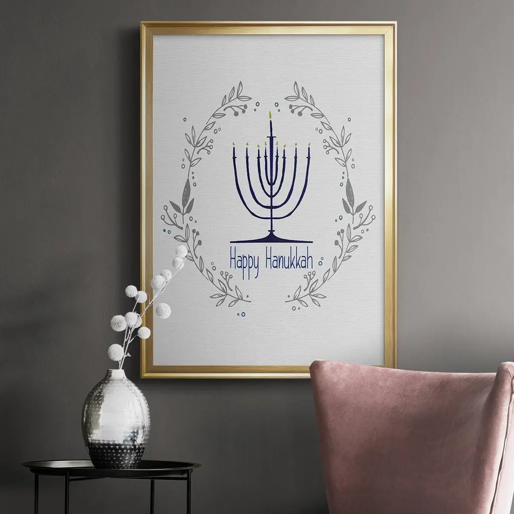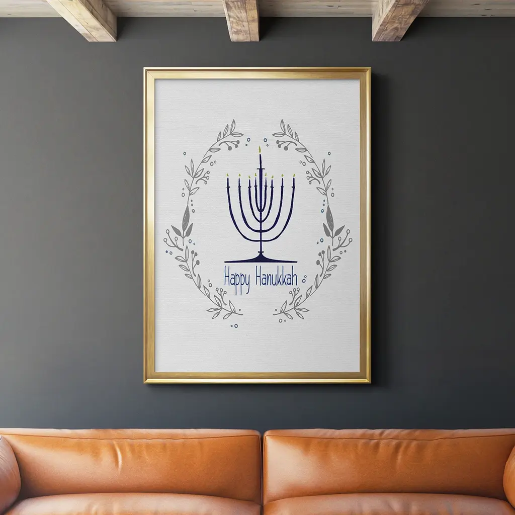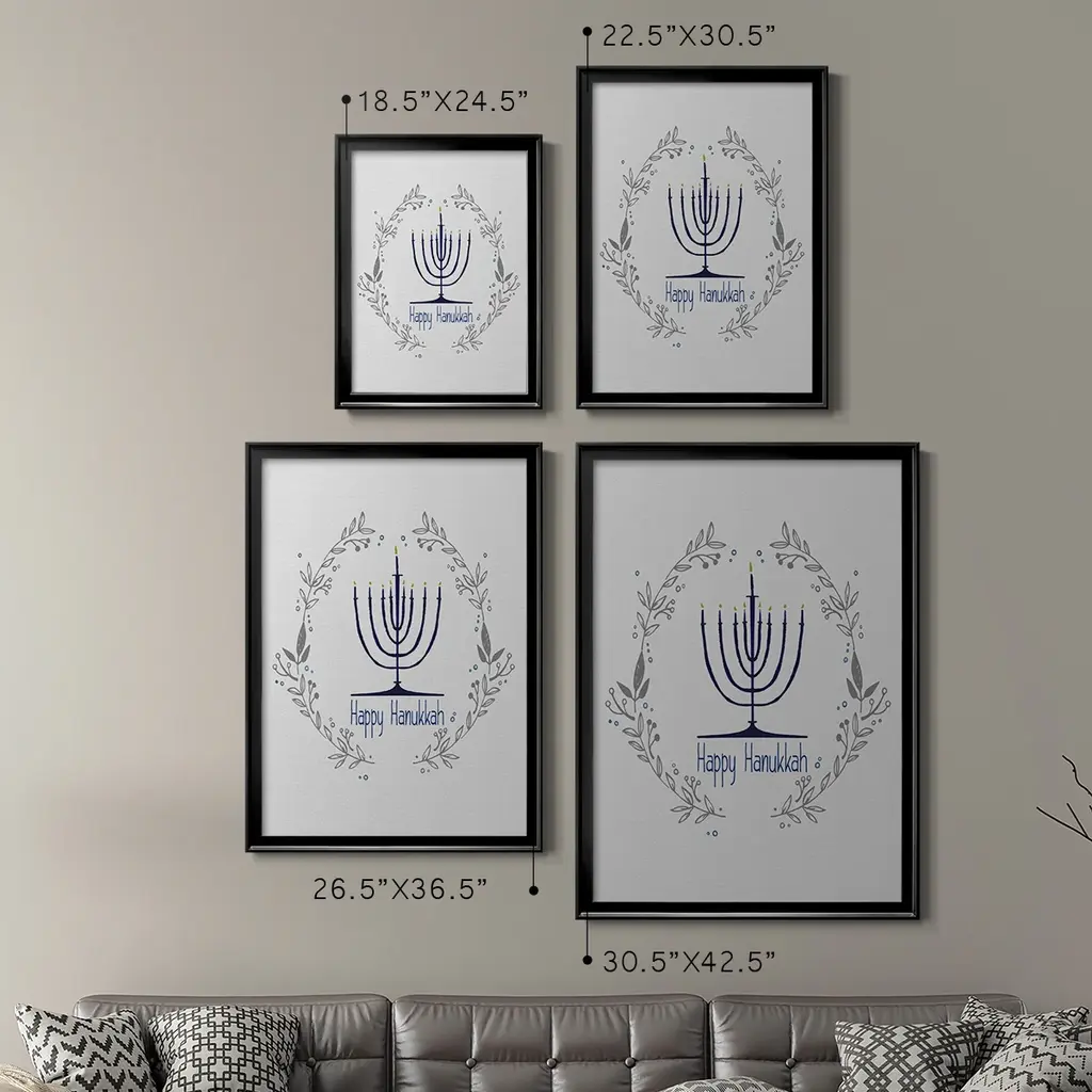 Happy Hanukkah II Premium Framed Print - Ready to Hang A Premium Framed Print created to last. Framed in distressed wood and available in an array of sizes and colors Featuring a beveled a solid wood stretcher bar, each piece comes ready to hand 4 SIZES AVAILABLE 30.5''X42.5'' - Overall Size 26.5'X36.5'' - Overall Size 22.5''x30.5'' - Overall Size 18.5''x24.5'' - Overall Size Each piece is made to order. Each piece comes with hanging hardware. Made in the USA Ready to Hang