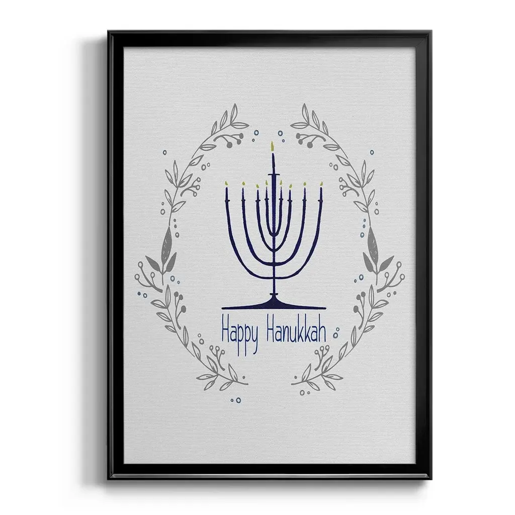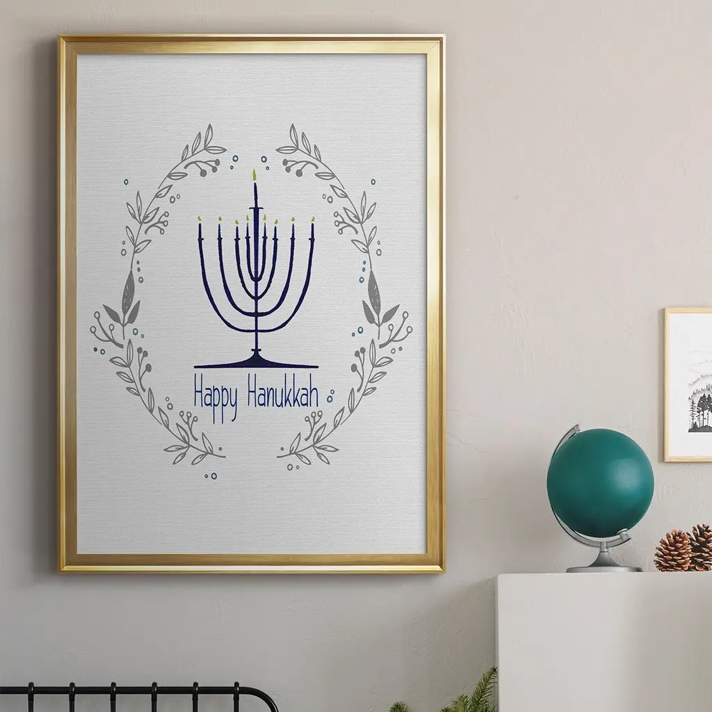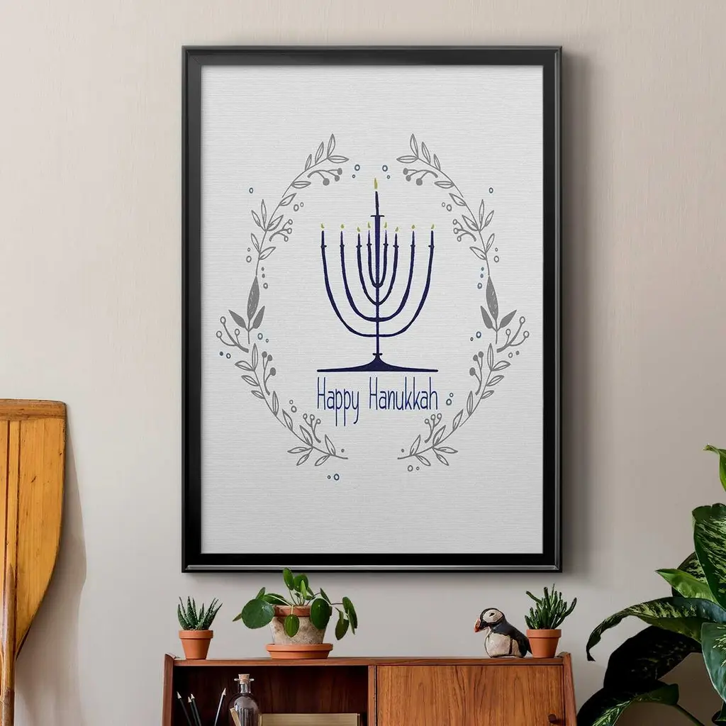Happy Hanukkah II Premium Framed Print - Ready to Hang A Premium Framed Print created to last. Framed in distressed wood and available in an array of sizes and colors Featuring a beveled a solid wood stretcher bar, each piece comes ready to hand 4 SIZES AVAILABLE 30.5''X42.5'' - Overall Size 26.5'X36.5'' - Overall Size 22.5''x30.5'' - Overall Size 18.5''x24.5'' - Overall Size Each piece is made to order. Each piece comes with hanging hardware. Made in the USA Ready to Hang