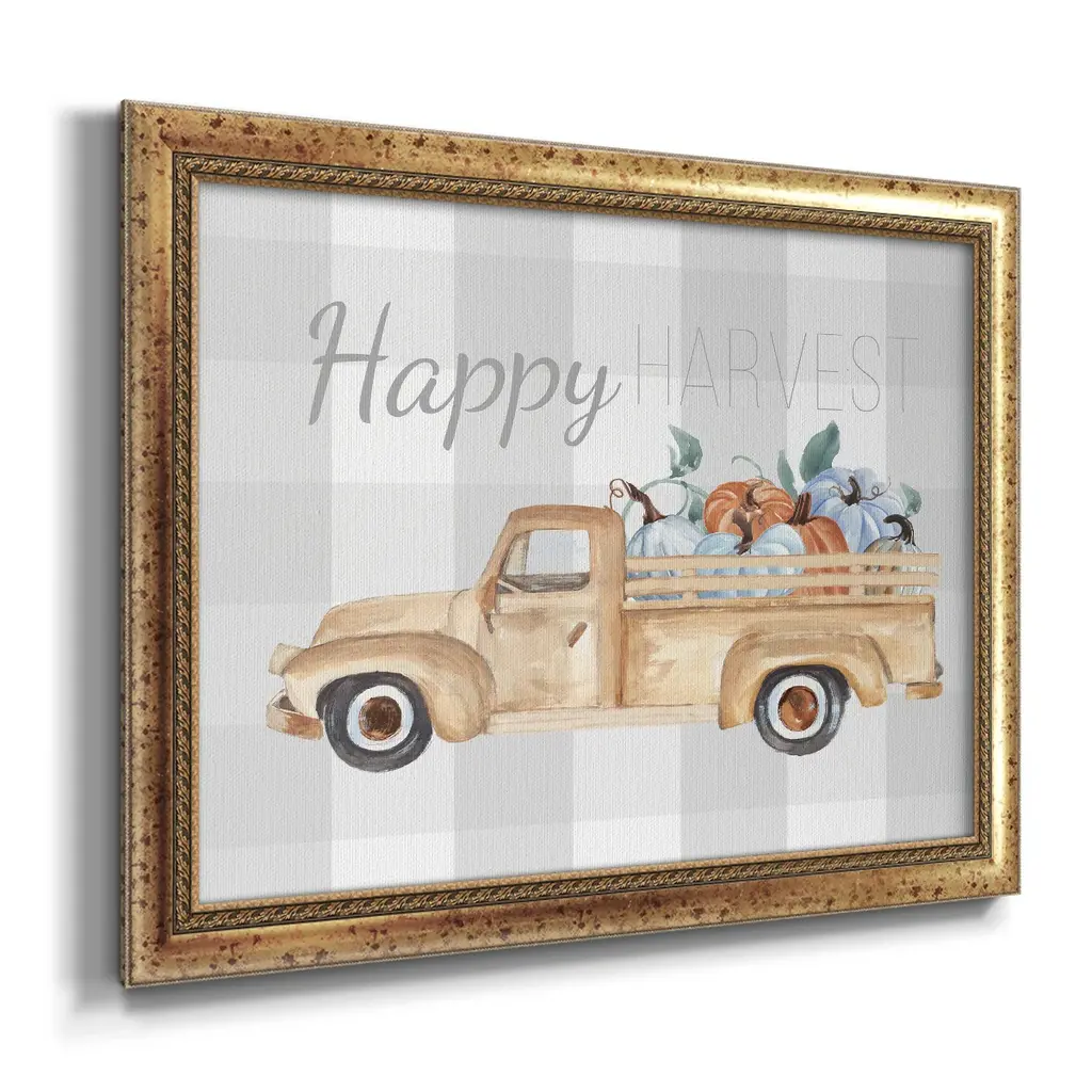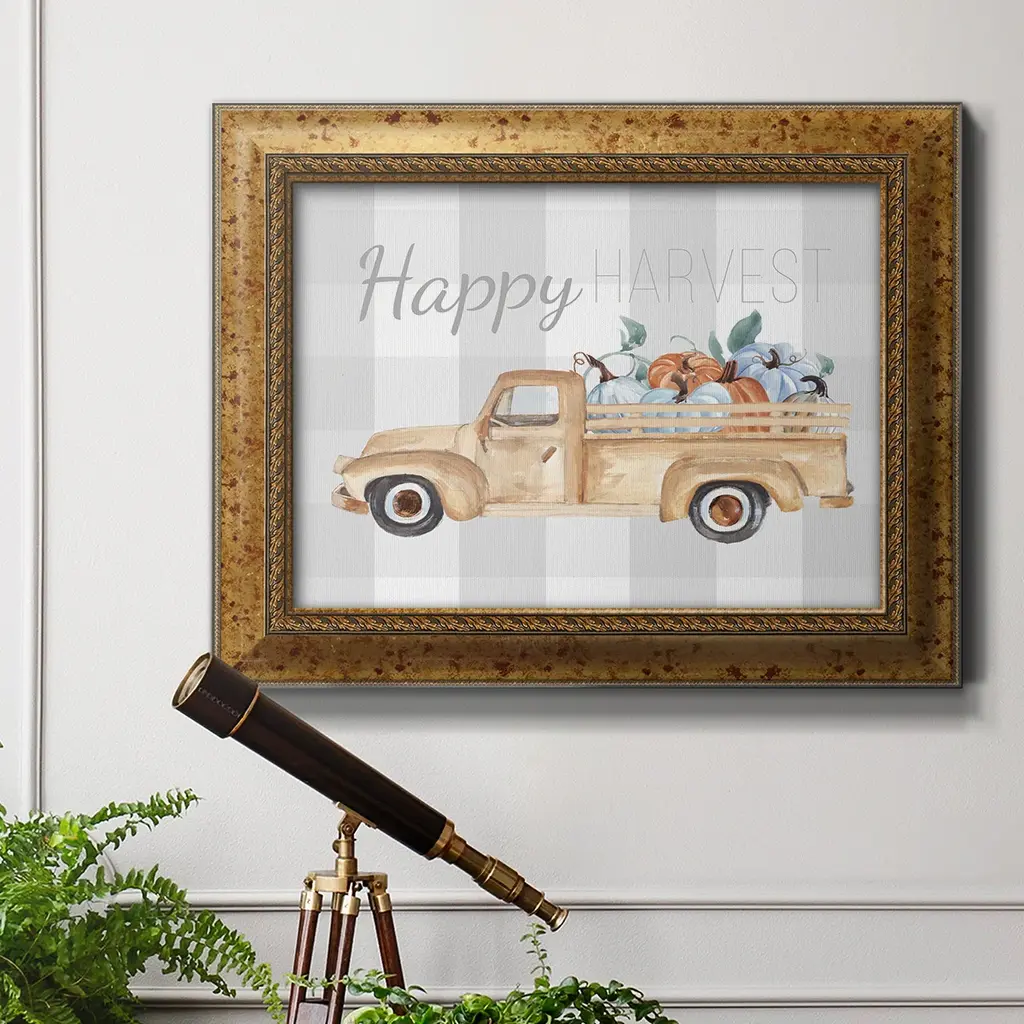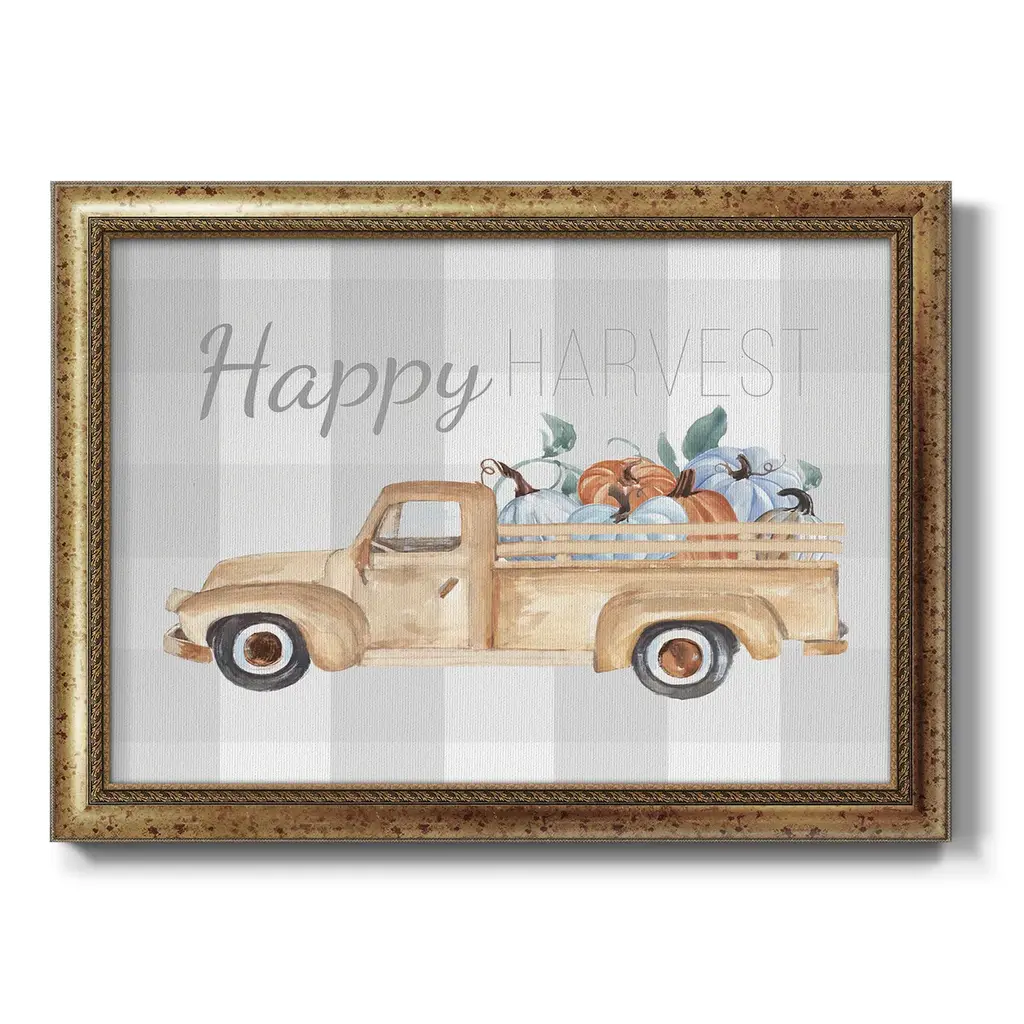 Happy Harvest I Premium Framed Canvas- Ready to Hang A Premium Framed Canvas created to last. Framed in distressed wood and available in an array of sizes and colors Featuring a beveled a solid wood stretcher bar, each piece comes ready to hand 3 SIZES AVAILABLE 16''X20'' - Overall Size 18'X27'' - Overall Size 24''x36'' - Overall Size Each piece is made to order. Each piece comes with hanging hardware. Made in the USA Ready to Hang Giclee Paper Print Acrylic Glass Beveled Matt Board