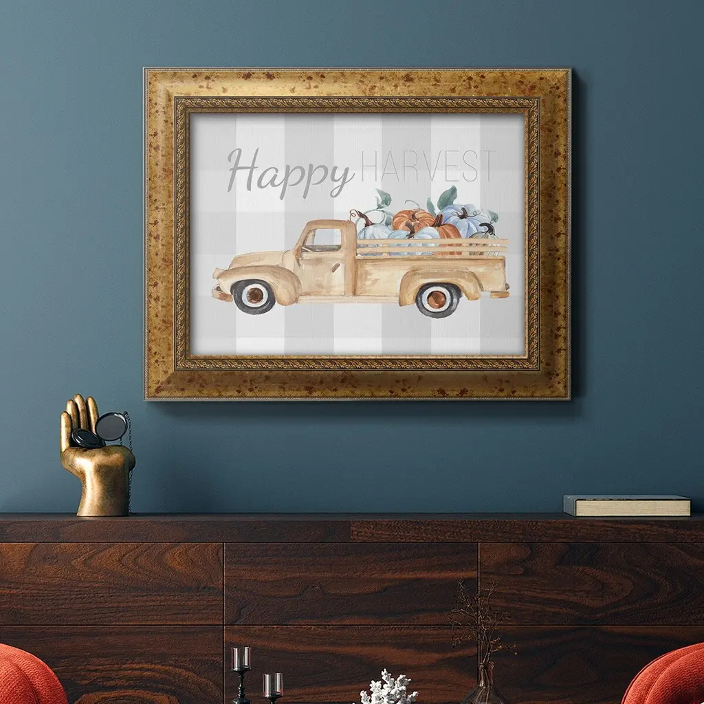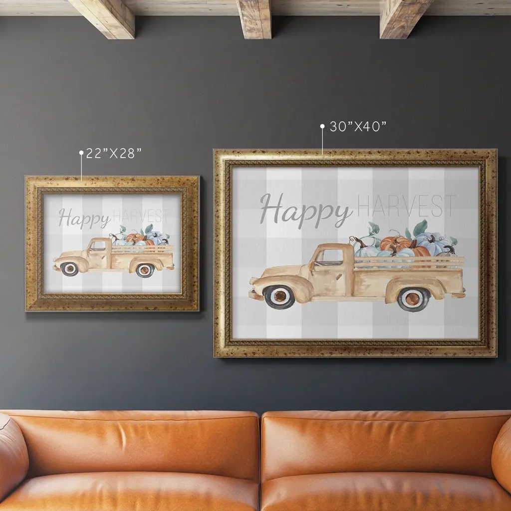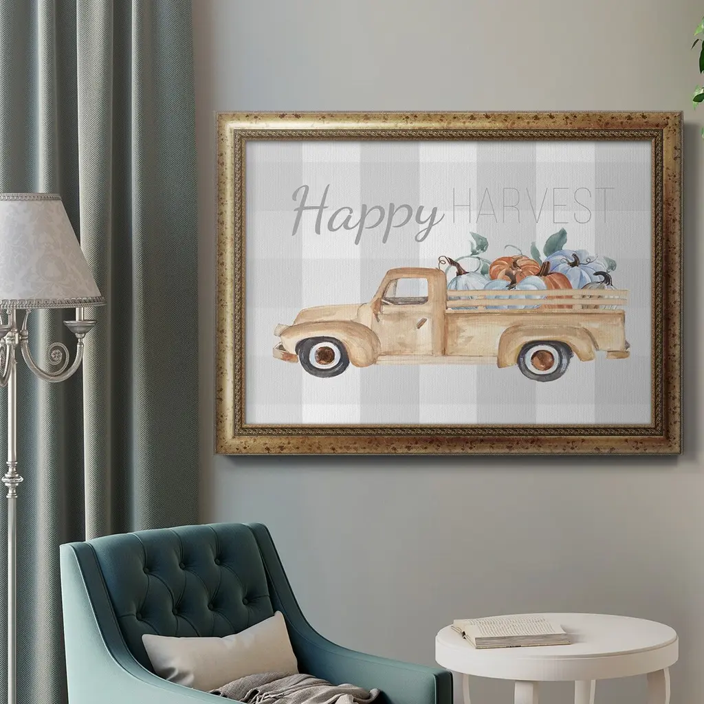 Happy Harvest I Premium Framed Canvas- Ready to Hang A Premium Framed Canvas created to last. Framed in distressed wood and available in an array of sizes and colors Featuring a beveled a solid wood stretcher bar, each piece comes ready to hand 3 SIZES AVAILABLE 16''X20'' - Overall Size 18'X27'' - Overall Size 24''x36'' - Overall Size Each piece is made to order. Each piece comes with hanging hardware. Made in the USA Ready to Hang Giclee Paper Print Acrylic Glass Beveled Matt Board