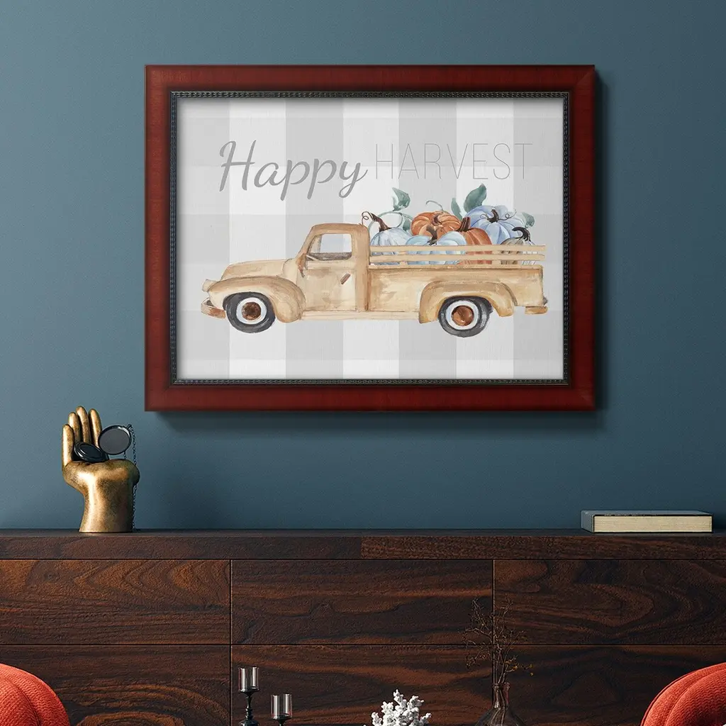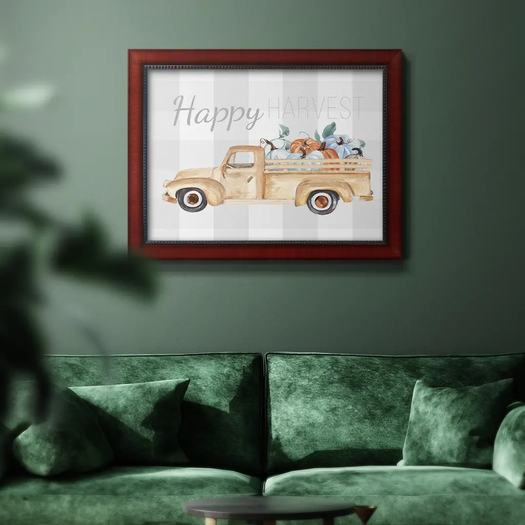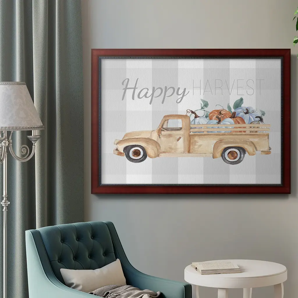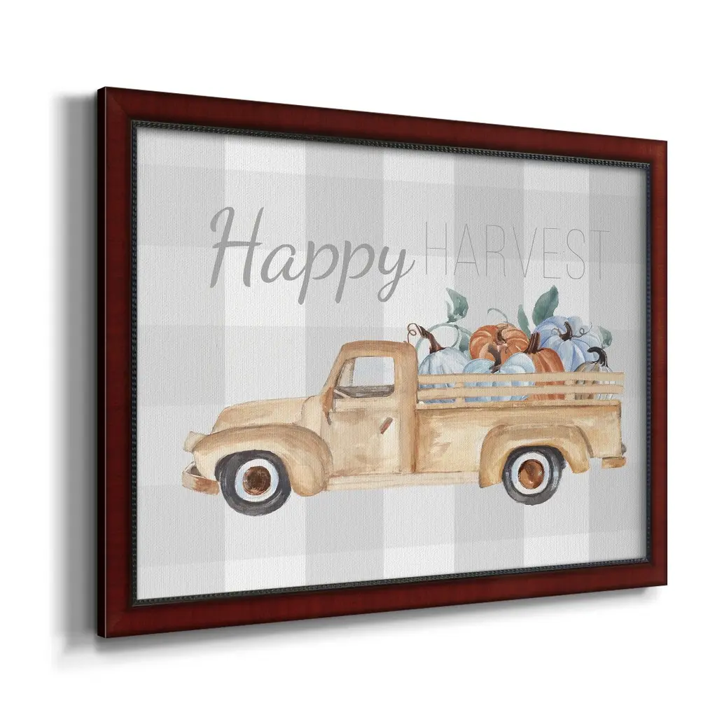 Happy Harvest I Premium Framed Canvas- Ready to Hang A Premium Framed Canvas created to last. Framed in distressed wood and available in an array of sizes and colors Featuring a beveled a solid wood stretcher bar, each piece comes ready to hand 3 SIZES AVAILABLE 16''X20'' - Overall Size 18'X27'' - Overall Size 24''x36'' - Overall Size Each piece is made to order. Each piece comes with hanging hardware. Made in the USA Ready to Hang Giclee Paper Print Acrylic Glass Beveled Matt Board