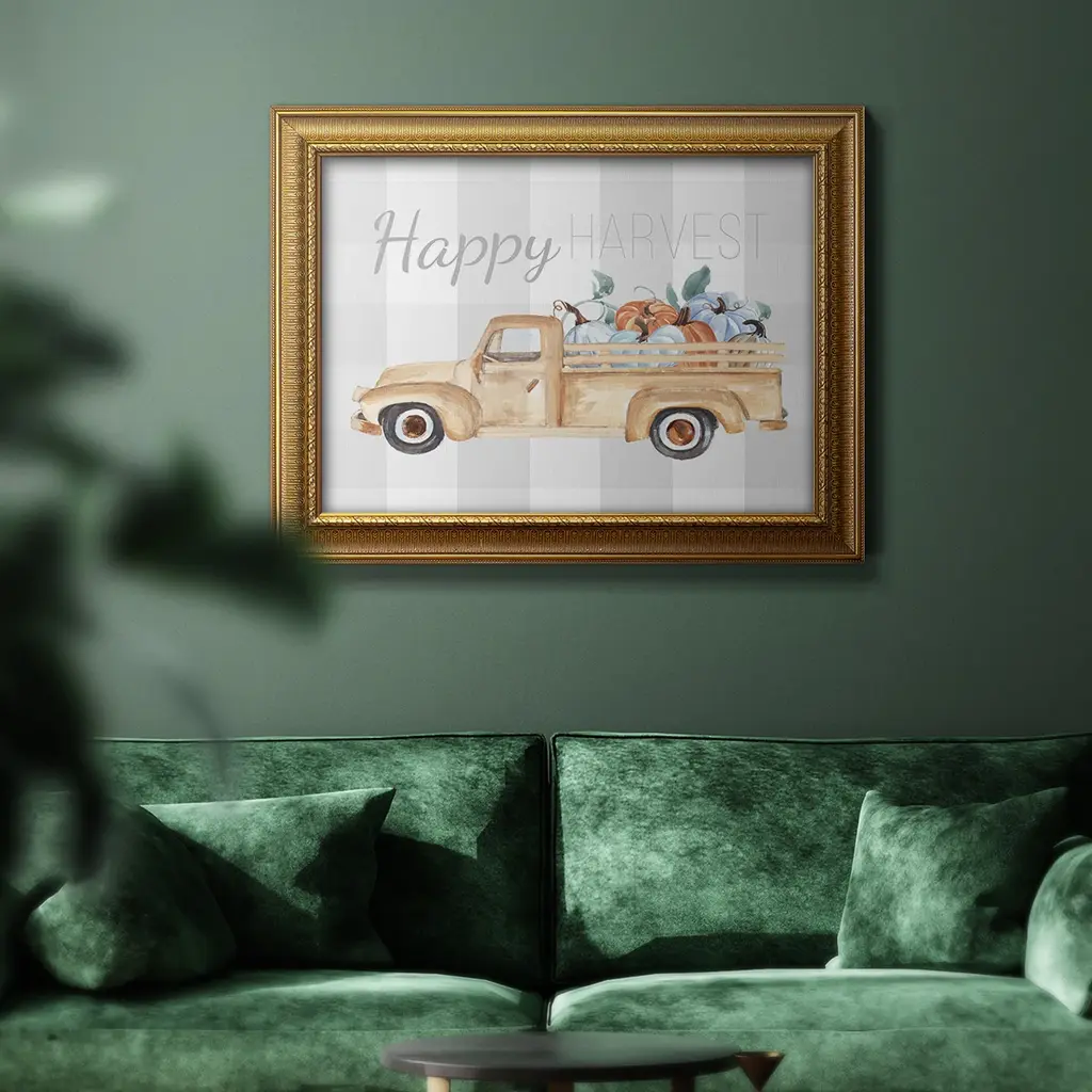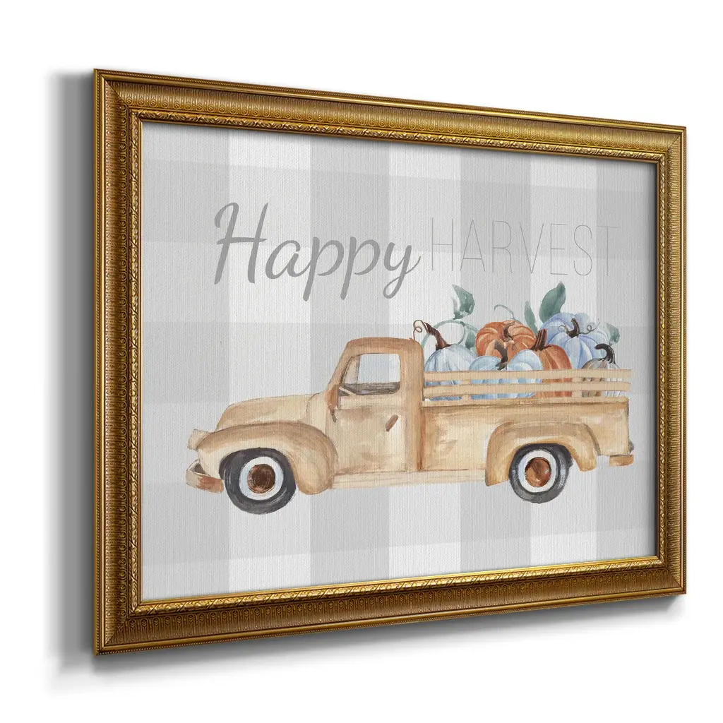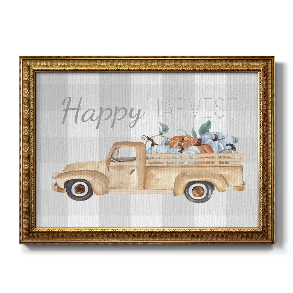 Happy Harvest I Premium Framed Canvas- Ready to Hang A Premium Framed Canvas created to last. Framed in distressed wood and available in an array of sizes and colors Featuring a beveled a solid wood stretcher bar, each piece comes ready to hand 3 SIZES AVAILABLE 16''X20'' - Overall Size 18'X27'' - Overall Size 24''x36'' - Overall Size Each piece is made to order. Each piece comes with hanging hardware. Made in the USA Ready to Hang Giclee Paper Print Acrylic Glass Beveled Matt Board