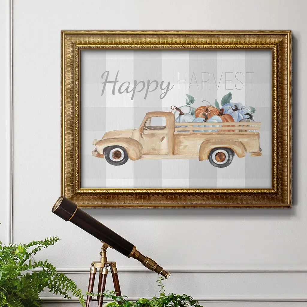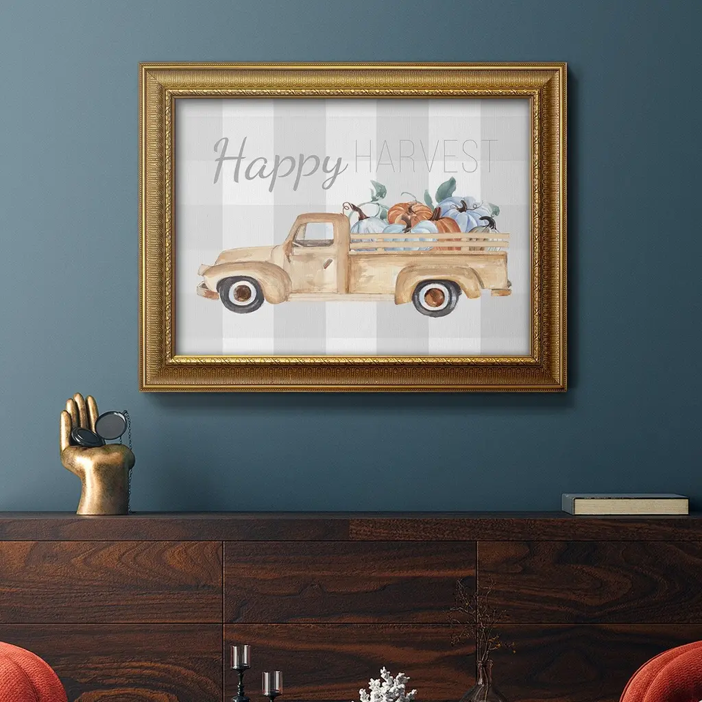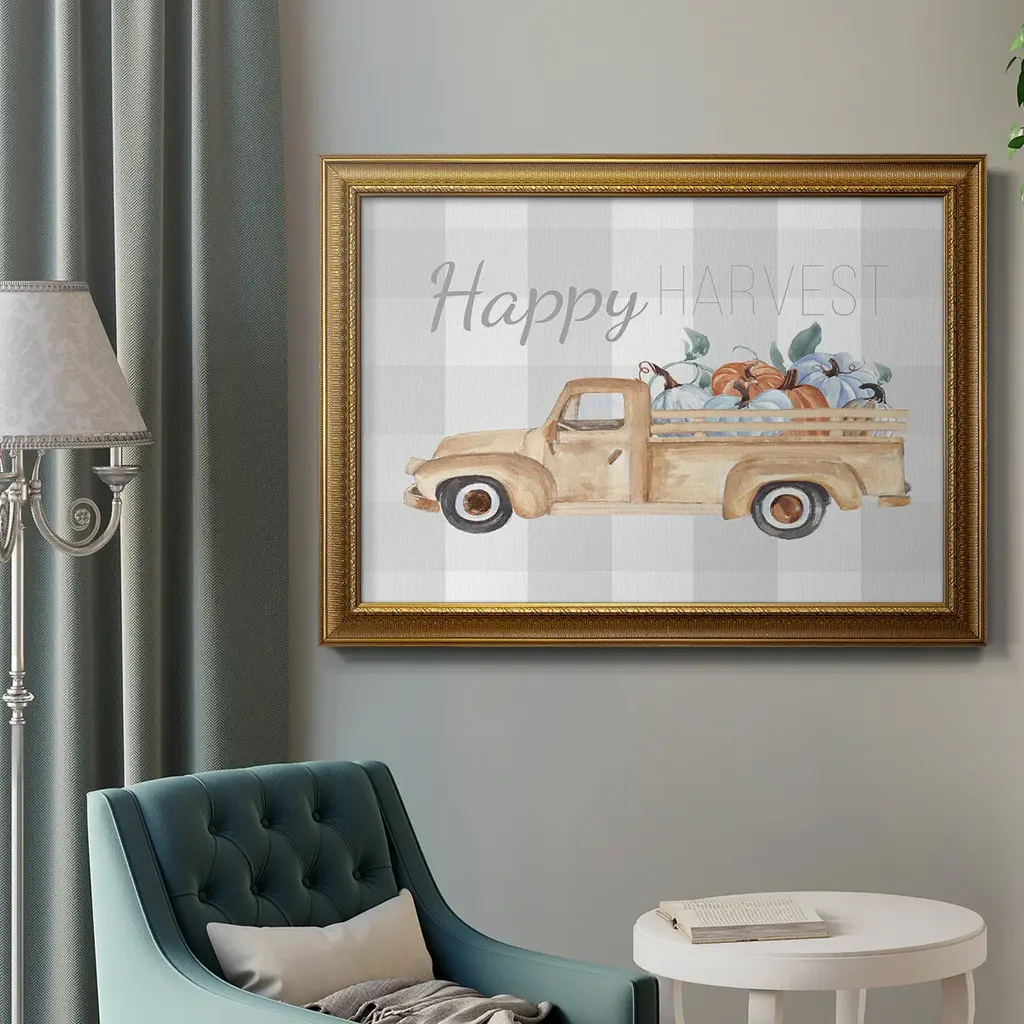 Happy Harvest I Premium Framed Canvas- Ready to Hang A Premium Framed Canvas created to last. Framed in distressed wood and available in an array of sizes and colors Featuring a beveled a solid wood stretcher bar, each piece comes ready to hand 3 SIZES AVAILABLE 16''X20'' - Overall Size 18'X27'' - Overall Size 24''x36'' - Overall Size Each piece is made to order. Each piece comes with hanging hardware. Made in the USA Ready to Hang Giclee Paper Print Acrylic Glass Beveled Matt Board