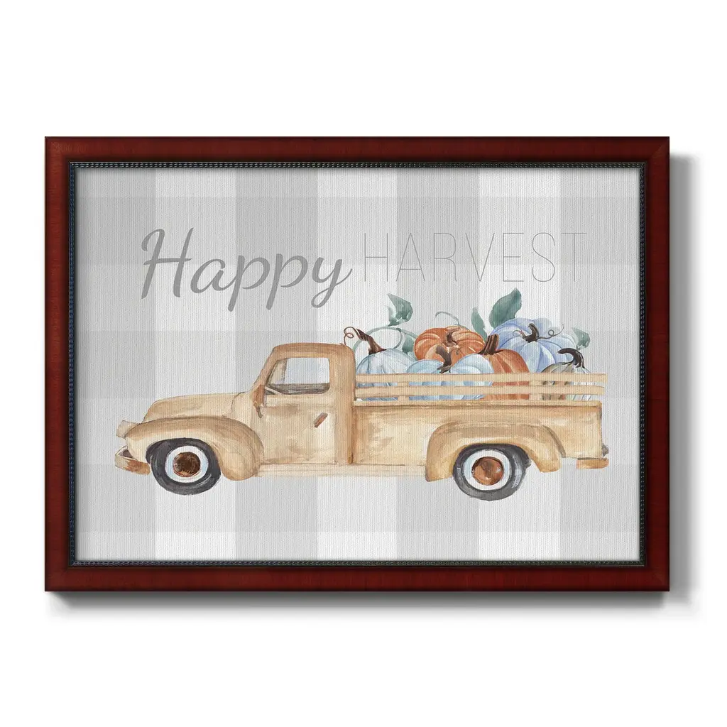 Happy Harvest I Premium Framed Canvas- Ready to Hang A Premium Framed Canvas created to last. Framed in distressed wood and available in an array of sizes and colors Featuring a beveled a solid wood stretcher bar, each piece comes ready to hand 3 SIZES AVAILABLE 16''X20'' - Overall Size 18'X27'' - Overall Size 24''x36'' - Overall Size Each piece is made to order. Each piece comes with hanging hardware. Made in the USA Ready to Hang Giclee Paper Print Acrylic Glass Beveled Matt Board