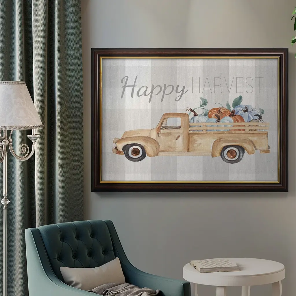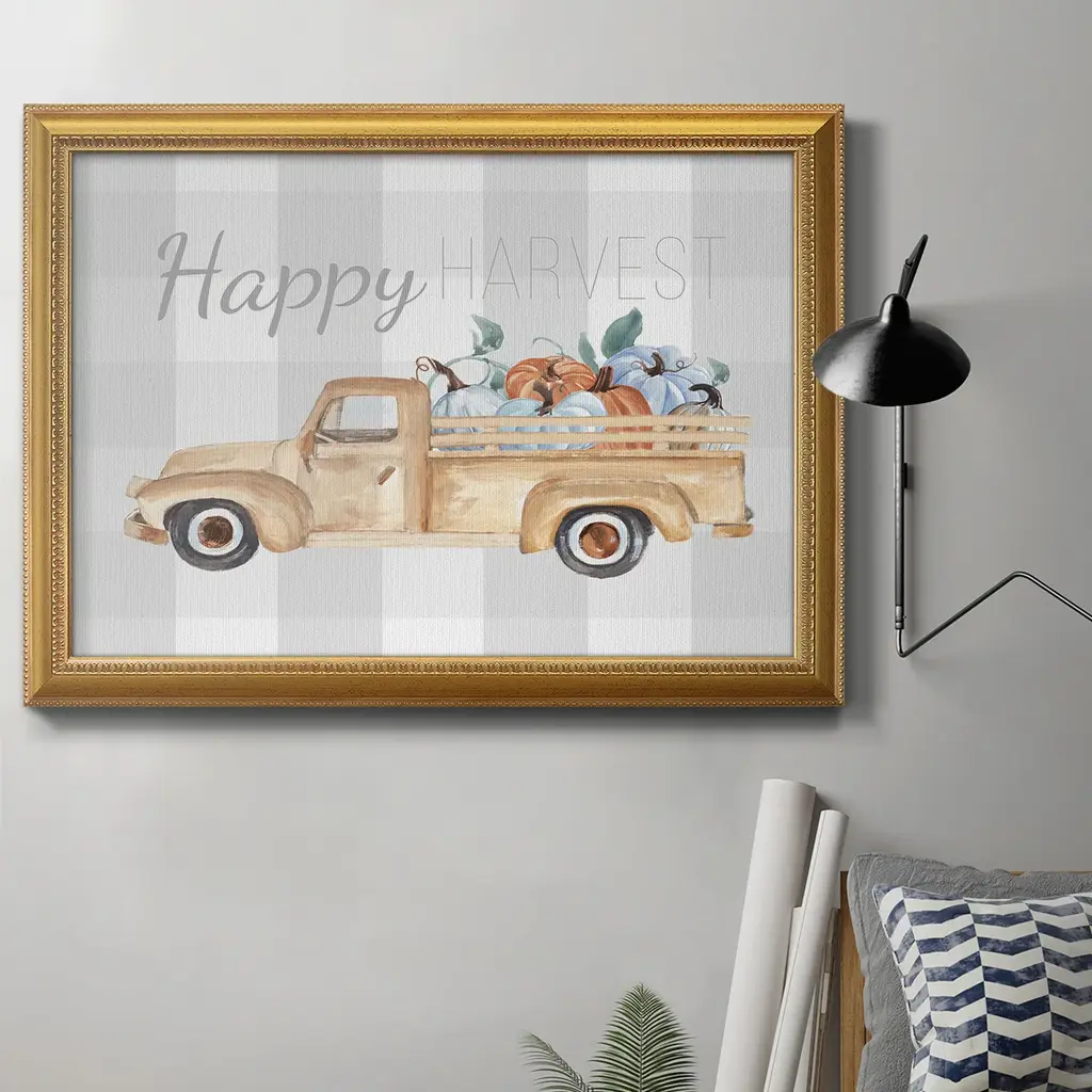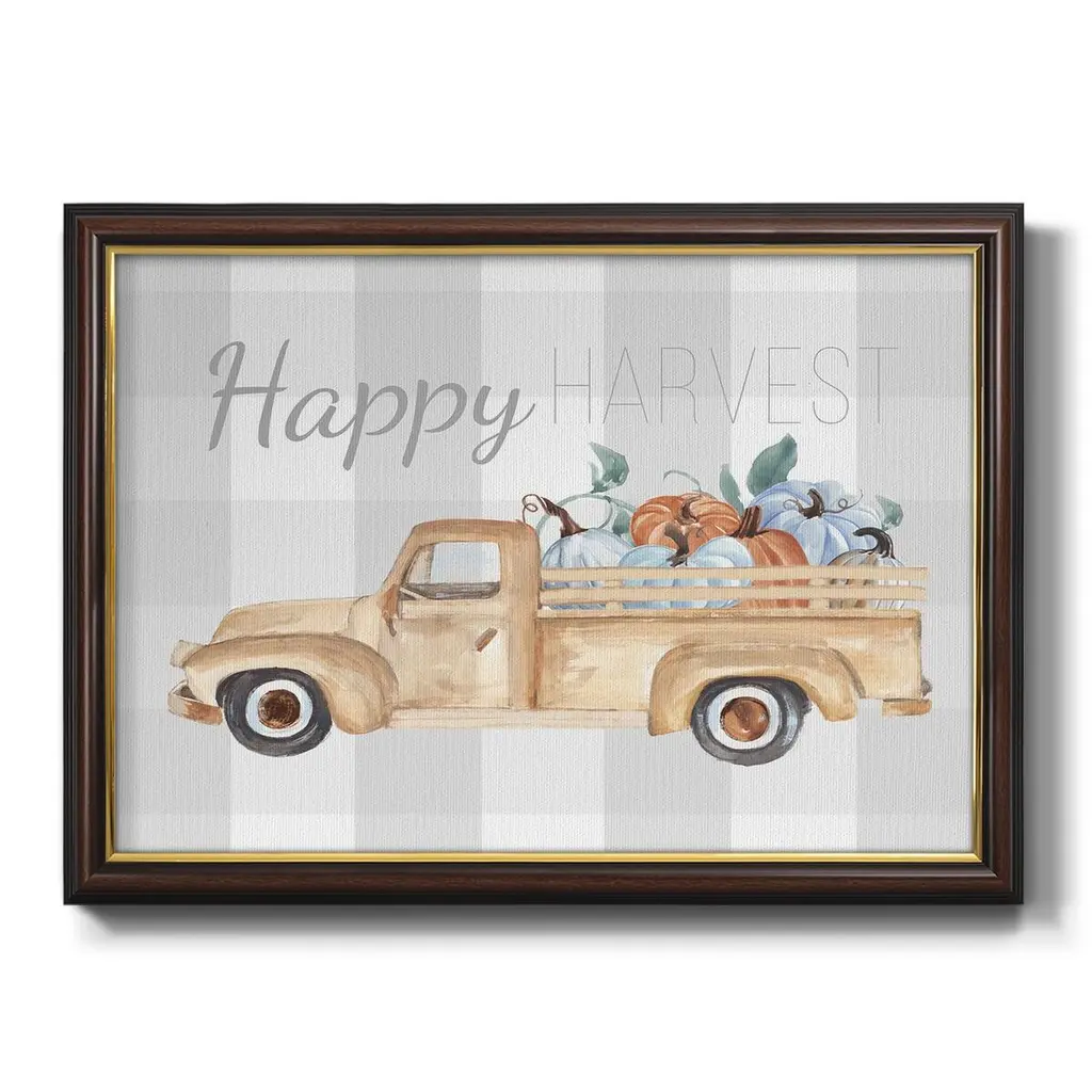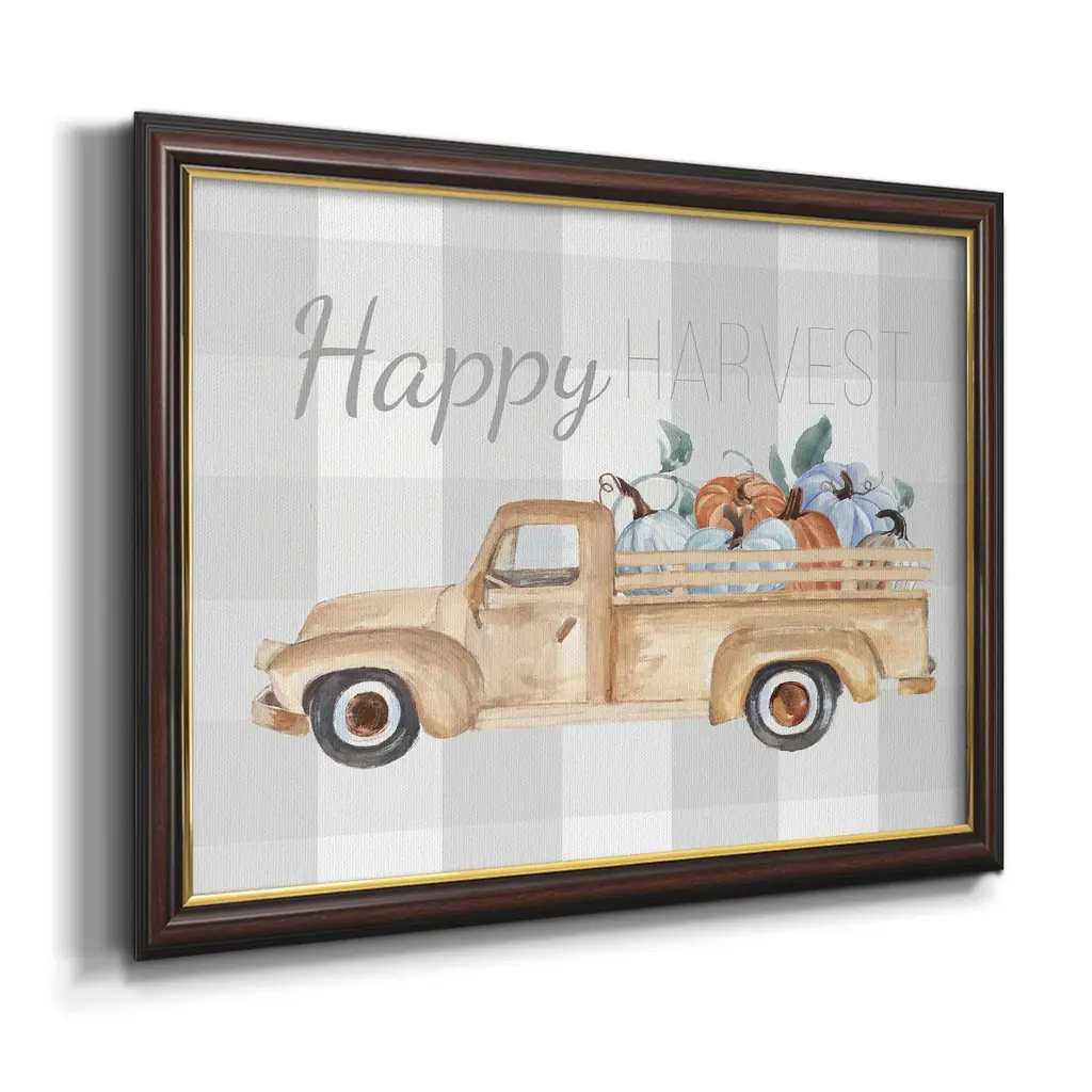 Happy Harvest I Premium Framed Canvas- Ready to Hang A Premium Framed Canvas created to last. Framed in distressed wood and available in an array of sizes and colors Featuring a beveled a solid wood stretcher bar, each piece comes ready to hand 3 SIZES AVAILABLE 16''X20'' - Overall Size 18'X27'' - Overall Size 24''x36'' - Overall Size Each piece is made to order. Each piece comes with hanging hardware. Made in the USA Ready to Hang Giclee Paper Print Acrylic Glass Beveled Matt Board