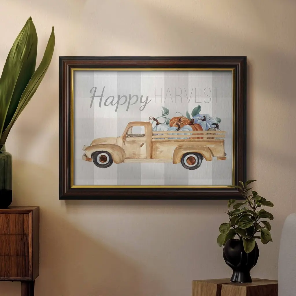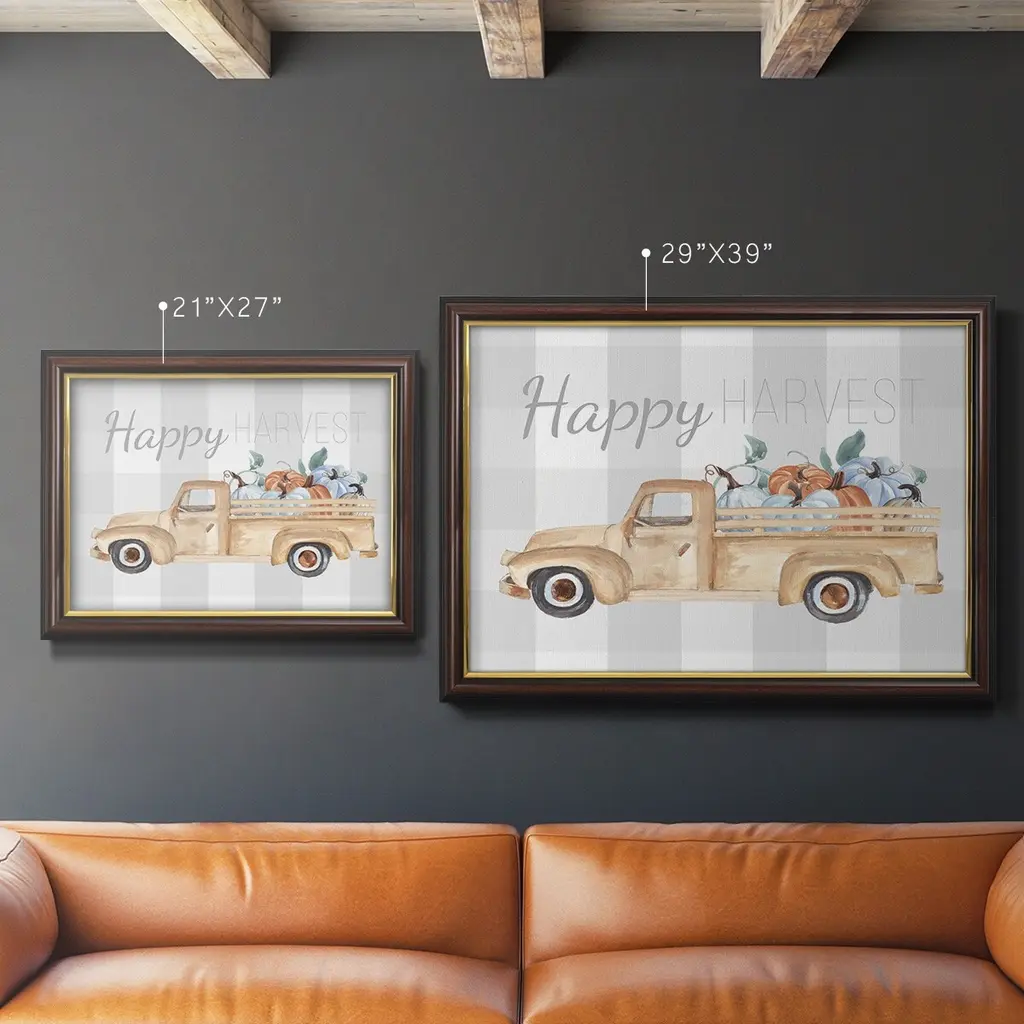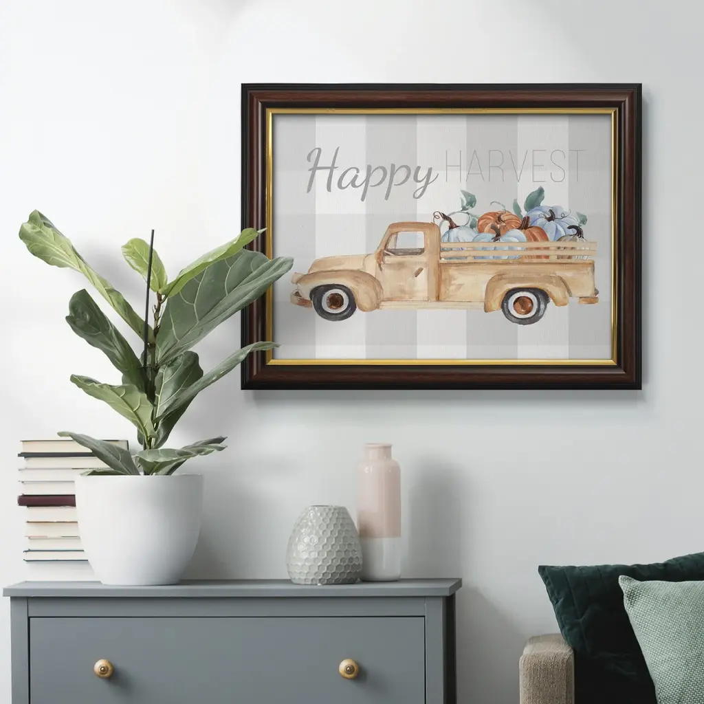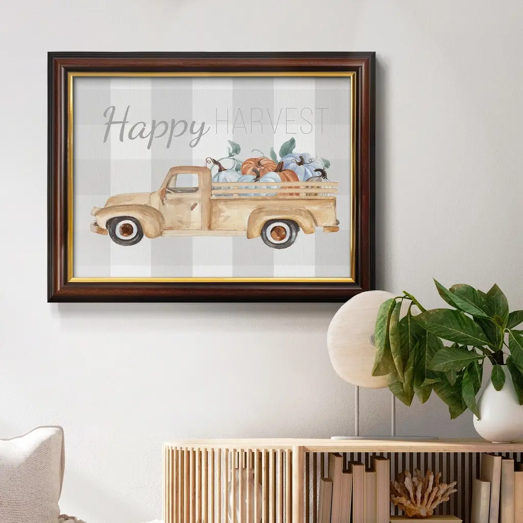 Happy Harvest I Premium Framed Canvas- Ready to Hang A Premium Framed Canvas created to last. Framed in distressed wood and available in an array of sizes and colors Featuring a beveled a solid wood stretcher bar, each piece comes ready to hand 3 SIZES AVAILABLE 16''X20'' - Overall Size 18'X27'' - Overall Size 24''x36'' - Overall Size Each piece is made to order. Each piece comes with hanging hardware. Made in the USA Ready to Hang Giclee Paper Print Acrylic Glass Beveled Matt Board