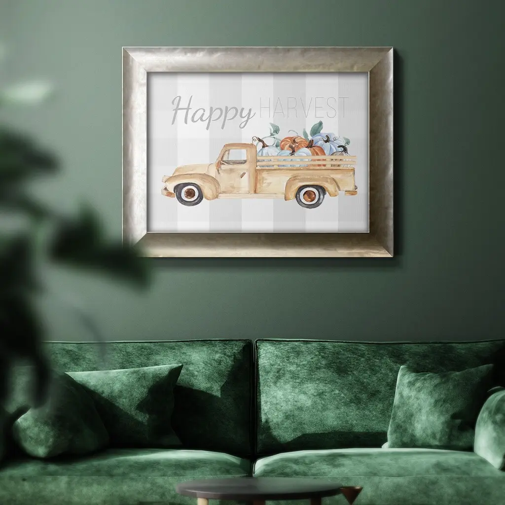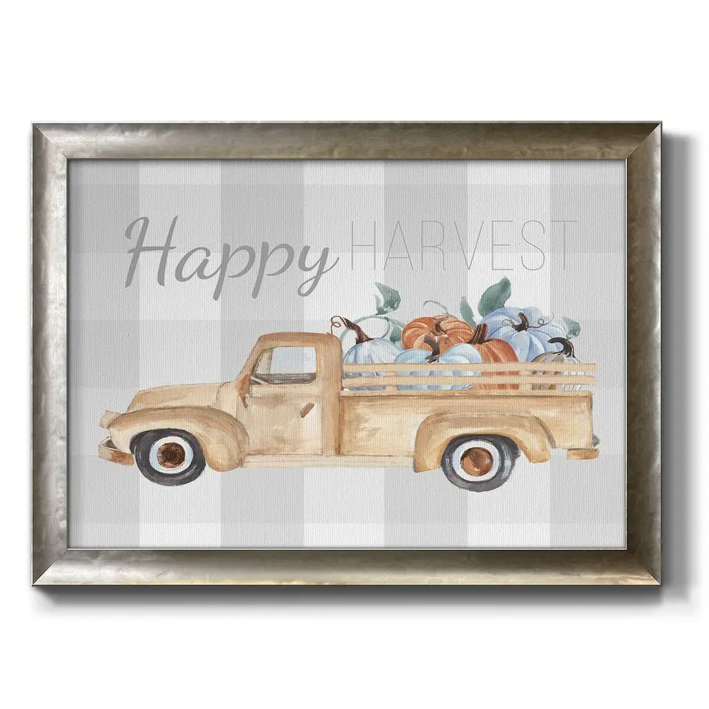 Happy Harvest I Premium Framed Canvas- Ready to Hang A Premium Framed Canvas created to last. Framed in distressed wood and available in an array of sizes and colors Featuring a beveled a solid wood stretcher bar, each piece comes ready to hand 3 SIZES AVAILABLE 16''X20'' - Overall Size 18'X27'' - Overall Size 24''x36'' - Overall Size Each piece is made to order. Each piece comes with hanging hardware. Made in the USA Ready to Hang Giclee Paper Print Acrylic Glass Beveled Matt Board