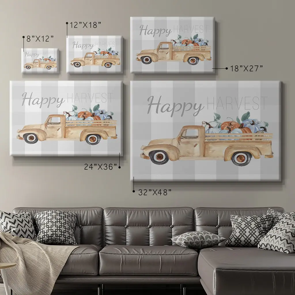 Happy Harvest I Premium Gallery Wrapped Canvas - Ready to Hang A premium hand stretched gallery wrapped canvas print created to last. Featuring a beveled a solid wood stretcher bar, each piece comes ready to hand 6 SIZES AVAILABLE 8''X12'' - Overall Size 12''X18'' - Overall Size 18''X27'' - Overall Size 24''x36'' - Overall Size 32''x48'' - Overall Size 40''x60'' - Overall Size Each piece is made to order. Built to Last Each piece comes ready to hang Solid wood stretcher Fade and Water resistant Made domestically