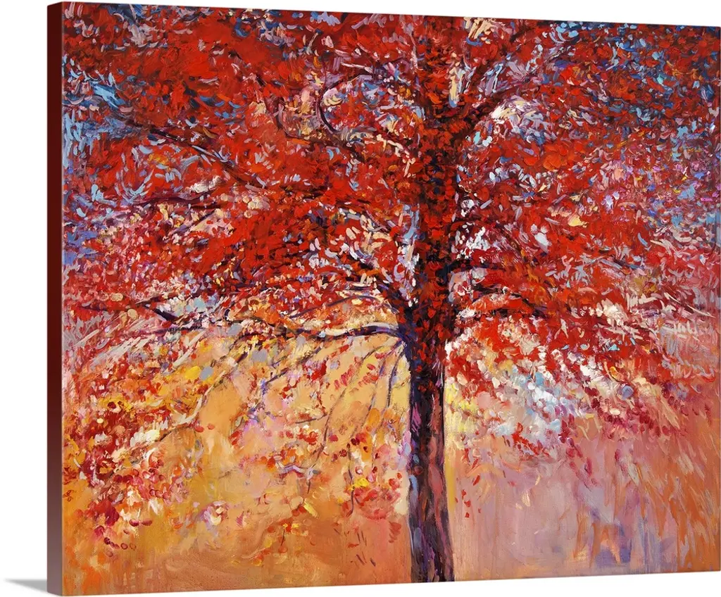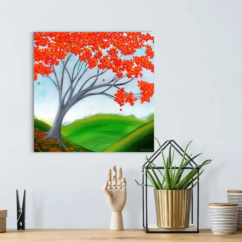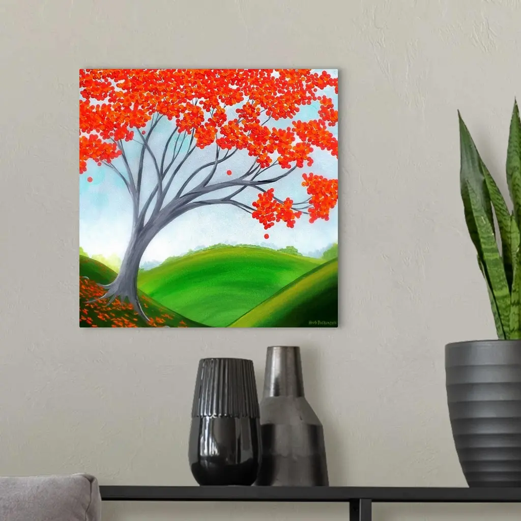 Contemporary square painting of a tree with red leaves on the side of a hill with rolling hills in the background.