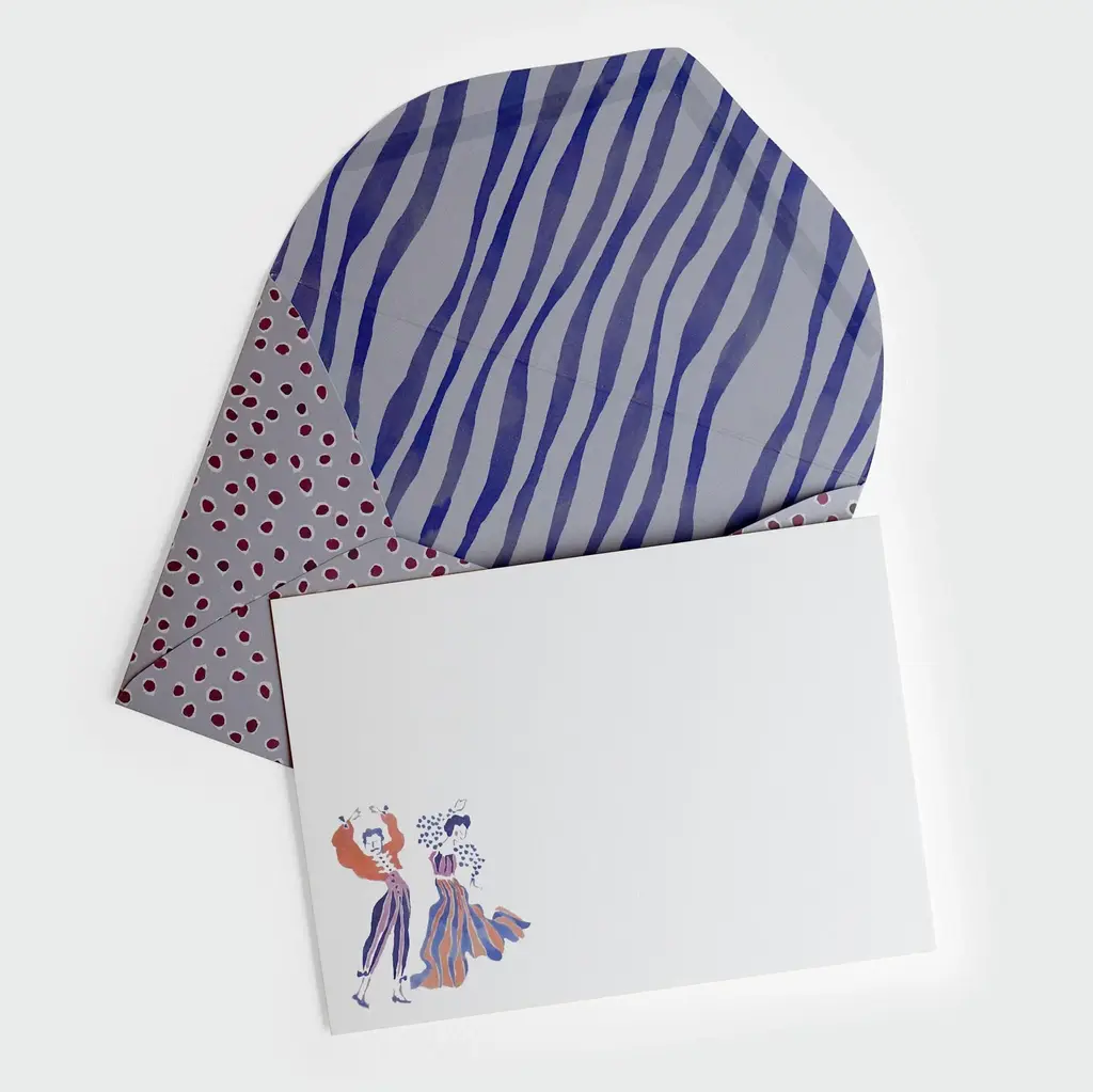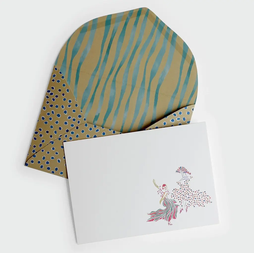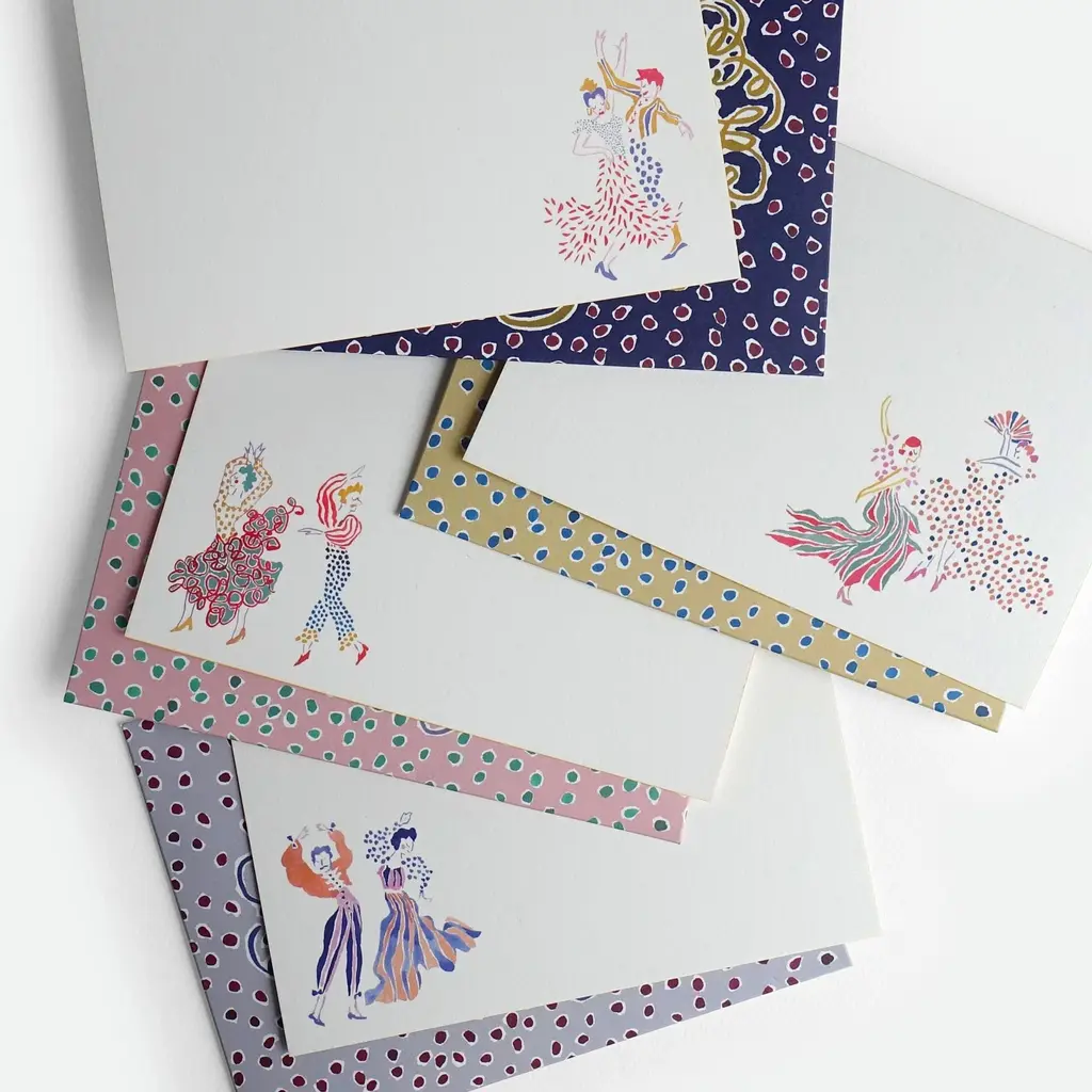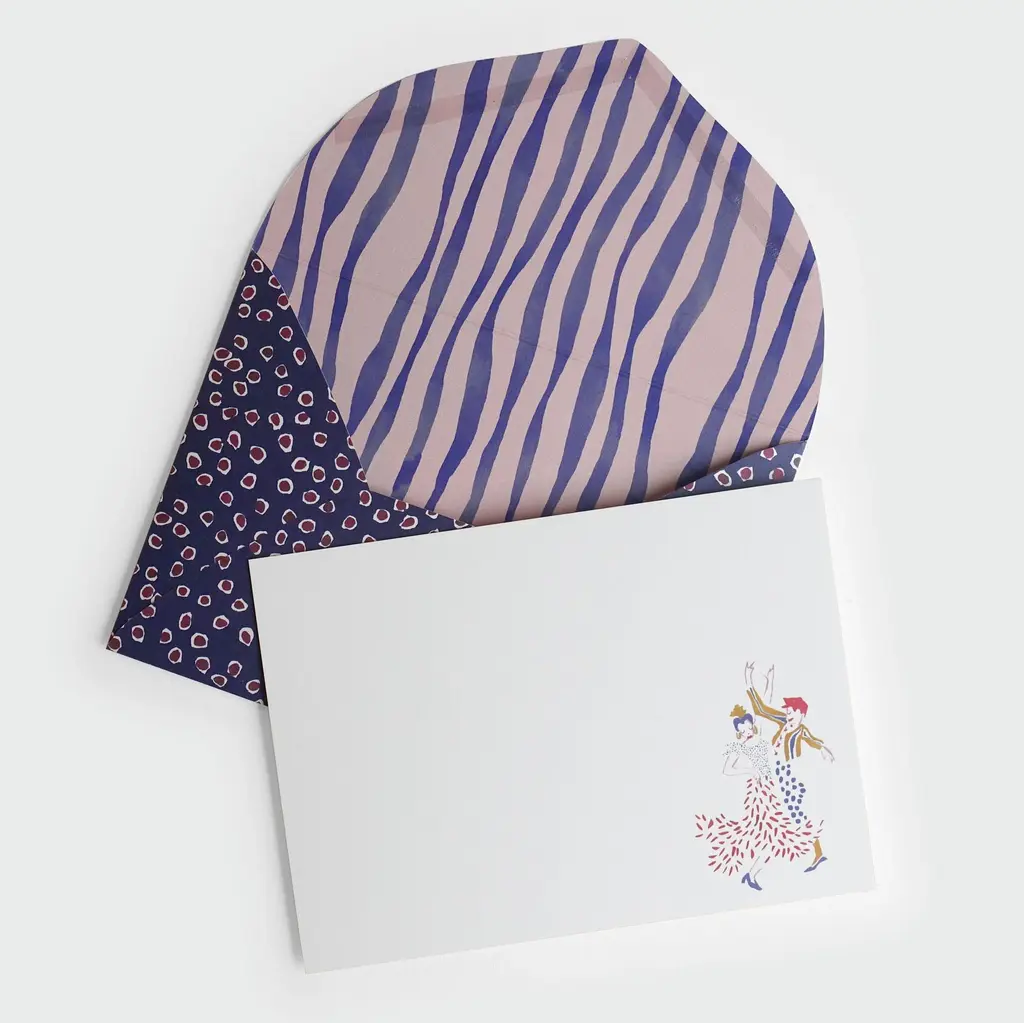 Assortment of 20 A6 notecards (sized at 4.5” x 6.125”) and matching envelopes. Featuring Happy's collection of Flamenco dancer artwork, this set includes five each of four different designs. Each corresponding envelope is lined with a complimentary stripe pattern. The set is packaged in a candy apple red folio, tied with yellow silk ribbon.