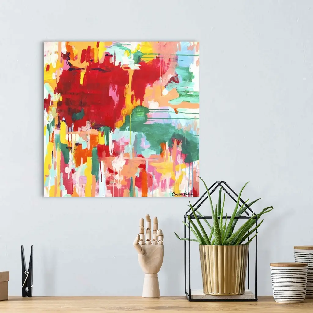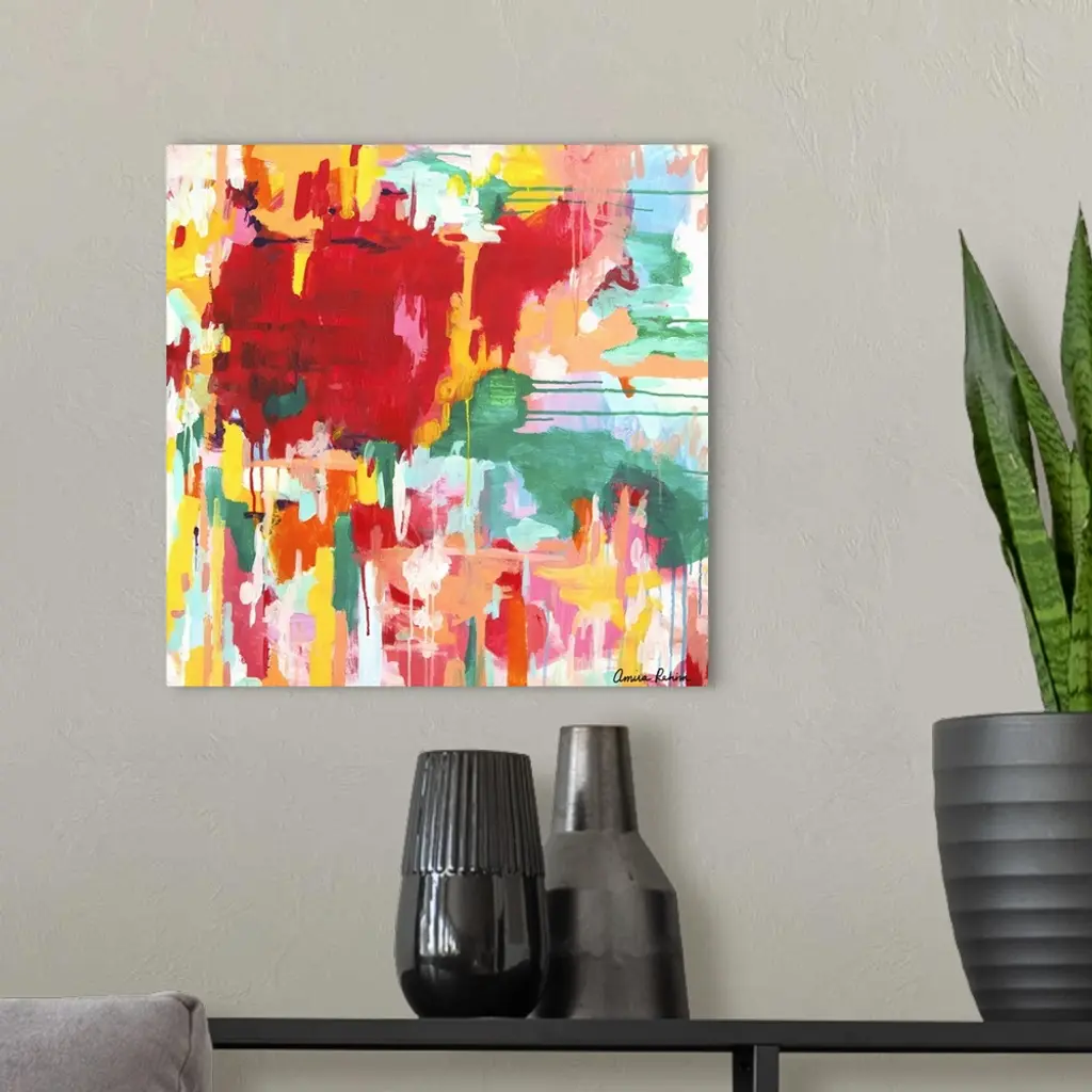 Contemporary abstract artwork in red, yellow, and green tones.