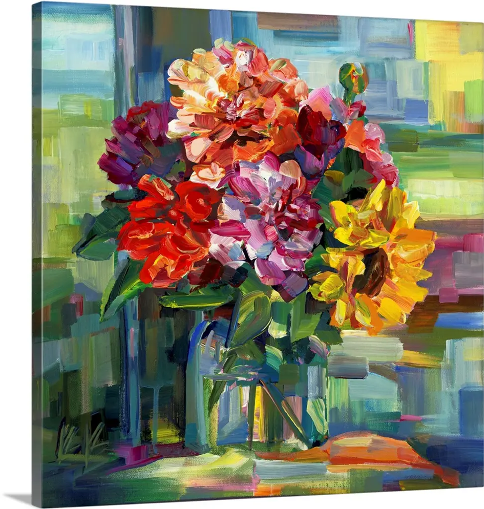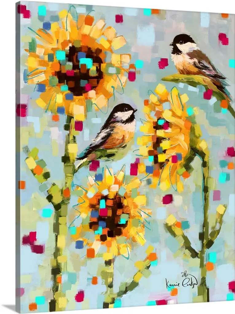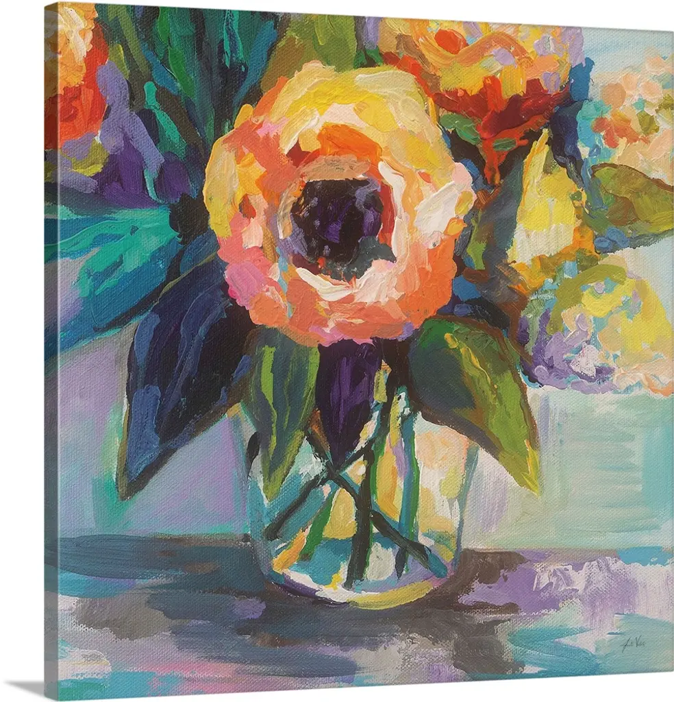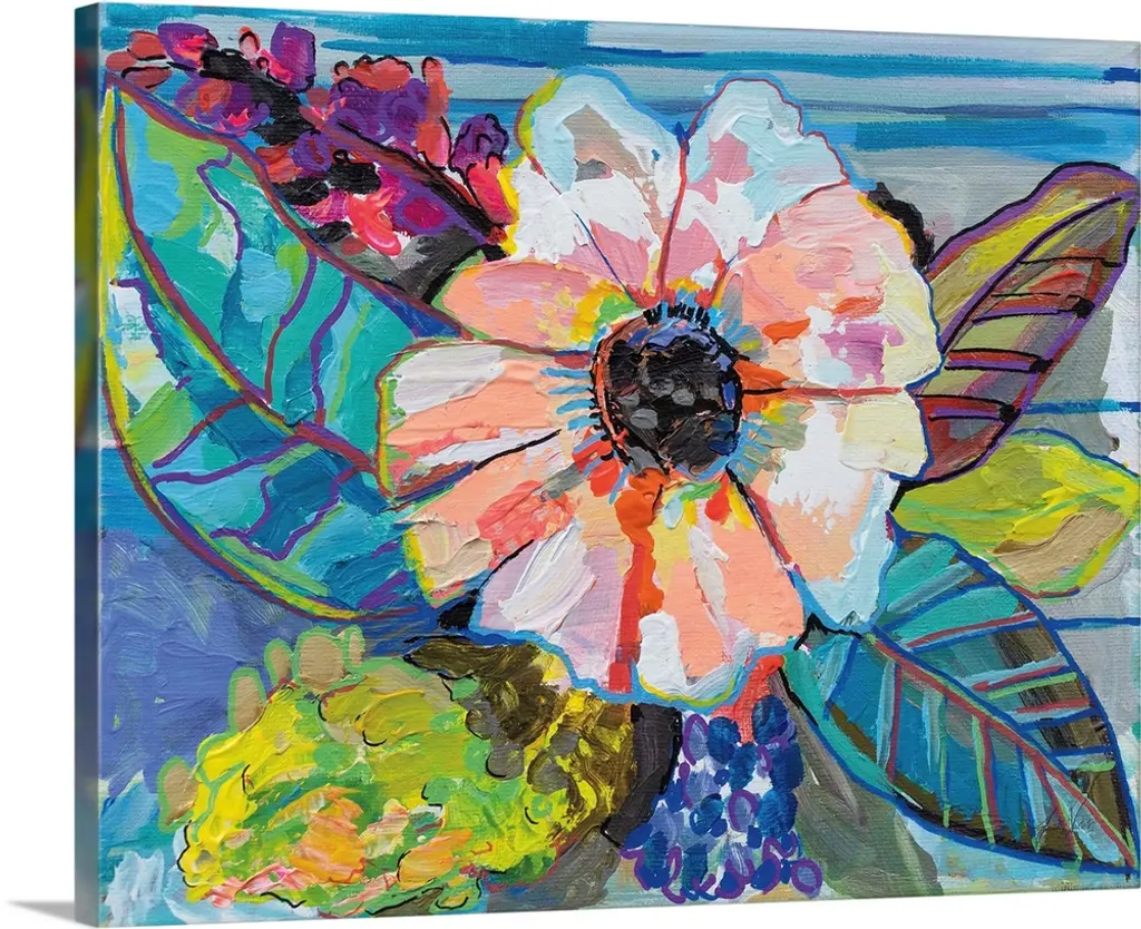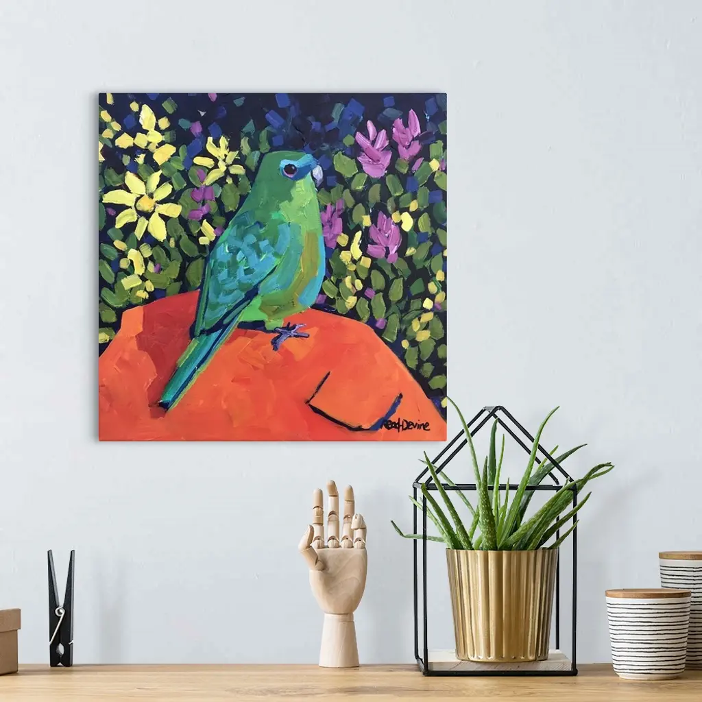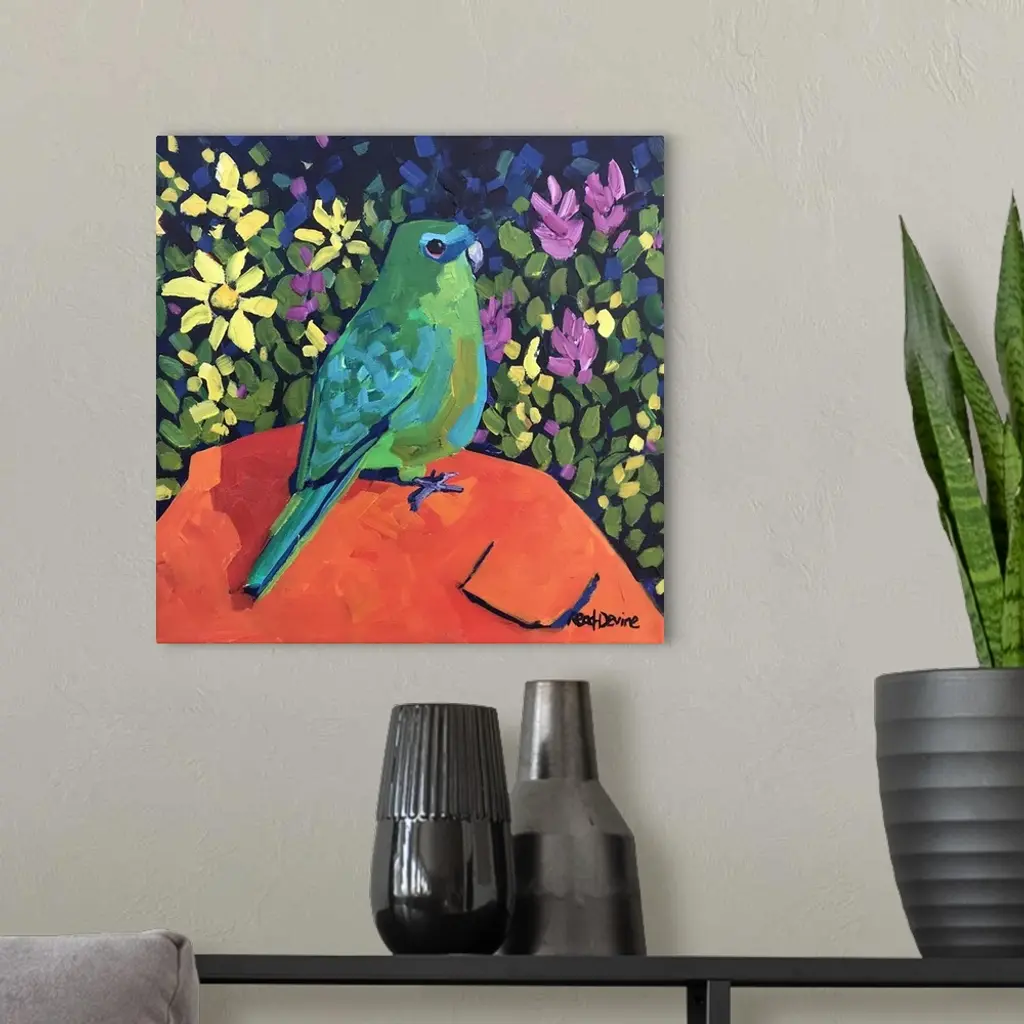 NaAve painting of green parrot sitting on an orange rock with a background of flowers.