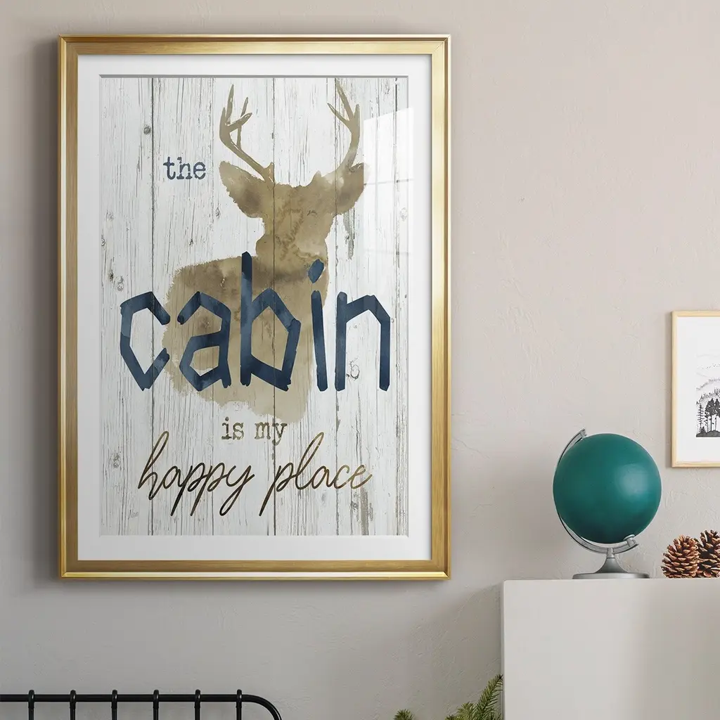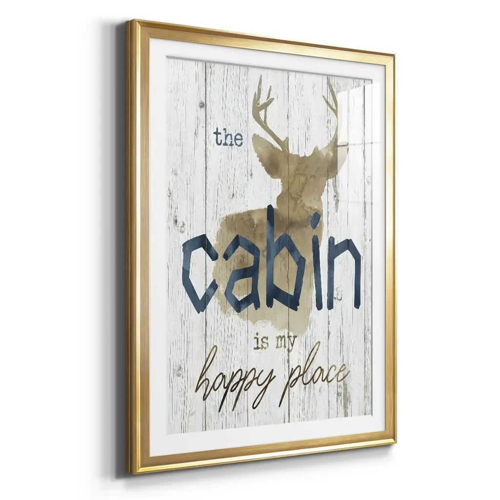 Happy Place Cabin Premium Framed Print - Ready to Hang A Premium Framed Print created to last. Framed in distressed wood and available in an array of sizes and colors Featuring a beveled a solid wood stretcher bar, each piece comes ready to hand 4 SIZES AVAILABLE 30.5''X42.5'' - Overall Size 26.5'X36.5'' - Overall Size 22.5''x30.5'' - Overall Size 18.5''x24.5'' - Overall Size Each piece is made to order. Each piece comes with hanging hardware. Made in the USA Ready to Hang Giclee Paper Print Acrylic Glass Beveled Matt Board