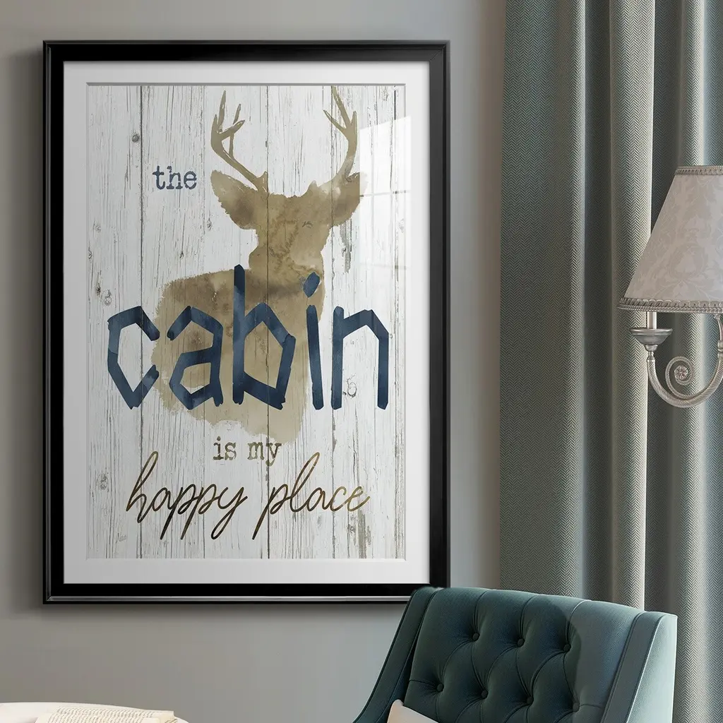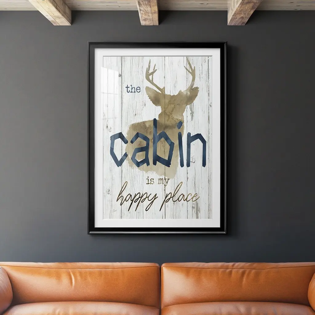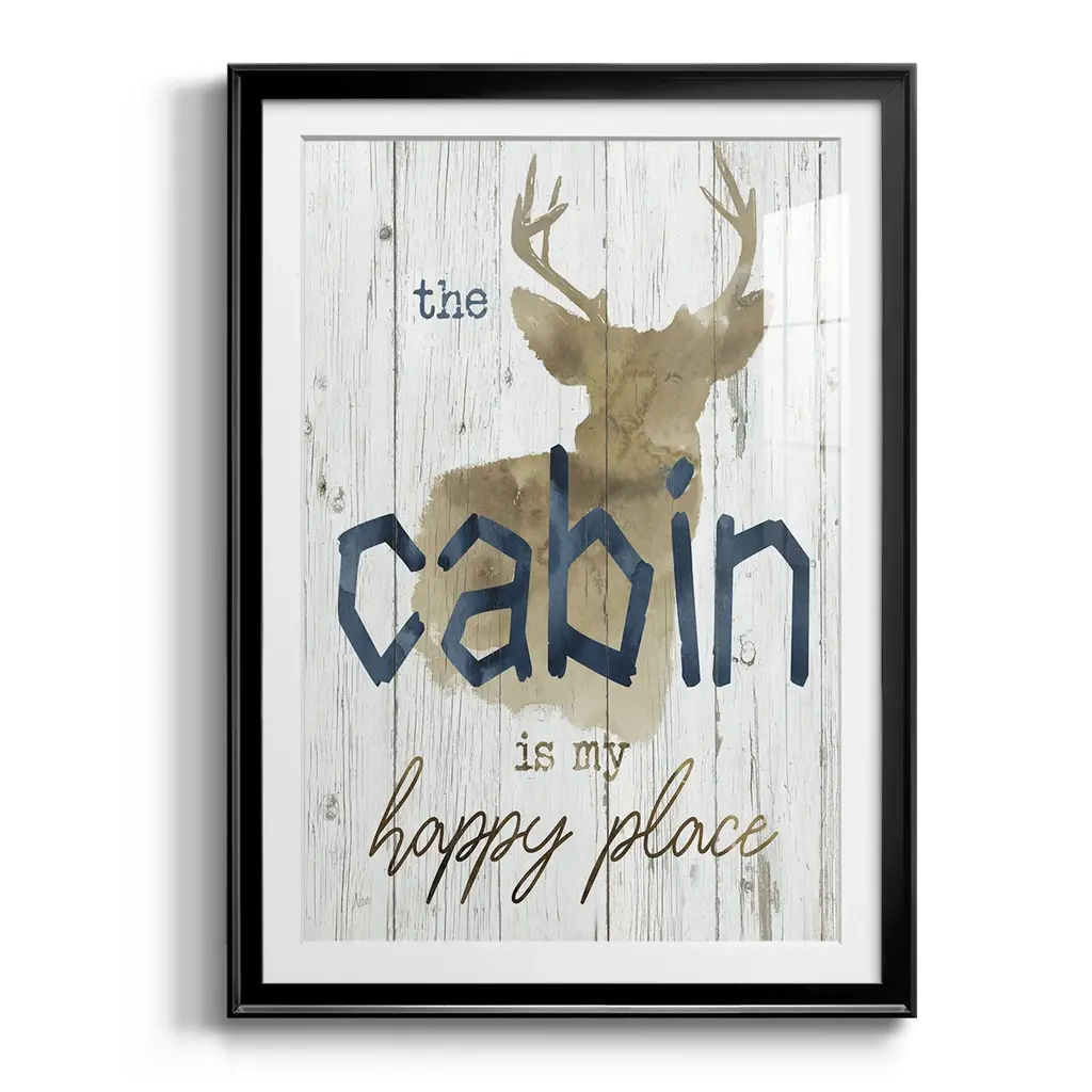 Happy Place Cabin Premium Framed Print - Ready to Hang A Premium Framed Print created to last. Framed in distressed wood and available in an array of sizes and colors Featuring a beveled a solid wood stretcher bar, each piece comes ready to hand 4 SIZES AVAILABLE 30.5''X42.5'' - Overall Size 26.5'X36.5'' - Overall Size 22.5''x30.5'' - Overall Size 18.5''x24.5'' - Overall Size Each piece is made to order. Each piece comes with hanging hardware. Made in the USA Ready to Hang Giclee Paper Print Acrylic Glass Beveled Matt Board