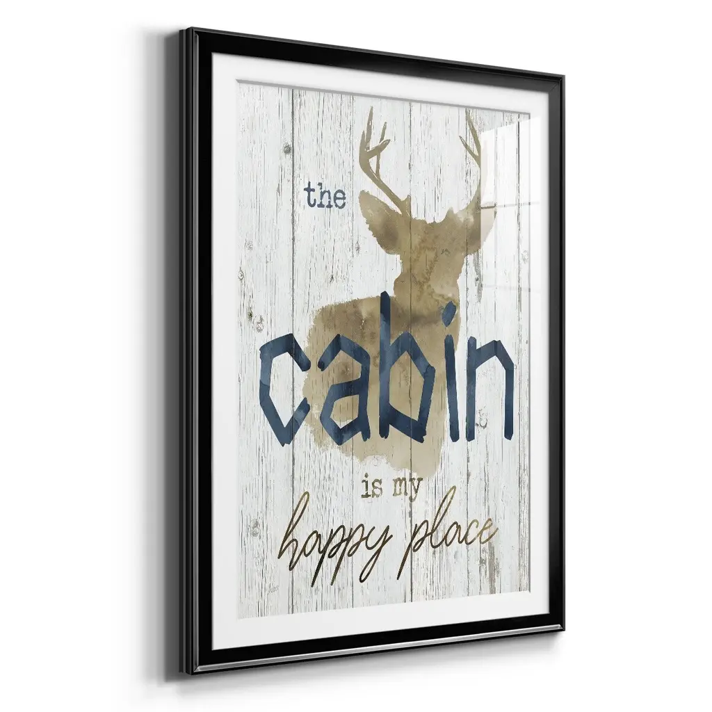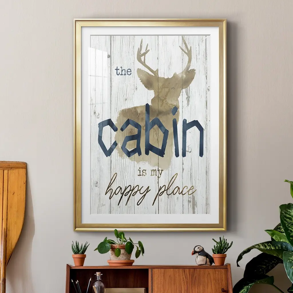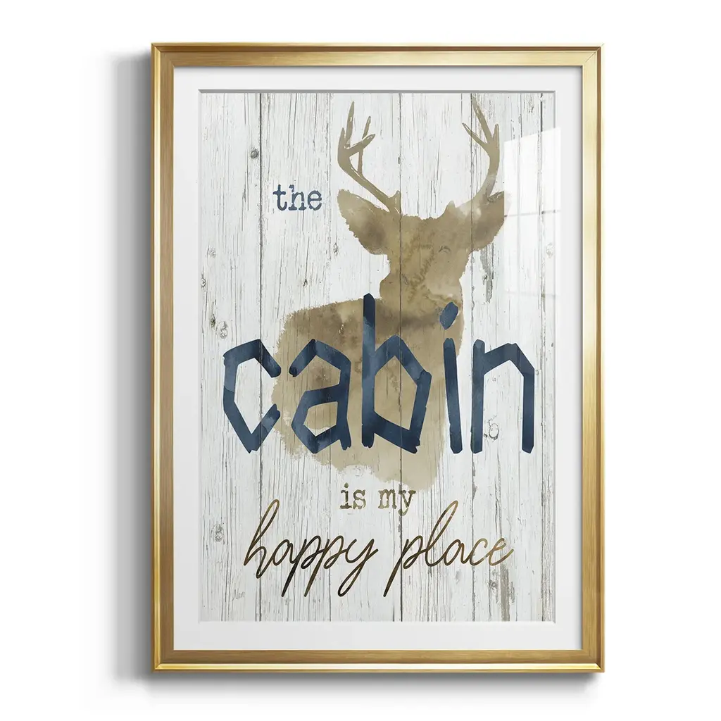 Happy Place Cabin Premium Framed Print - Ready to Hang A Premium Framed Print created to last. Framed in distressed wood and available in an array of sizes and colors Featuring a beveled a solid wood stretcher bar, each piece comes ready to hand 4 SIZES AVAILABLE 30.5''X42.5'' - Overall Size 26.5'X36.5'' - Overall Size 22.5''x30.5'' - Overall Size 18.5''x24.5'' - Overall Size Each piece is made to order. Each piece comes with hanging hardware. Made in the USA Ready to Hang Giclee Paper Print Acrylic Glass Beveled Matt Board