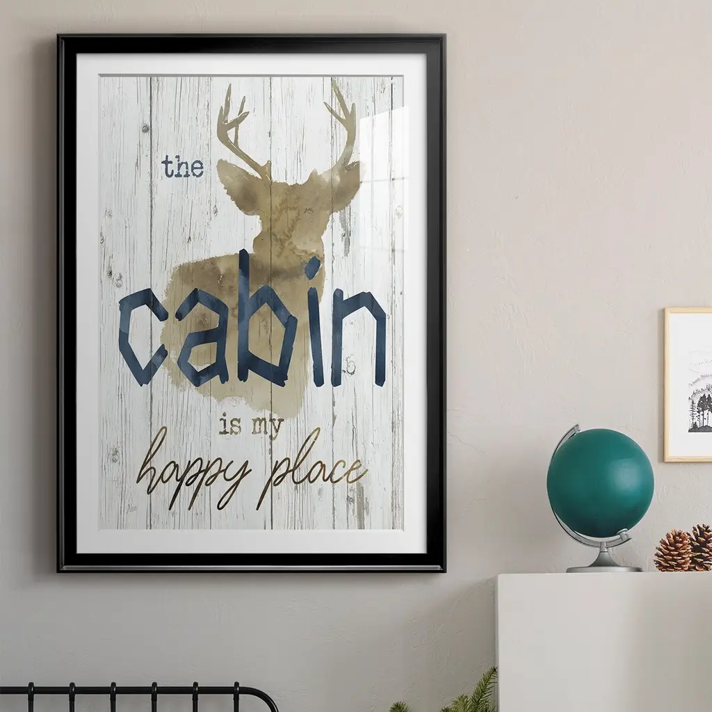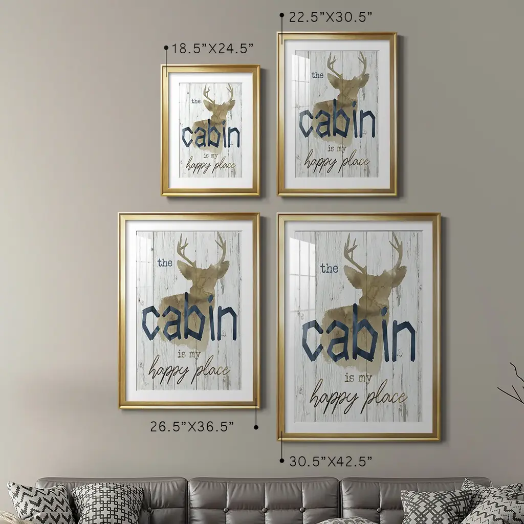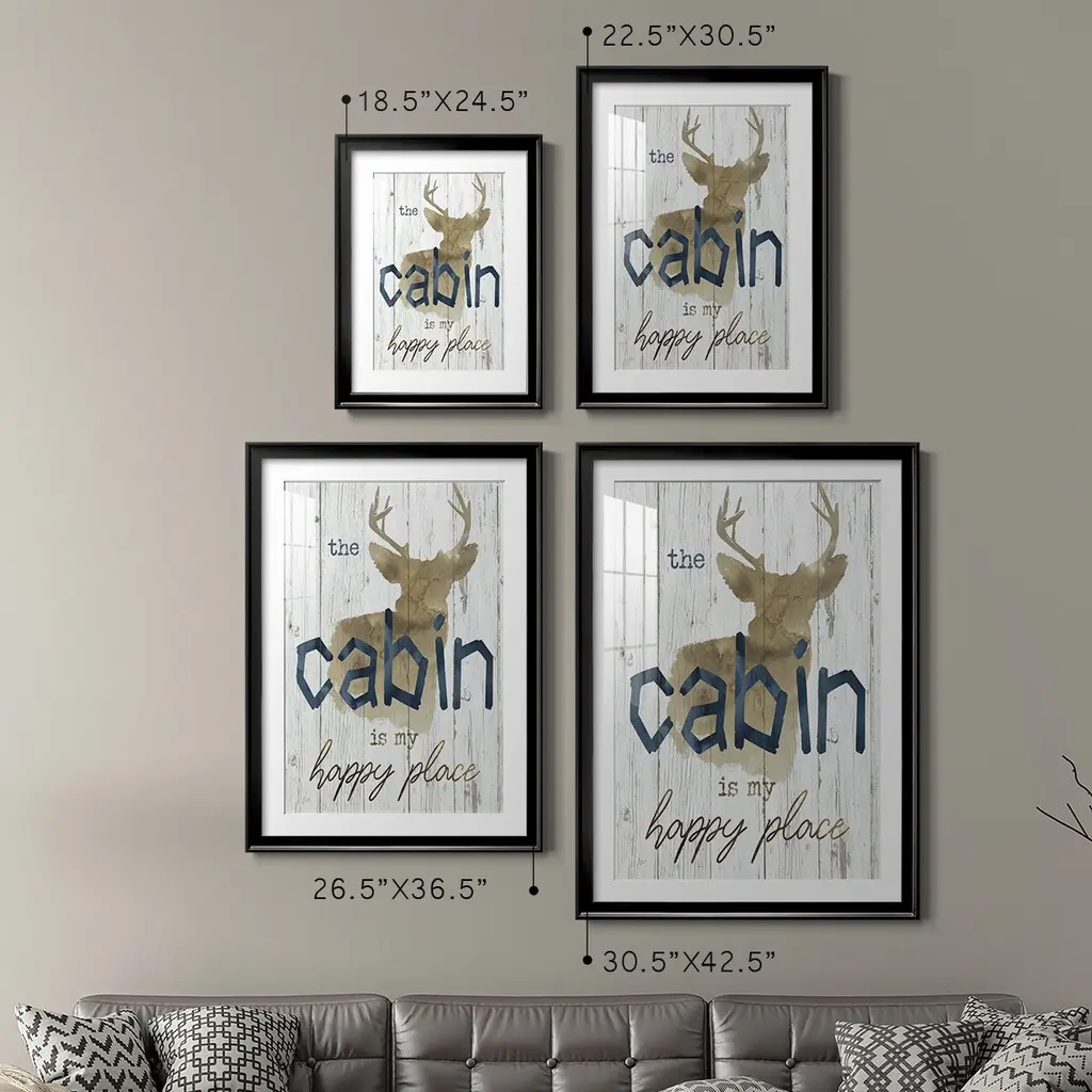 Happy Place Cabin Premium Framed Print - Ready to Hang A Premium Framed Print created to last. Framed in distressed wood and available in an array of sizes and colors Featuring a beveled a solid wood stretcher bar, each piece comes ready to hand 4 SIZES AVAILABLE 30.5''X42.5'' - Overall Size 26.5'X36.5'' - Overall Size 22.5''x30.5'' - Overall Size 18.5''x24.5'' - Overall Size Each piece is made to order. Each piece comes with hanging hardware. Made in the USA Ready to Hang Giclee Paper Print Acrylic Glass Beveled Matt Board