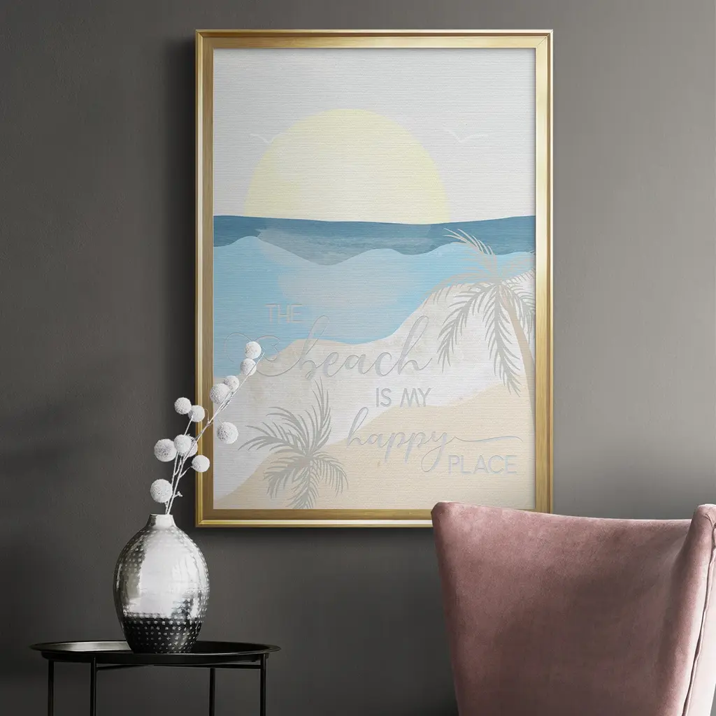 Happy Place Premium Framed Print - Ready to Hang A Premium Framed Print created to last. Framed in distressed wood and available in an array of sizes and colors Featuring a beveled a solid wood stretcher bar, each piece comes ready to hand 4 SIZES AVAILABLE 30.5''X42.5'' - Overall Size 26.5'X36.5'' - Overall Size 22.5''x30.5'' - Overall Size 18.5''x24.5'' - Overall Size Each piece is made to order. Each piece comes with hanging hardware. Made in the USA Ready to Hang