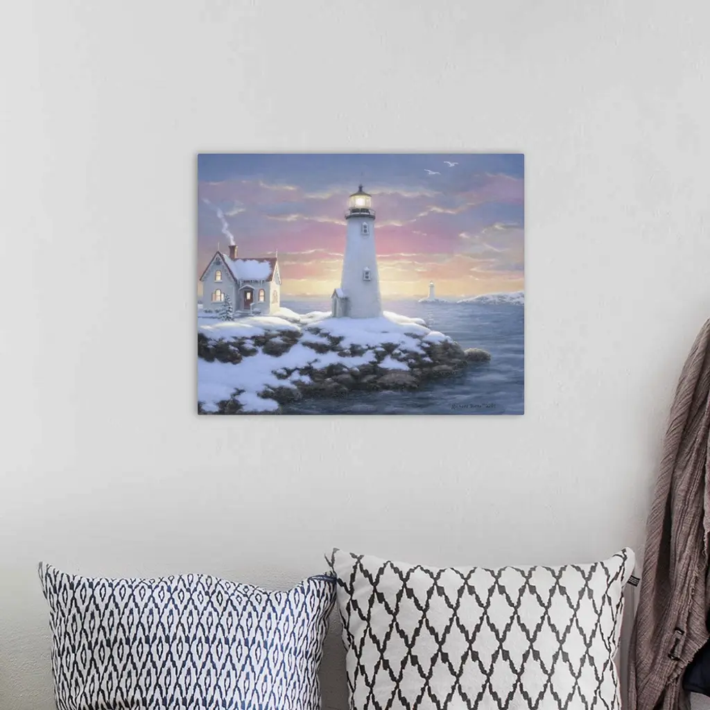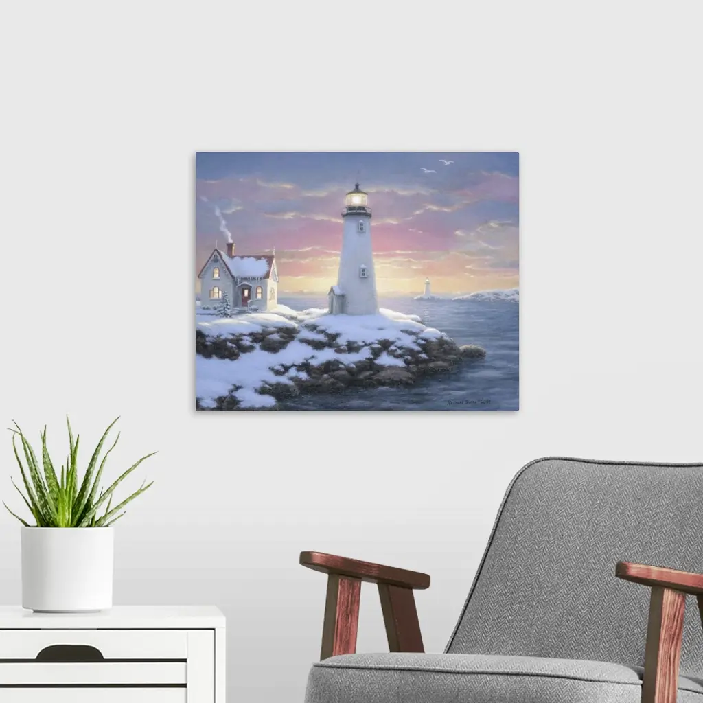 Contemporary painting of seaside cottage and lighthouse in winter.