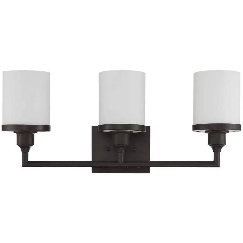 A tastefully finished traditional design, the Minka-Lavery Harbour Point Vanity Light is a welcoming beacon of style. Cylindrical Etched Opal glass shades are mounted on tiered supports, which are in turn affixed to a similarly tiered wall plate via a single straight arm. Uncluttered and robust, this fixture may be installed with the shades facing up or down to suit any vanity.