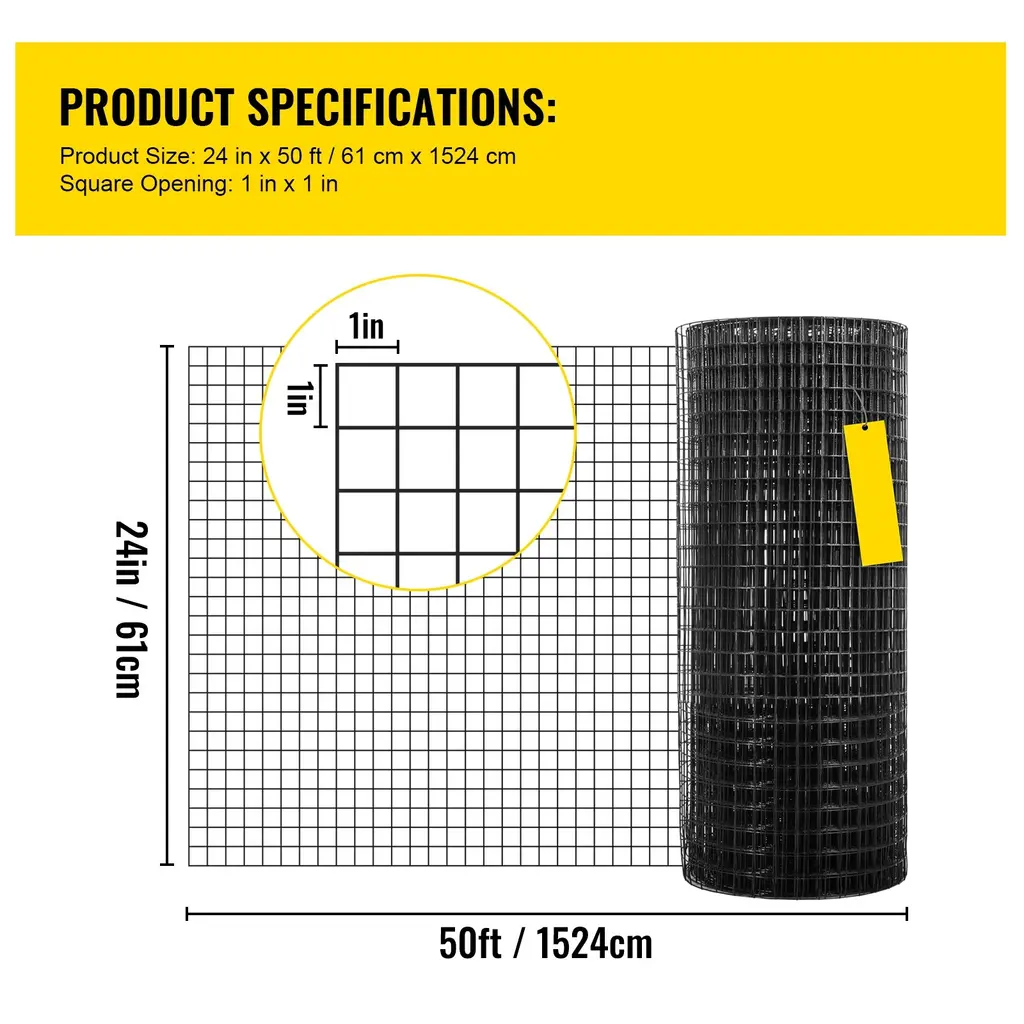 Vinyl-coated Galvanized Steel: Our hardware cloth is made of durable steel. Galvanization and a black vinyl coating provide maximum rust & corrosion resistance, and high ductility. The premium material also ensures ultimate longevity. 1 inch Square Mesh: With 1-inch mesh, this welded wire can effectively keep small critters out to protect your garden or farmed animals. Moreover, the 24" x 50'/ 24" x 100'/36" x 50'/48" x 50' size 16 gauge wire is big enough to fit most sizes of animal cages and garden fences. Firm Welding Structure: Different from other products, our mesh hardware cloth is welded at every point, so it will not break off. What's more, the welding structure is extremely sturdy, and damage from repeated use is not a problem. Easy Use: Although the black vinyl coated mesh has a sturdy structure, it is still flexible enough to conform to any desired shape, such as a tree guard, and can be cut with included wire cutters. Note: you should wear gloves included to use the mesh. Flexible Usage: The vinyl-coated welded wire roll can be unfolded quickly. Suitable for animal cage net mesh, fence, wall decorations, vegetable garden, and other household appliances. Package Content 1 x Hardware Cloth 1 x Wire-cutter 1 x Fabric Glove