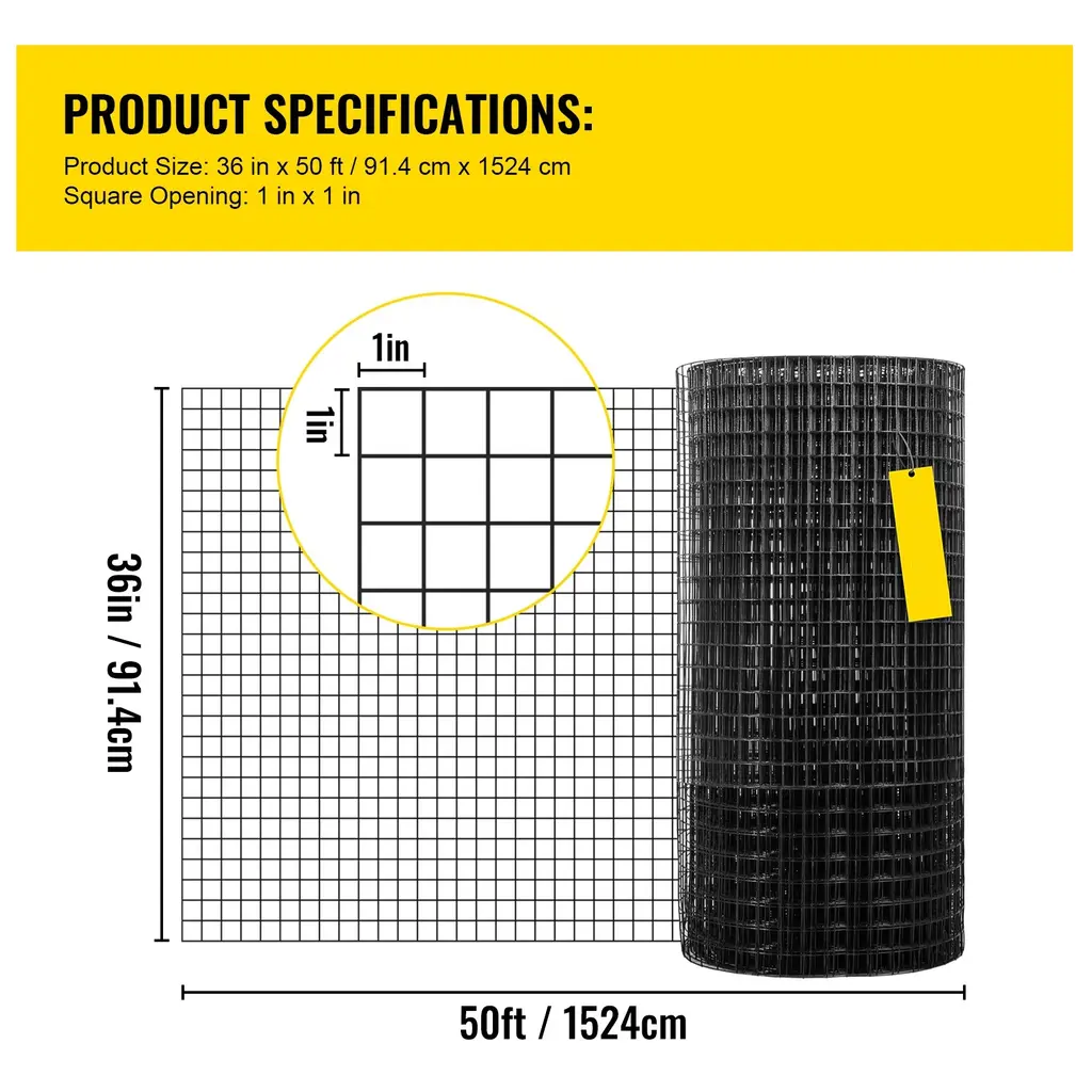 Vinyl-coated Galvanized Steel: Our hardware cloth is made of durable steel. Galvanization and a black vinyl coating provide maximum rust & corrosion resistance, and high ductility. The premium material also ensures ultimate longevity. 1 inch Square Mesh: With 1-inch mesh, this welded wire can effectively keep small critters out to protect your garden or farmed animals. Moreover, the 24" x 50'/ 24" x 100'/36" x 50'/48" x 50' size 16 gauge wire is big enough to fit most sizes of animal cages and garden fences. Firm Welding Structure: Different from other products, our mesh hardware cloth is welded at every point, so it will not break off. What's more, the welding structure is extremely sturdy, and damage from repeated use is not a problem. Easy Use: Although the black vinyl coated mesh has a sturdy structure, it is still flexible enough to conform to any desired shape, such as a tree guard, and can be cut with included wire cutters. Note: you should wear gloves included to use the mesh. Flexible Usage: The vinyl-coated welded wire roll can be unfolded quickly. Suitable for animal cage net mesh, fence, wall decorations, vegetable garden, and other household appliances. Package Content 1 x Hardware Cloth 1 x Wire-cutter 1 x Fabric Glove