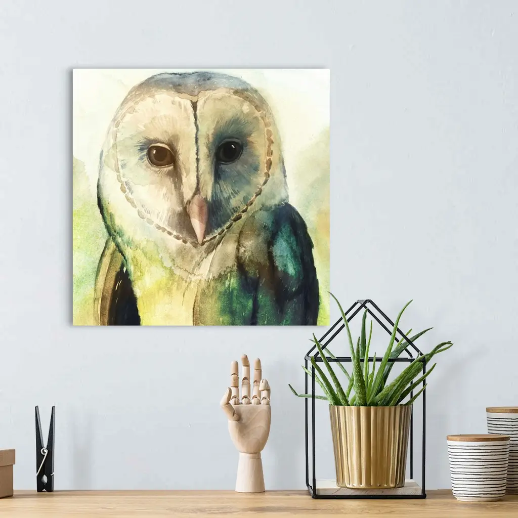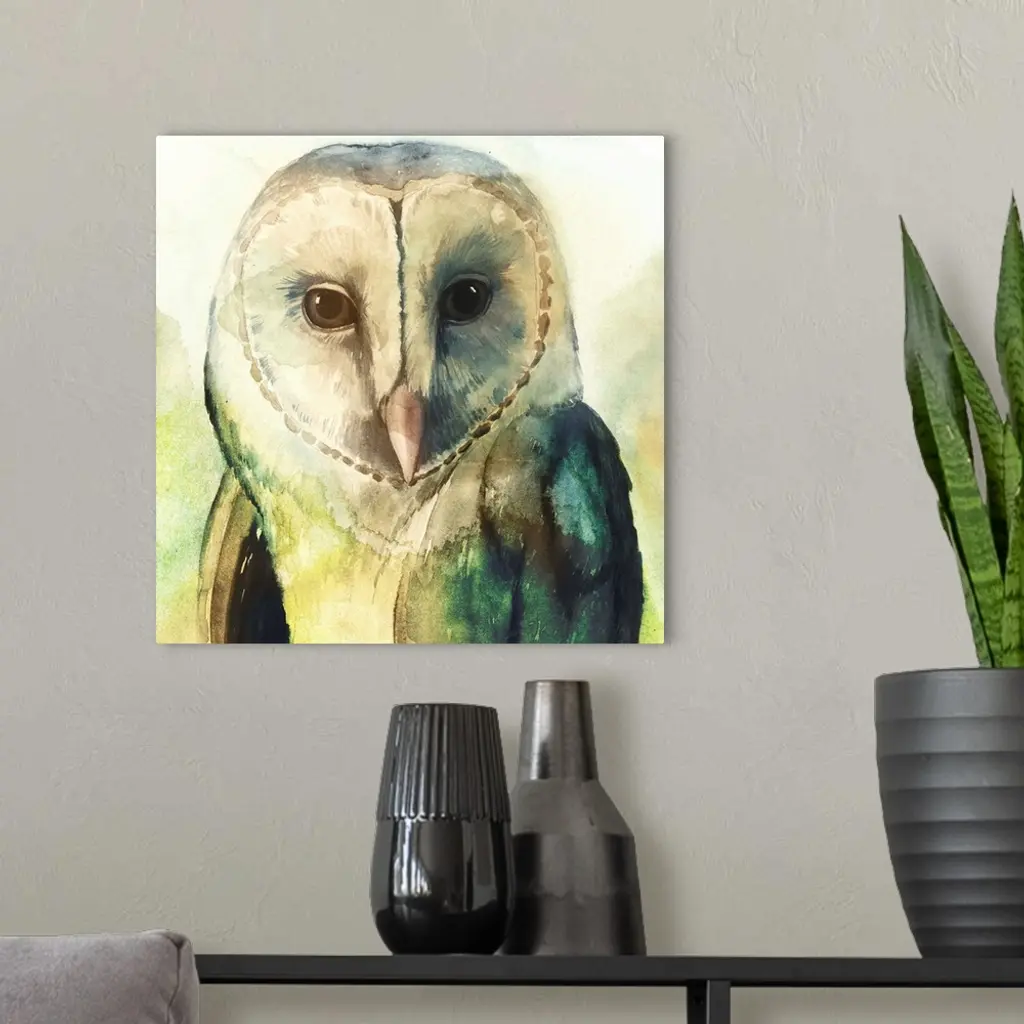 Watercolor painting of a barn owl in pale and vibrant green tones.