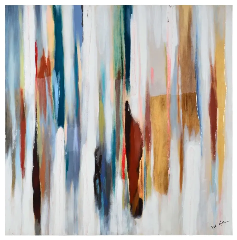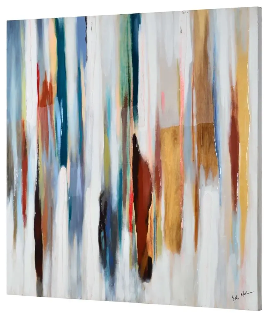 Expressionist gestures take on exuberant tones in this colorfully contemporary wall decoration. The interpretive composition on composite wood elevates the abstract art form, as hand-painted strokes of red, blue, brown and green converse with splashes of white. The textural drama is heightened by gel accents and a glossy finish that give this modern art piece a lingering luster.Hardware Included: Yes