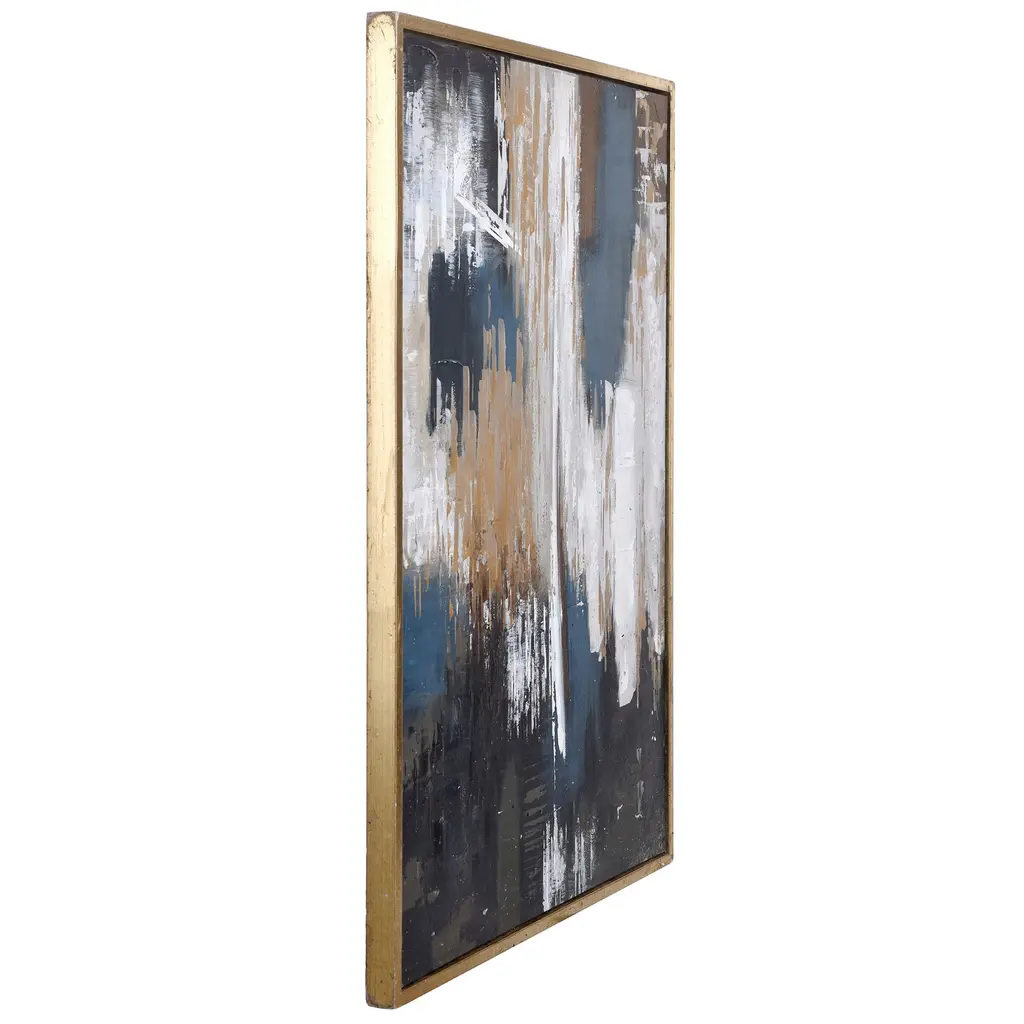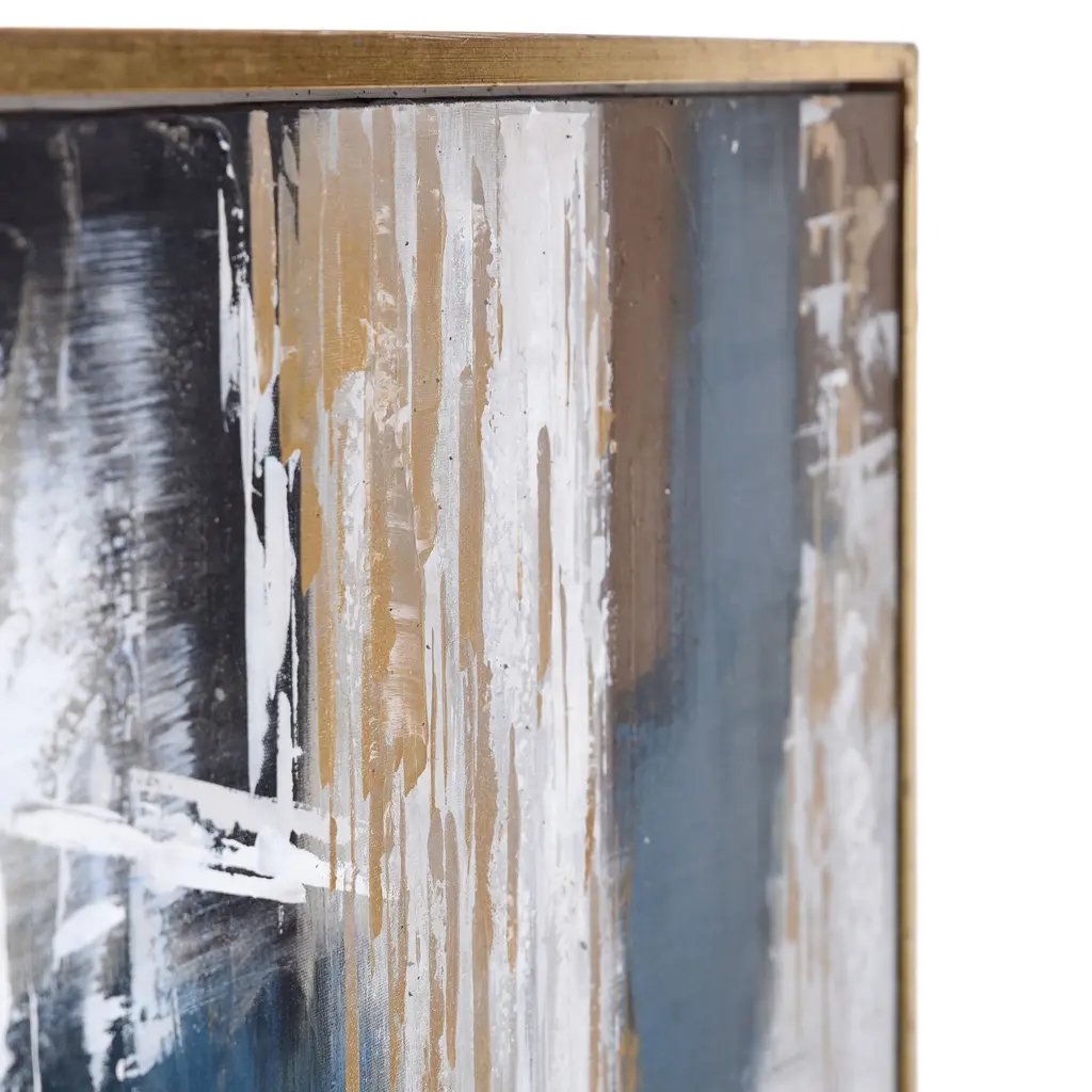 The Apollo Framed Canvas Art is at once cool and powerful, neutral and glamorous. It features dynamic splashes of blue, black and gray, punctuated by metallic flashes of gold. As this piece was hand painted onto canvas, no two can be exactly alike.