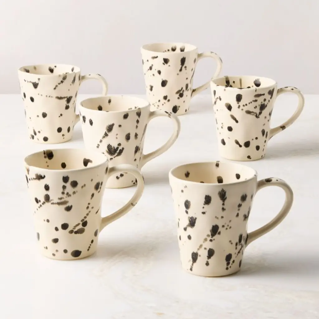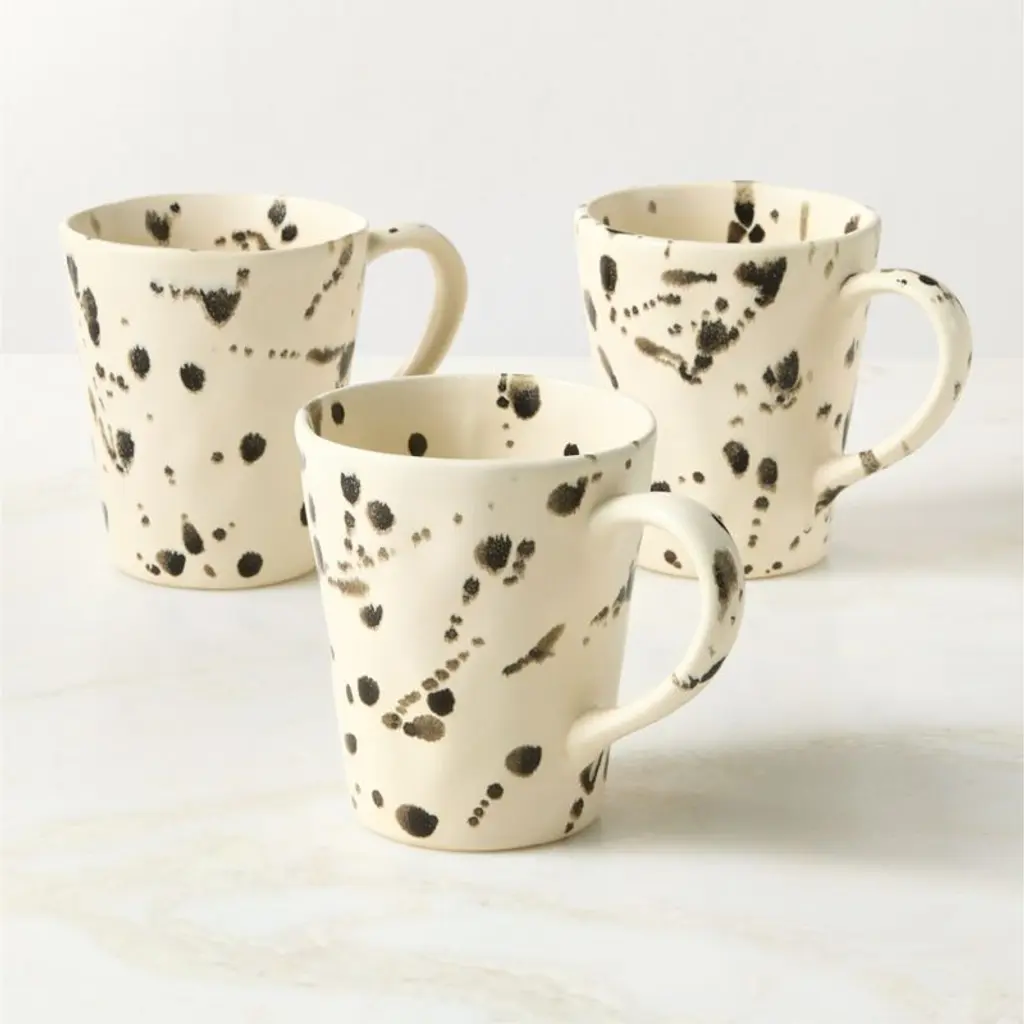 Hand-glazed in Portugal, stoneware mug is inspired by abstract drip paintings. Skilled Portuguese artisans press each piece into a mold before coating the durable stoneware in a matte ivory reactive glaze. Then, they apply a dark glaze, creating drips that are unique to each piece. CB2 exclusive.