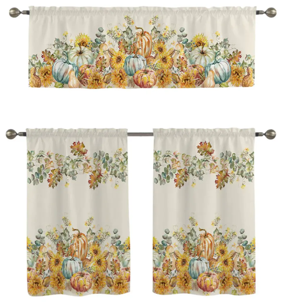The "Harvest Sun" kitchen tier set showcases autumn floral at its finest. Orange and teal pumpkins, giant sunflowers, and fall foliage come together in a colorful watercolor design. A cream background provides the perfect neutral setting. It''s just the festive touch you''ve been looking for. Artwork by Tre Sorelle Studios, Presented by Laural Home®