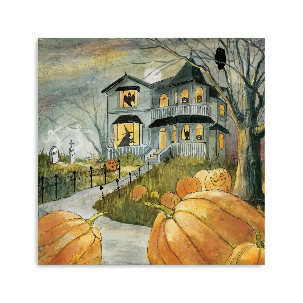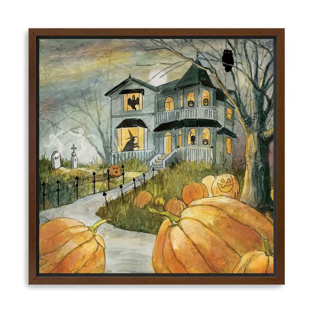 This eerie haunted house canvas captures the spirit of Halloween with shadowy silhouettes and glowing orange windows. Rich hues of midnight blue, charcoal, and pumpkin spice create a chilling yet captivating focal point for your seasonal decor. Our Gallery Wrap Canvas Prints are proudly assembled with high quality materials in California, USA. Each piece is printed on a thick, archival grade canvas using Giclee technology. It is then hand-stretched by our experienced artisans over solid wood bars, which will not warp over time. The final product is a piece personally crafted for you to confidently display on your wall. Care and Assembly: Ensure that the location of your piece has little to no exposure to heat, sunlight, and moisture. Wipe clean, only if needed. Each piece includes hanging hardware to hang on your wall horizontally.