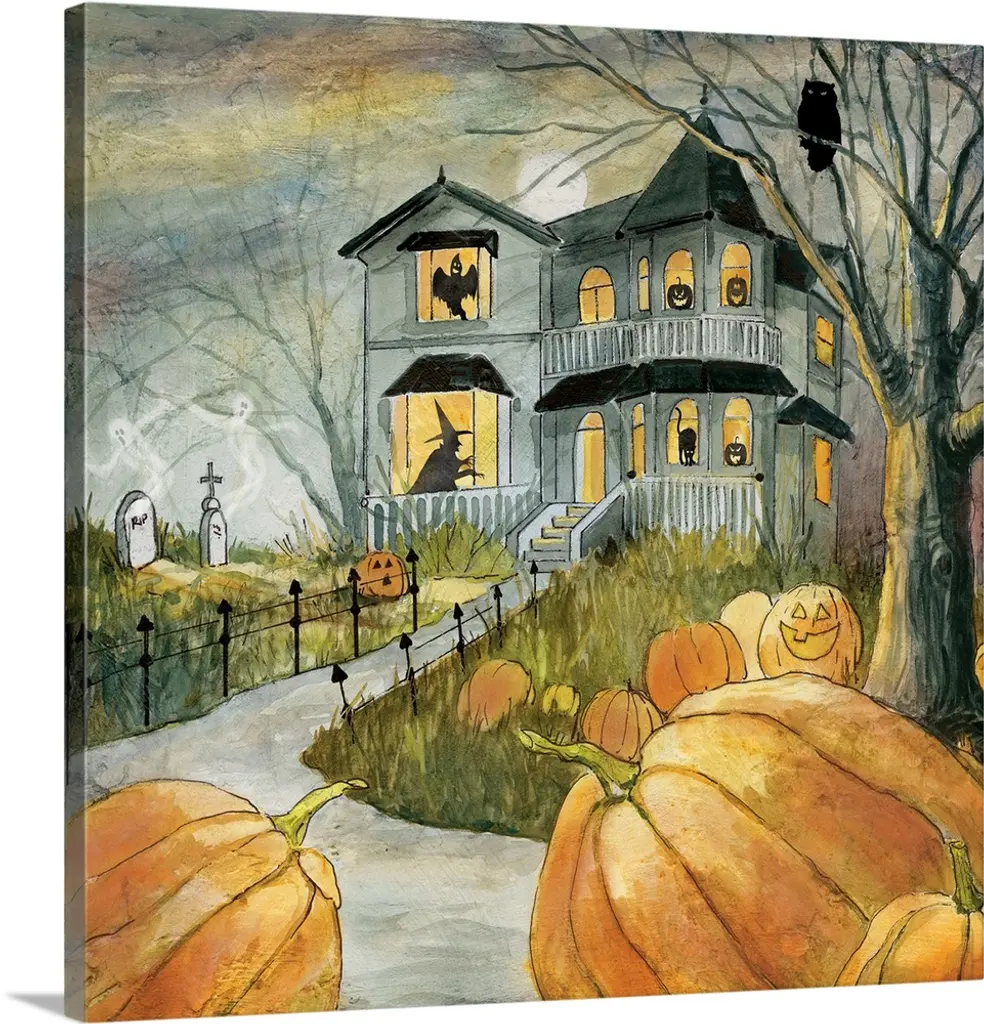 This eerie haunted house canvas captures the spirit of Halloween with shadowy silhouettes and glowing orange windows. Rich hues of midnight blue, charcoal, and pumpkin spice create a chilling yet captivating focal point for your seasonal decor. Our Gallery Wrap Canvas Prints are proudly assembled with high quality materials in California, USA. Each piece is printed on a thick, archival grade canvas using Giclee technology. It is then hand-stretched by our experienced artisans over solid wood bars, which will not warp over time. The final product is a piece personally crafted for you to confidently display on your wall. Care and Assembly: Ensure that the location of your piece has little to no exposure to heat, sunlight, and moisture. Wipe clean, only if needed. Each piece includes hanging hardware to hang on your wall horizontally.