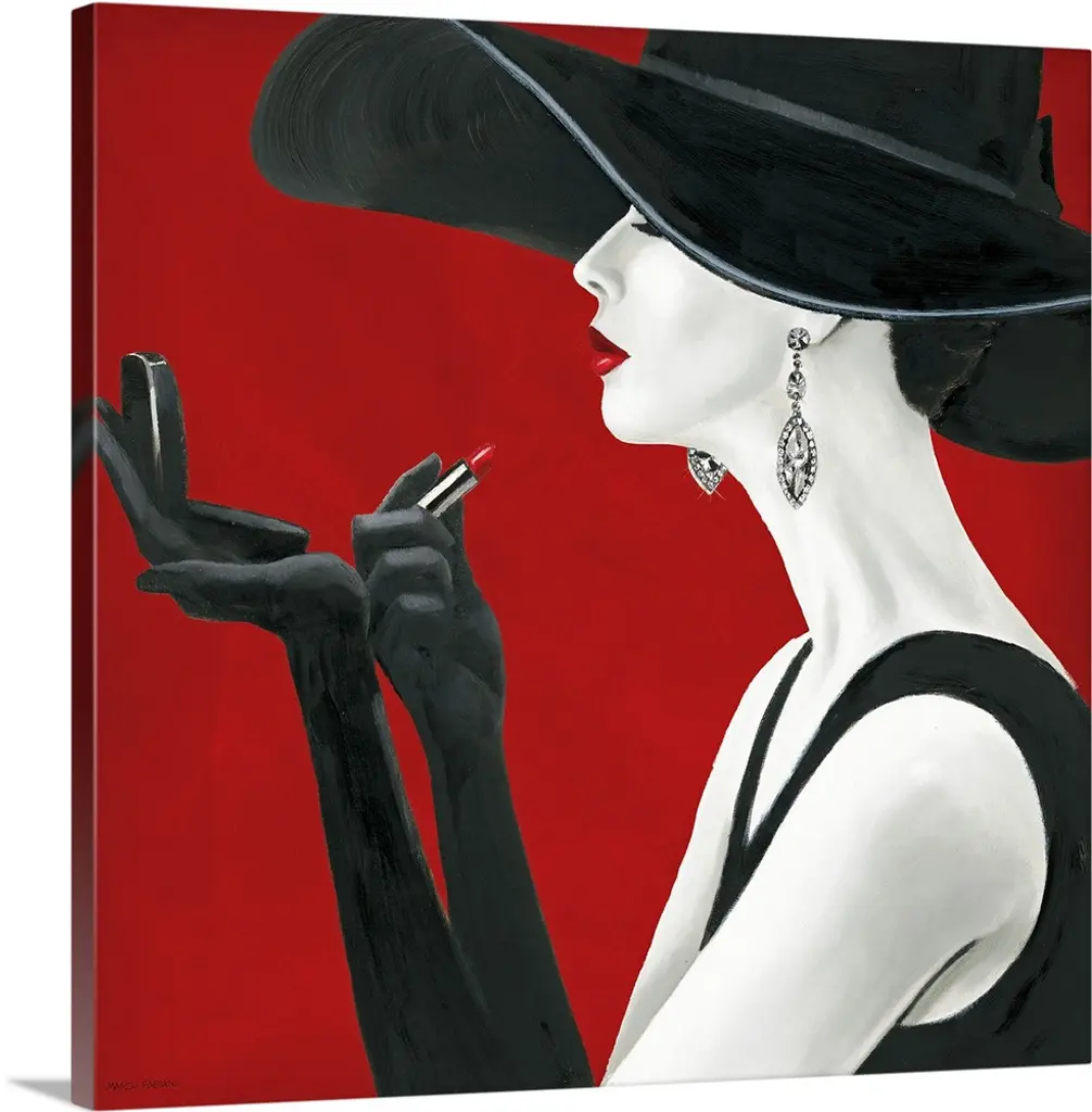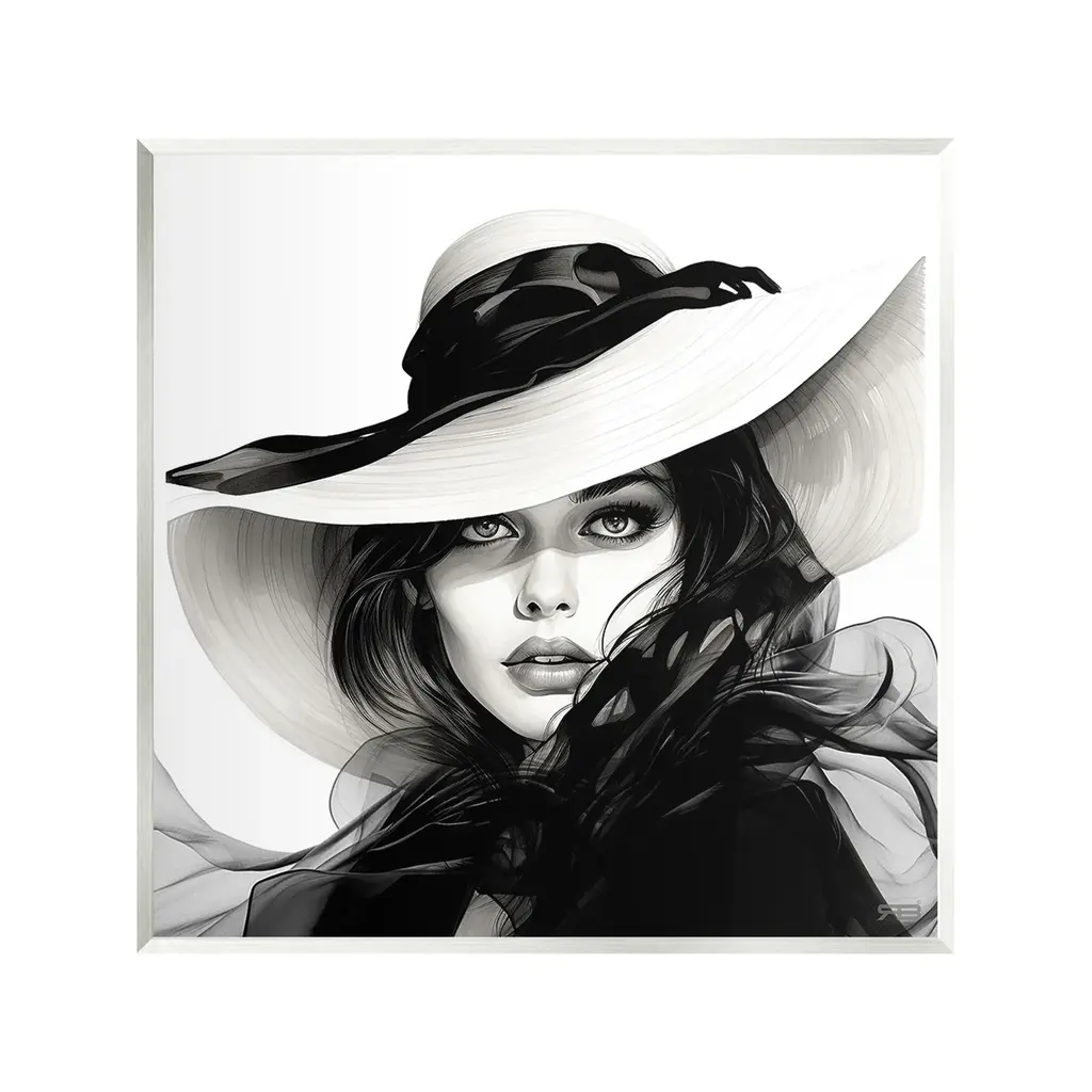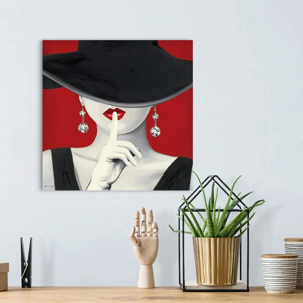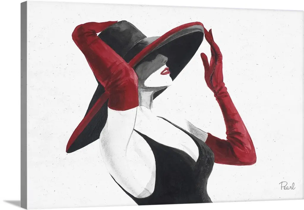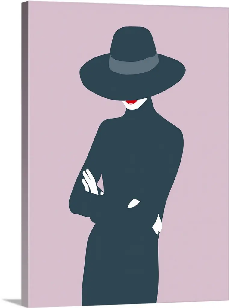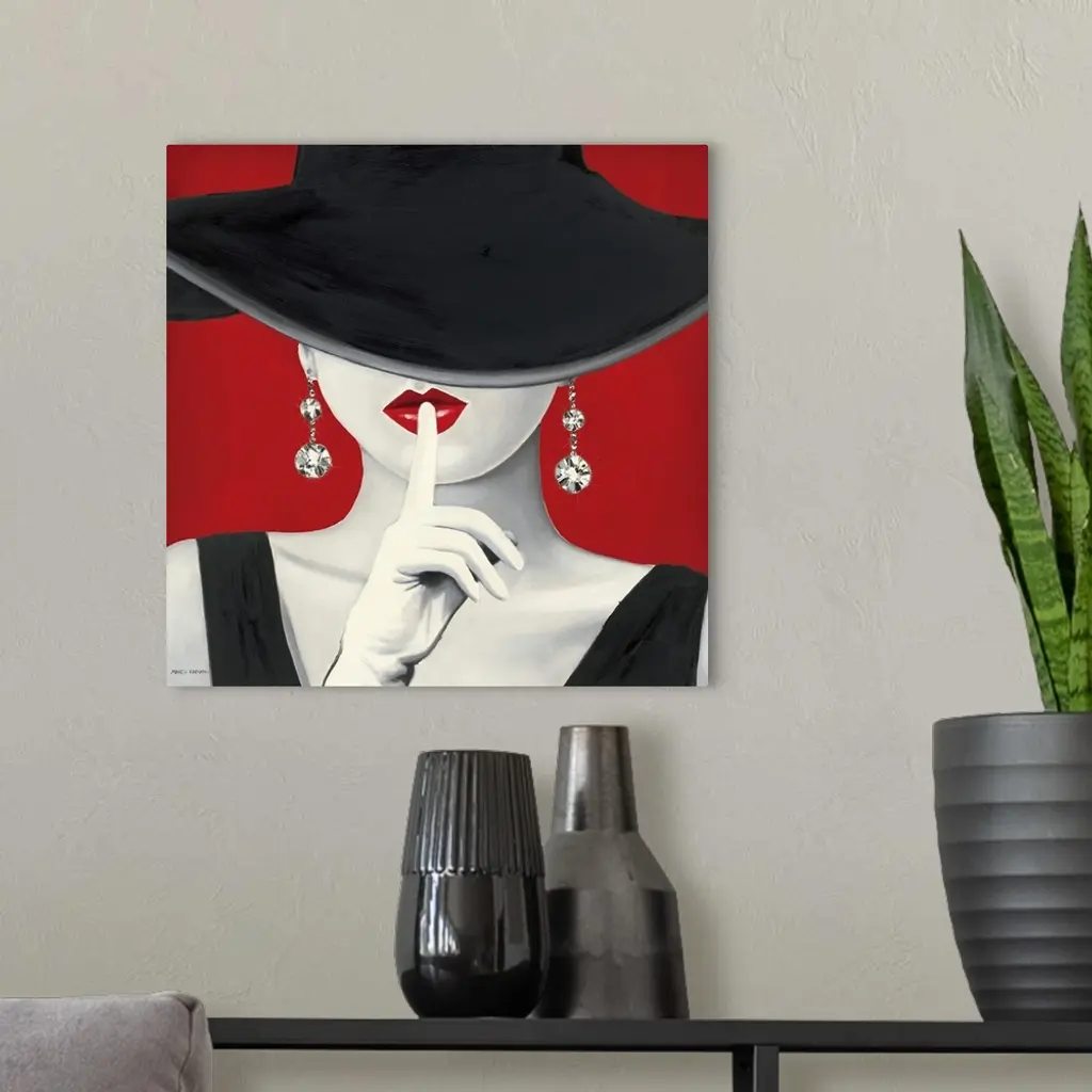 A square painting of a stylish woman in a black dress, her face obstructed by a black hat, white gloves and massive diamond earrings.