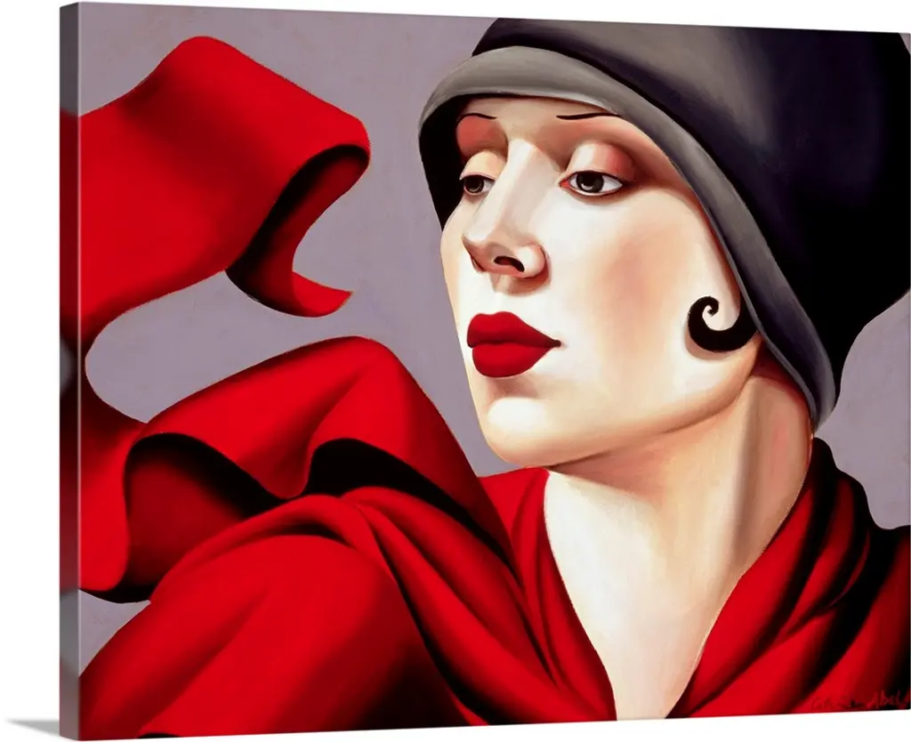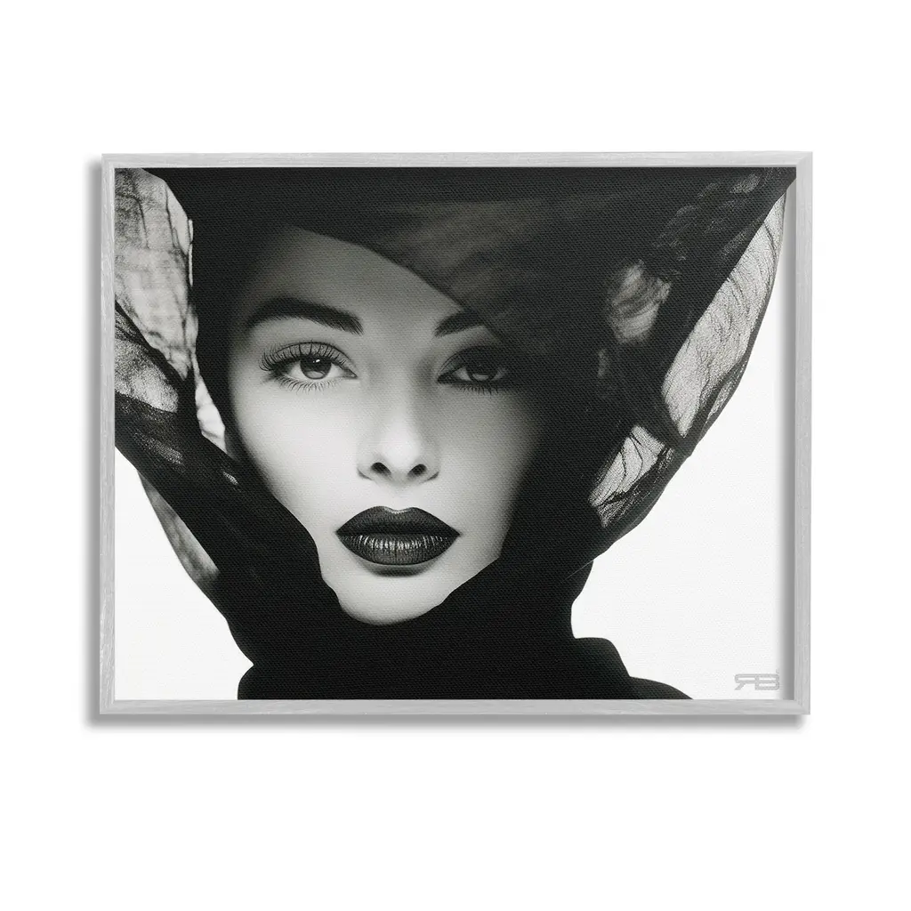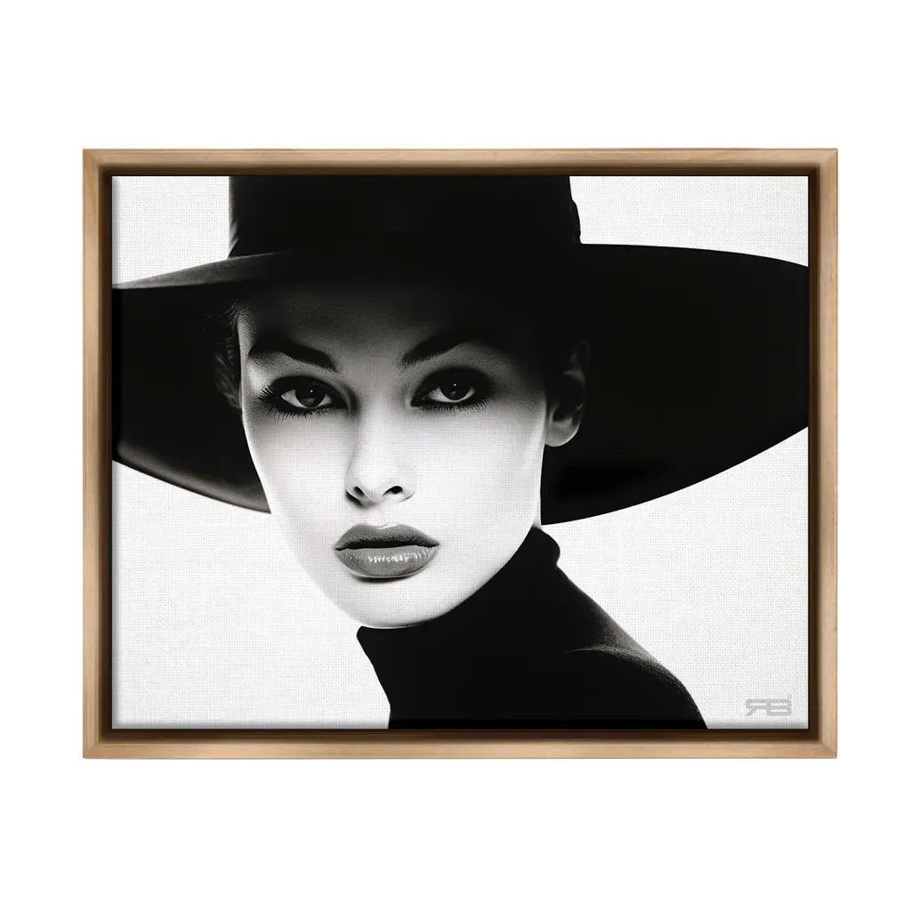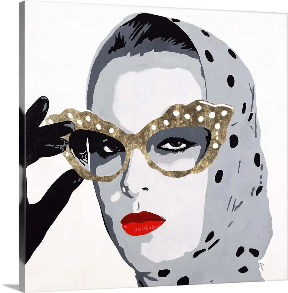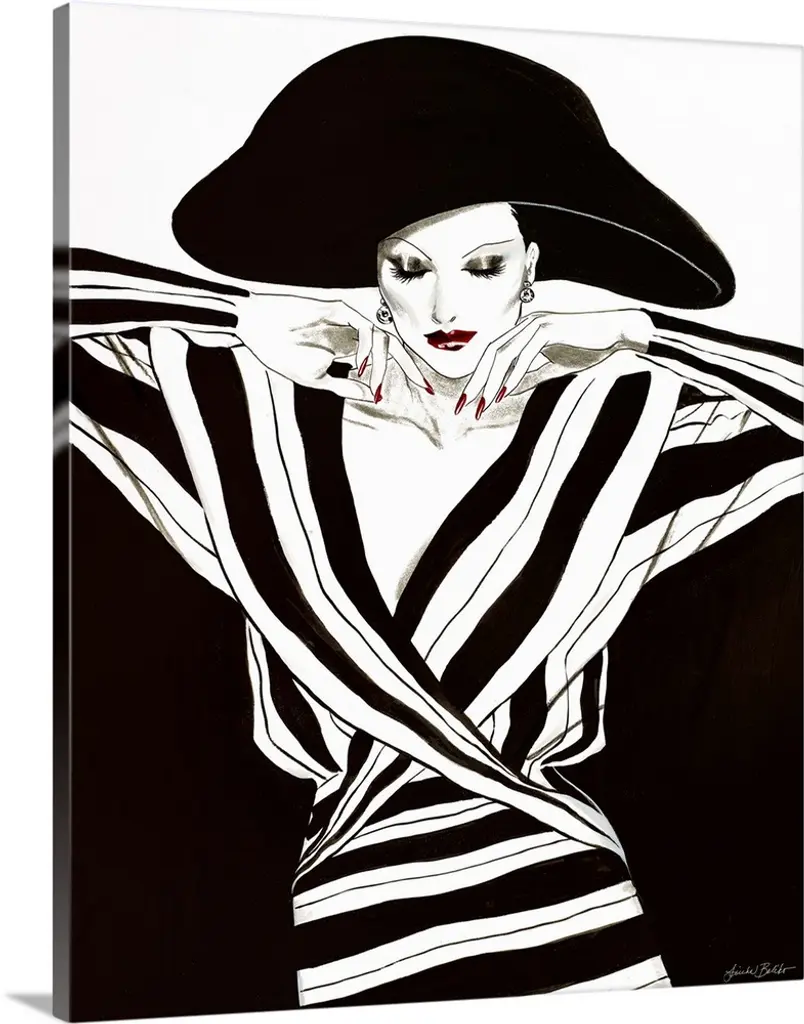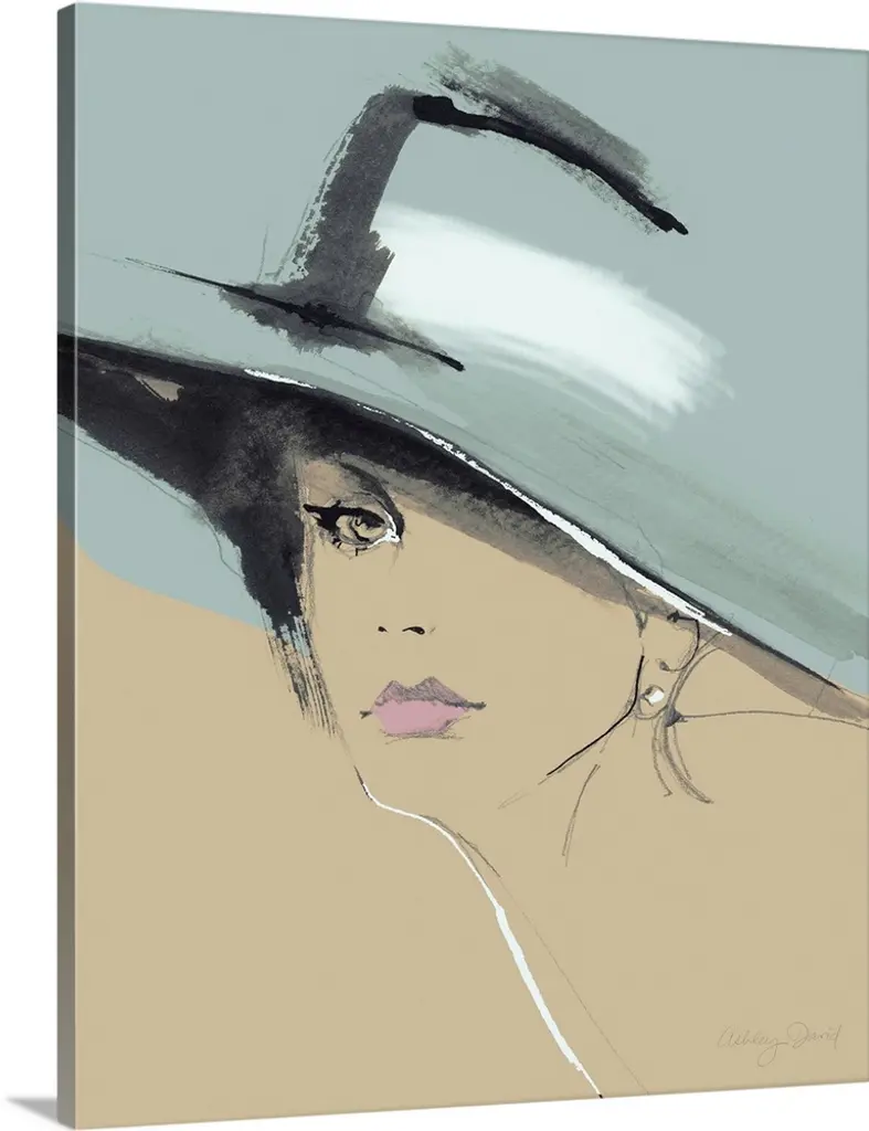 A square painting of a stylish woman in a black dress, her face obstructed by a black hat, white gloves and massive diamond earrings.