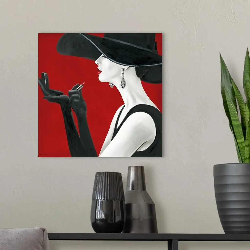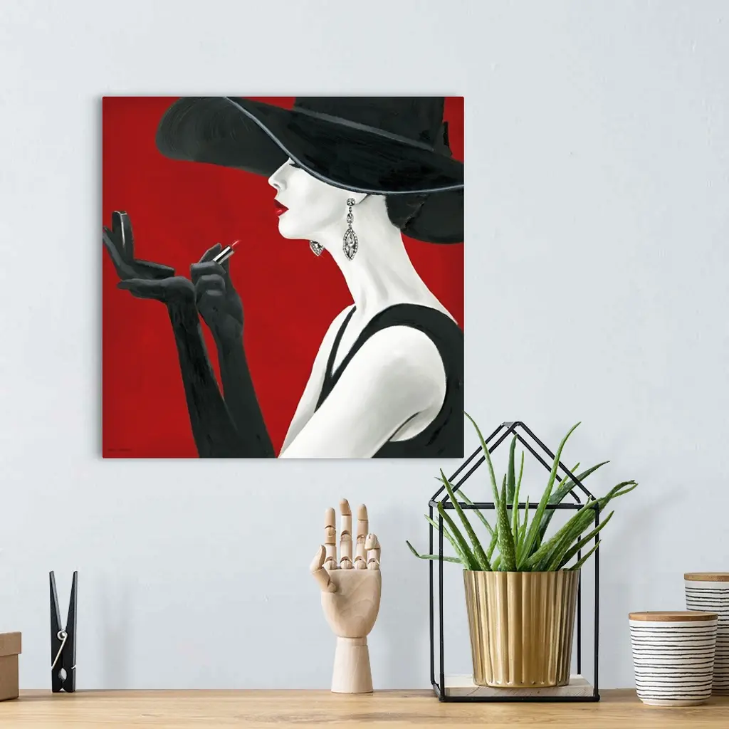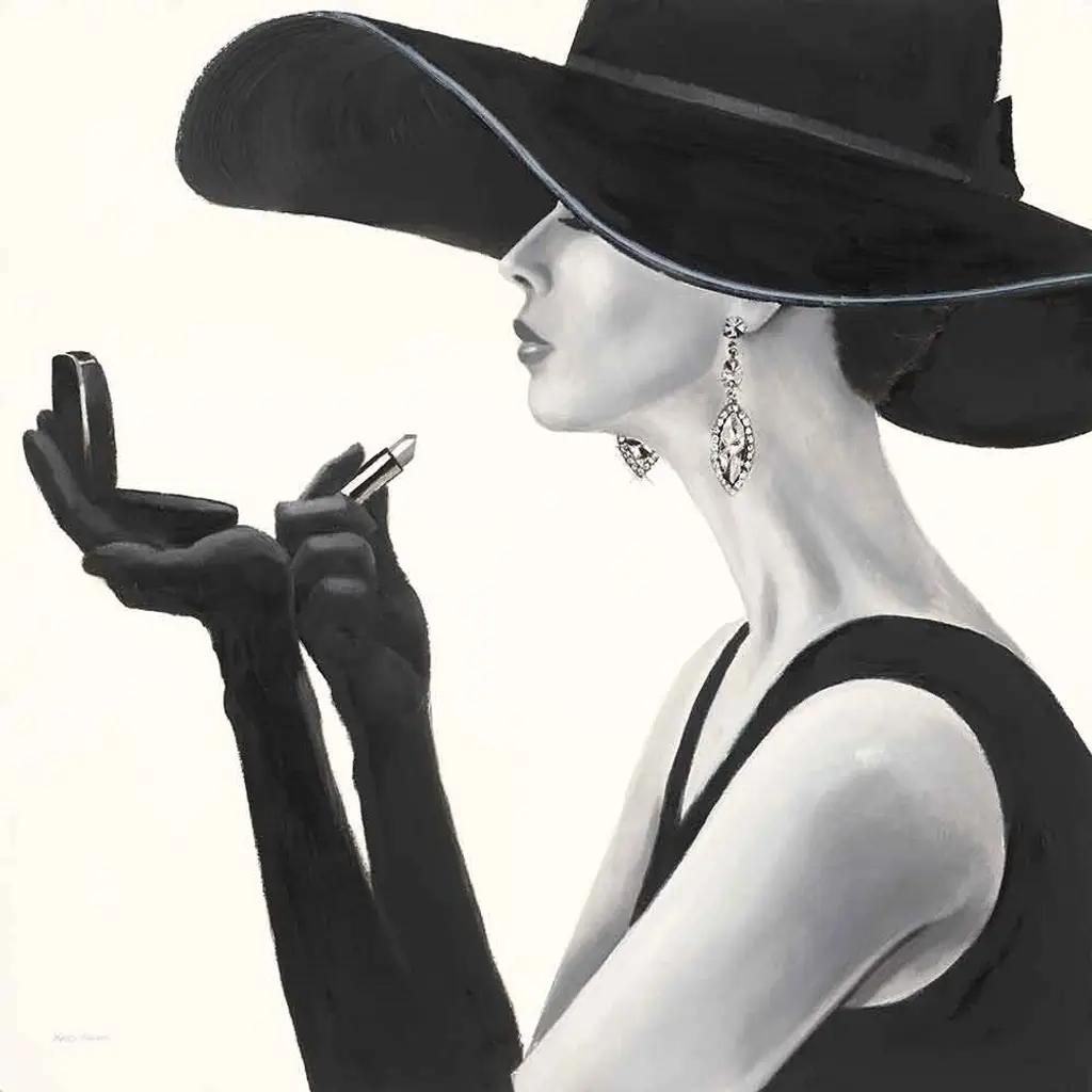 A square painting of a pale woman in profile wearing a black dress, an enormous hat, and elbow length gloves applying lipstick.