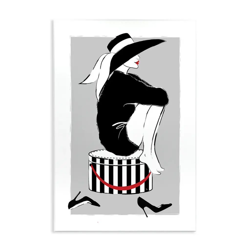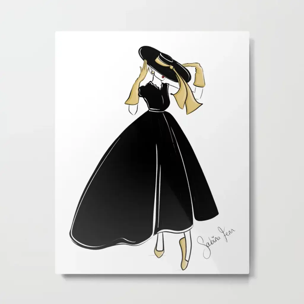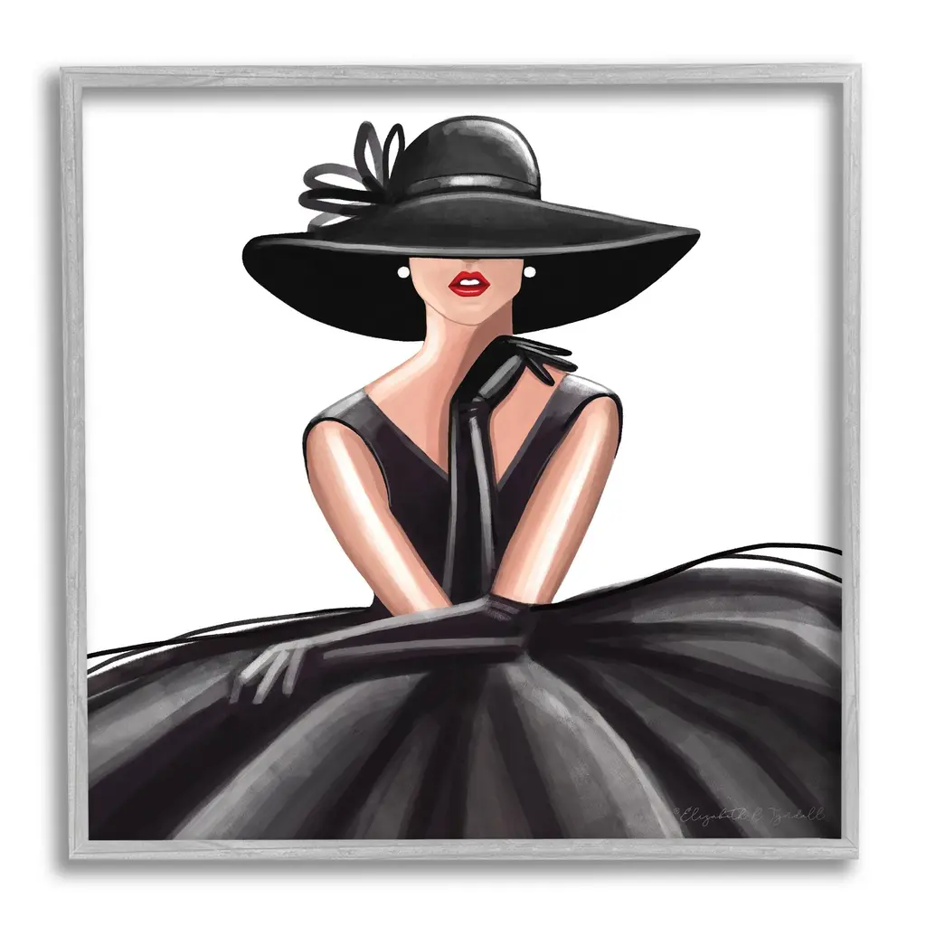A square painting of a pale woman in profile wearing a black dress, an enormous hat, and elbow length gloves applying lipstick.