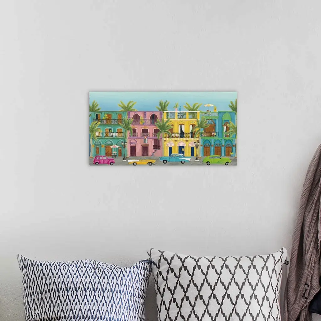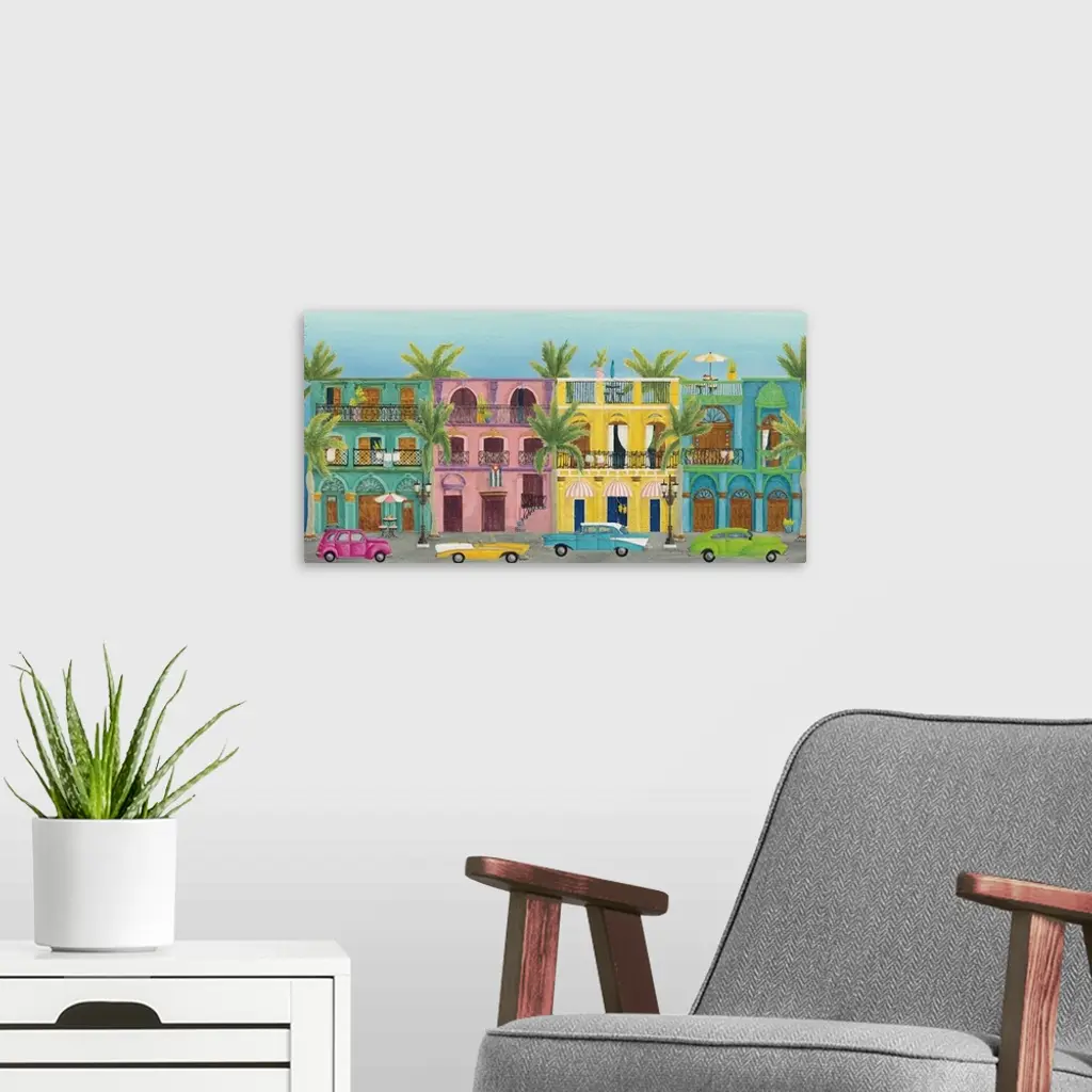 Horizontal contemporary painting of colorful buildings in Havana with vintage cars parked out front.