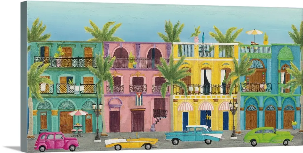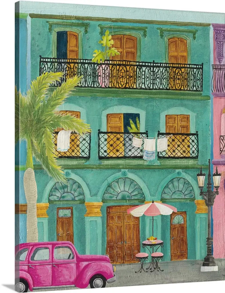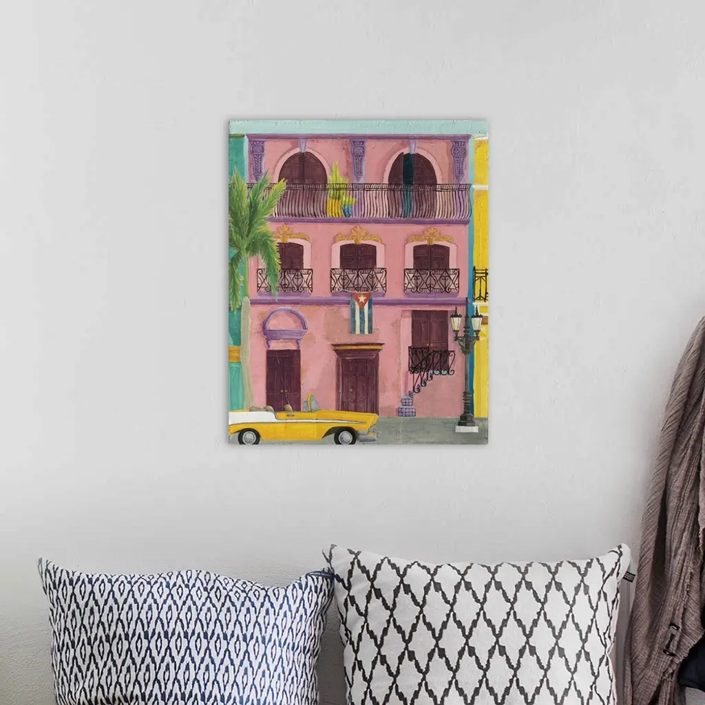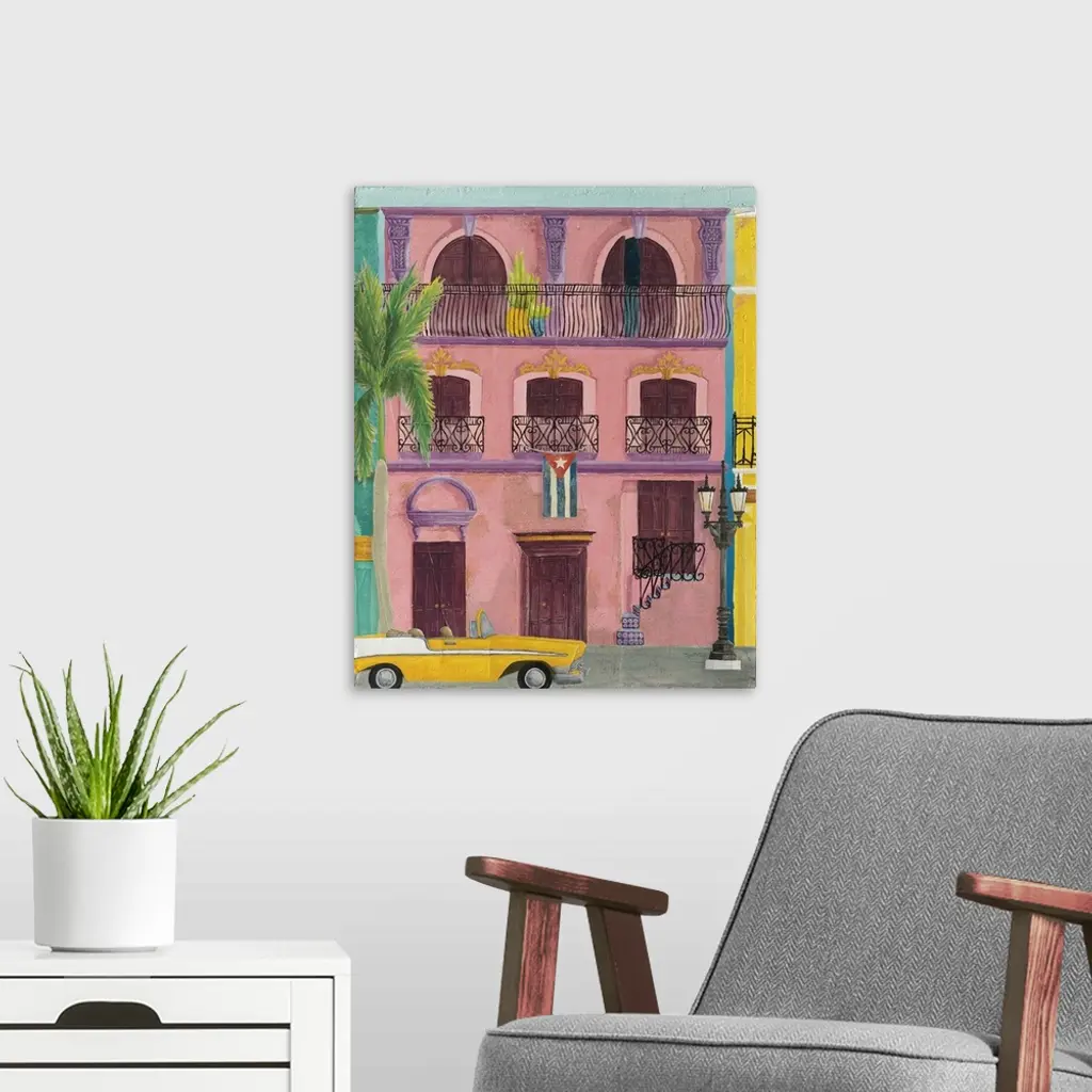 Vertical contemporary painting of a colorful pink building in Havana with a yellow vintage car parked out front.