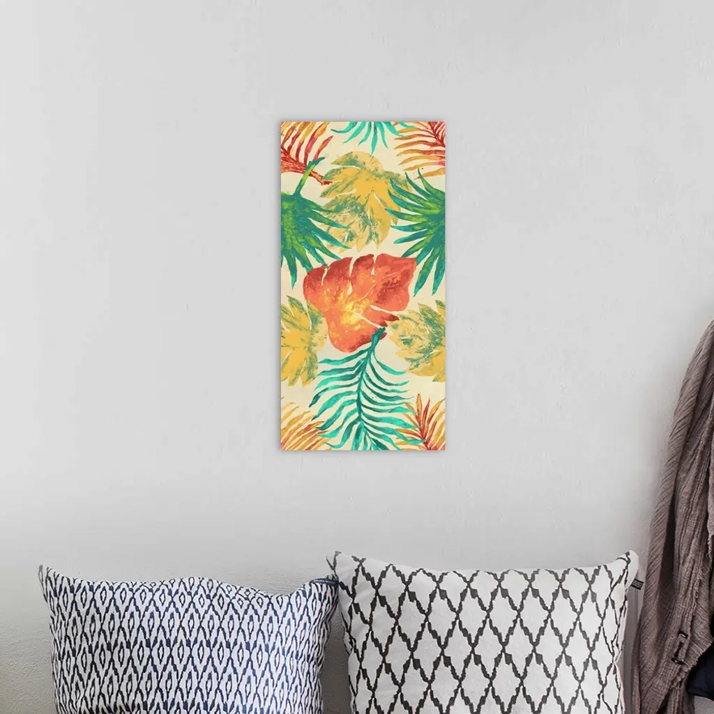 Contemporary painting of a pattern of palm and other tropical leaves in festive teals, greens, oranges, and yellows.