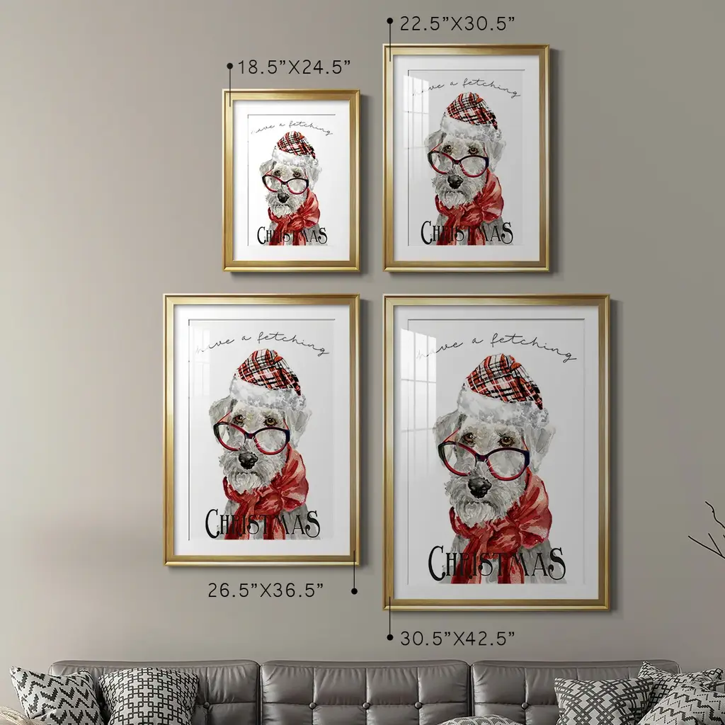 Have a Fetching Christmas Premium Framed Print - Ready to Hang A Premium Framed Print created to last. Framed in distressed wood and available in an array of sizes and colors Featuring a beveled a solid wood stretcher bar, each piece comes ready to hand 4 SIZES AVAILABLE 30.5''X42.5'' - Overall Size 26.5'X36.5'' - Overall Size 22.5''x30.5'' - Overall Size 18.5''x24.5'' - Overall Size Each piece is made to order. Each piece comes with hanging hardware. Made in the USA Ready to Hang Giclee Paper Print Acrylic Glass Beveled Matt Board