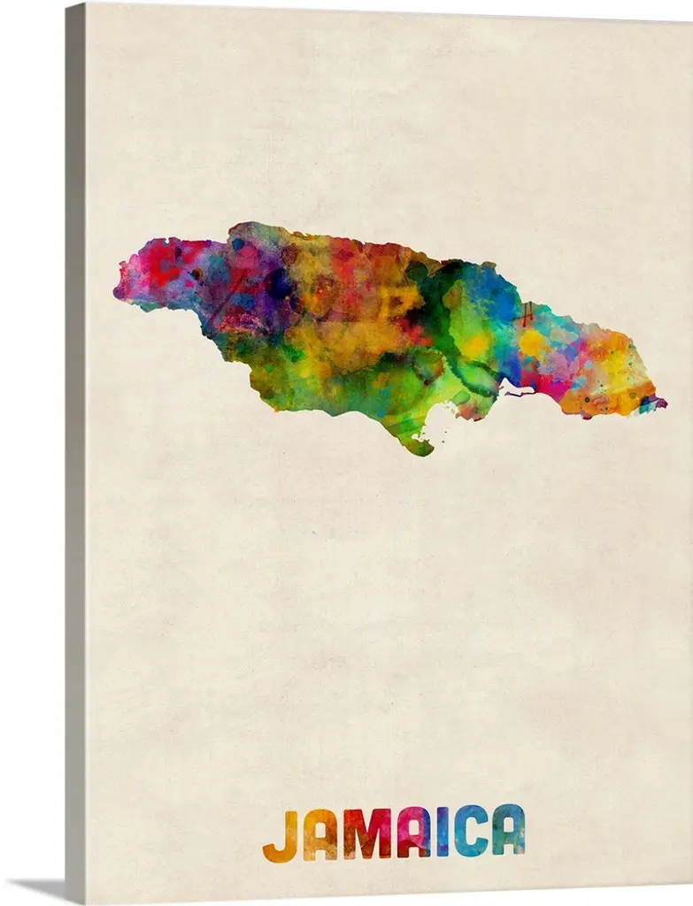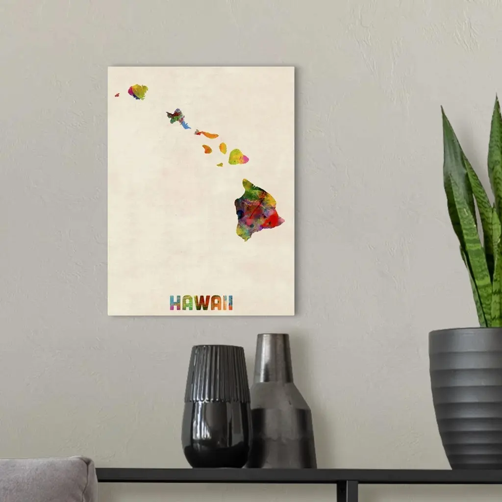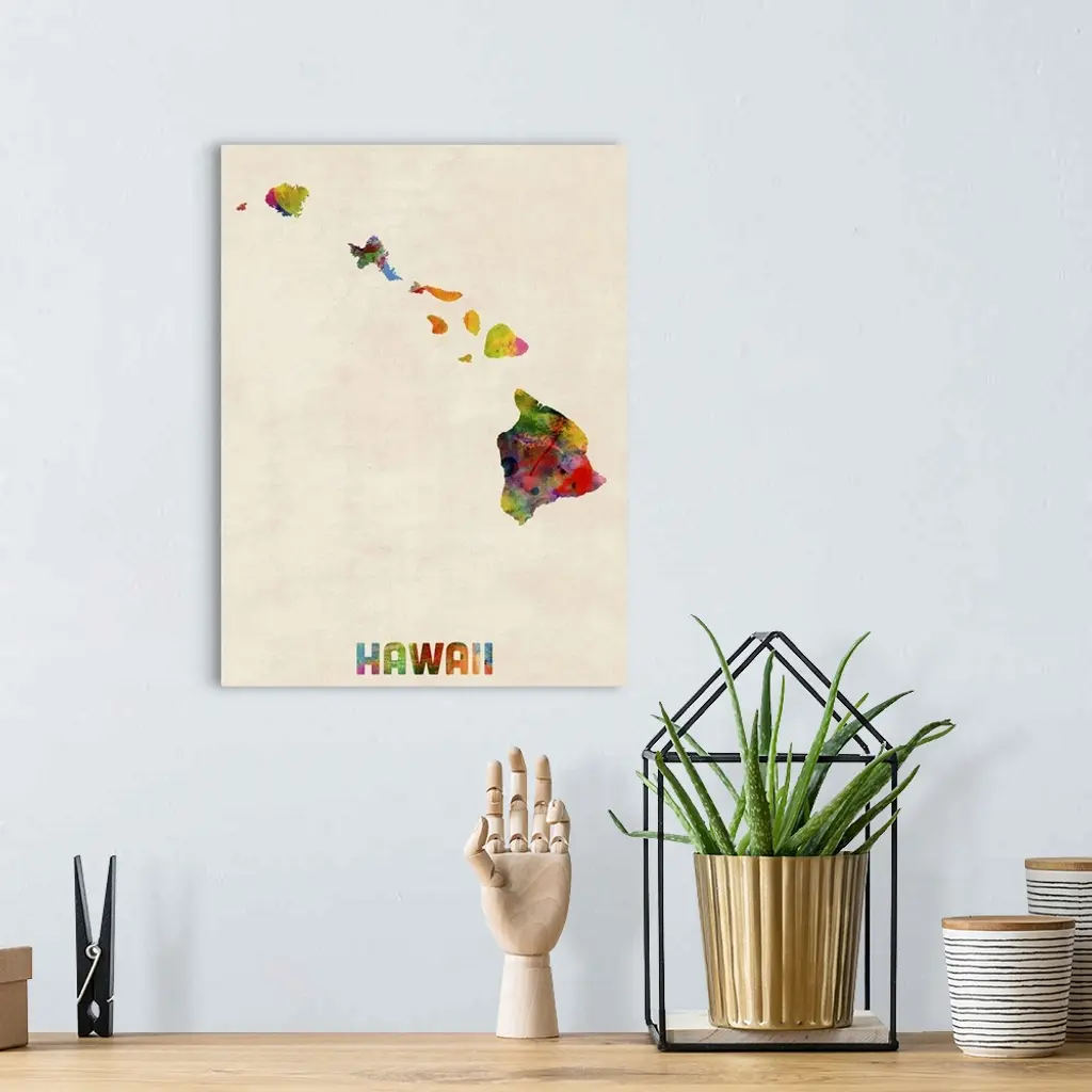 Contemporary piece of artwork of a map of Hawaii made up of watercolor splashes.