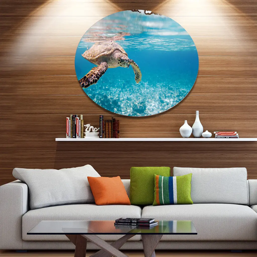 Bring Contemporary Abstraction to your home with this large Circle Metal wall art. This Large Hawksbill Sea Turtle Metal Artwork makes it the focal point of any room or office. - White Gloss Coating ensures colors are extra vibrant with light reflection.- Aluminum grade Sheet Metal with 1 inch mounting frame on the back giving the illusion that the artwork is floating on the wall..- Mounting Brackets are included along with instructions.- High Quality Digital images are created directly into a glossy aluminum panel producing a stunning and captivating print into the glossy finish of the metal.- Water, Fire and Scratch resistant HD Aluminum panels.- Looks better than any photo paper and guaranteed to last at least 20 years- Easy to clean with a microfiber cloth. Colors are far superior to regular Canvas Art. - Easy to Hang