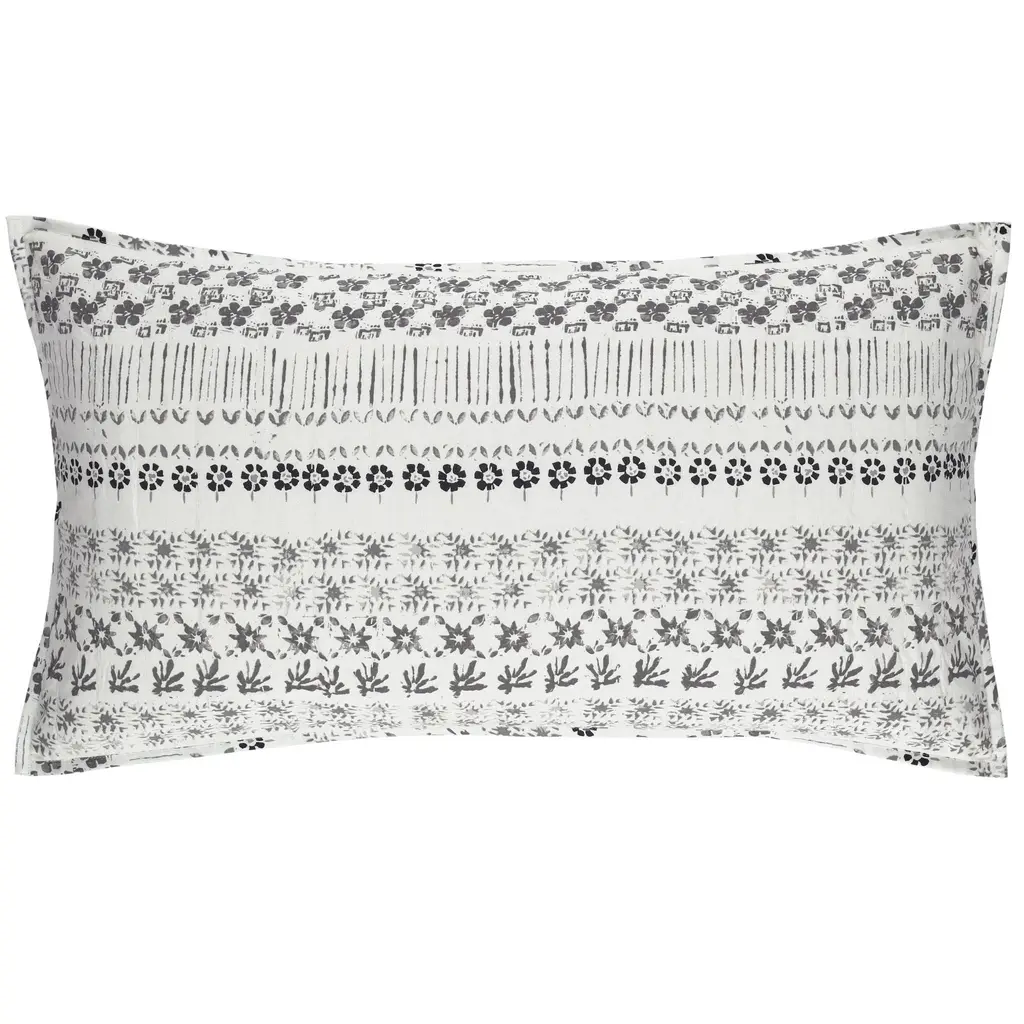 This lightweight 100% cotton quilted sham is adorned with sweet stripes of repeating floral motifs inspired by traditional Indian block prints. Tightly woven and washed down to a buttery-soft feel, digitally printed to reproduce the authentic nature of the artwork, and held together with a light Kantha stitch quilting. In Grey tones of Charcoal, Black, Warm Grey, and Silver on Ivory, it's a perfect layering piece that plays well with neutrals or brights.
